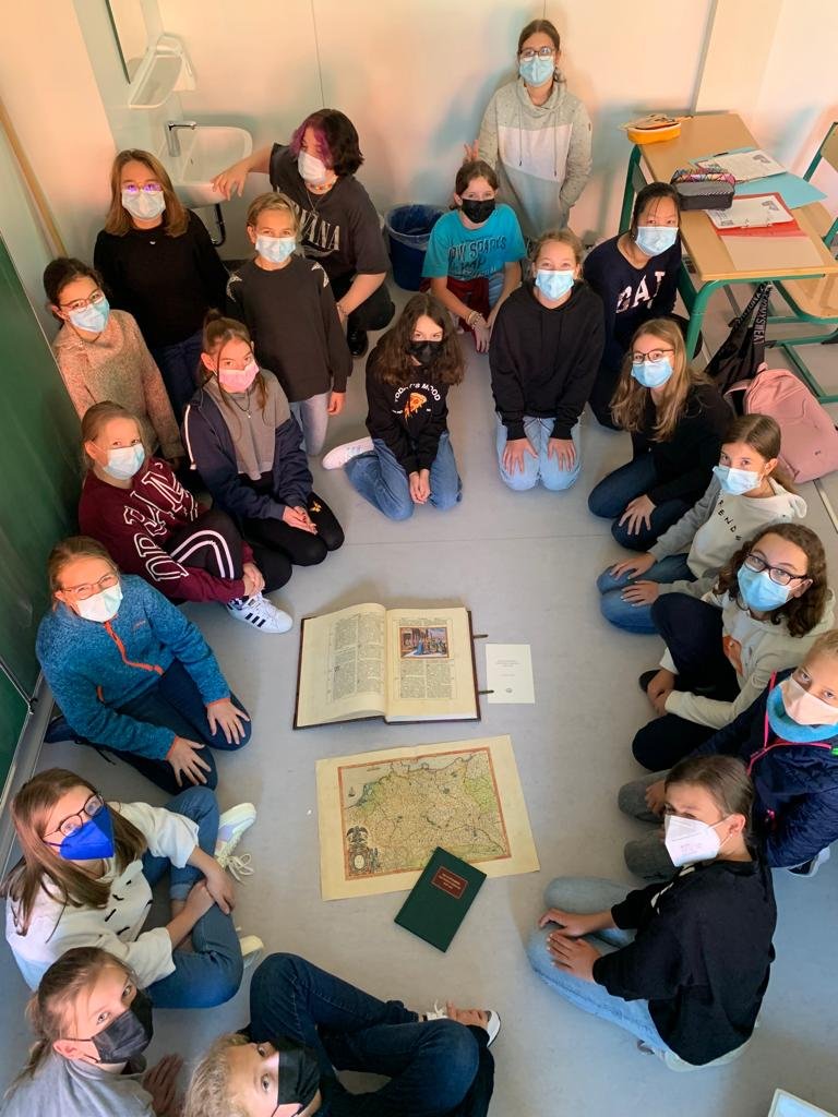 Eine wahre Rarität hatte eine Schülerin der 7.Jahrgangsstufe in die Schule gebracht, als im Kunstunterricht das Thema „Buchmalerei im Mittelalter“ behandelt wurde. Von ihrer Großmutter erhielt sie die Erlaubnis, die Replikation einer Bibel mitzunehmen. Ganz begeistert von den bunten Buchmalereien und der altdeutschen Schrift wurde diese von der Kunstklasse durchgesehen und analysiert.