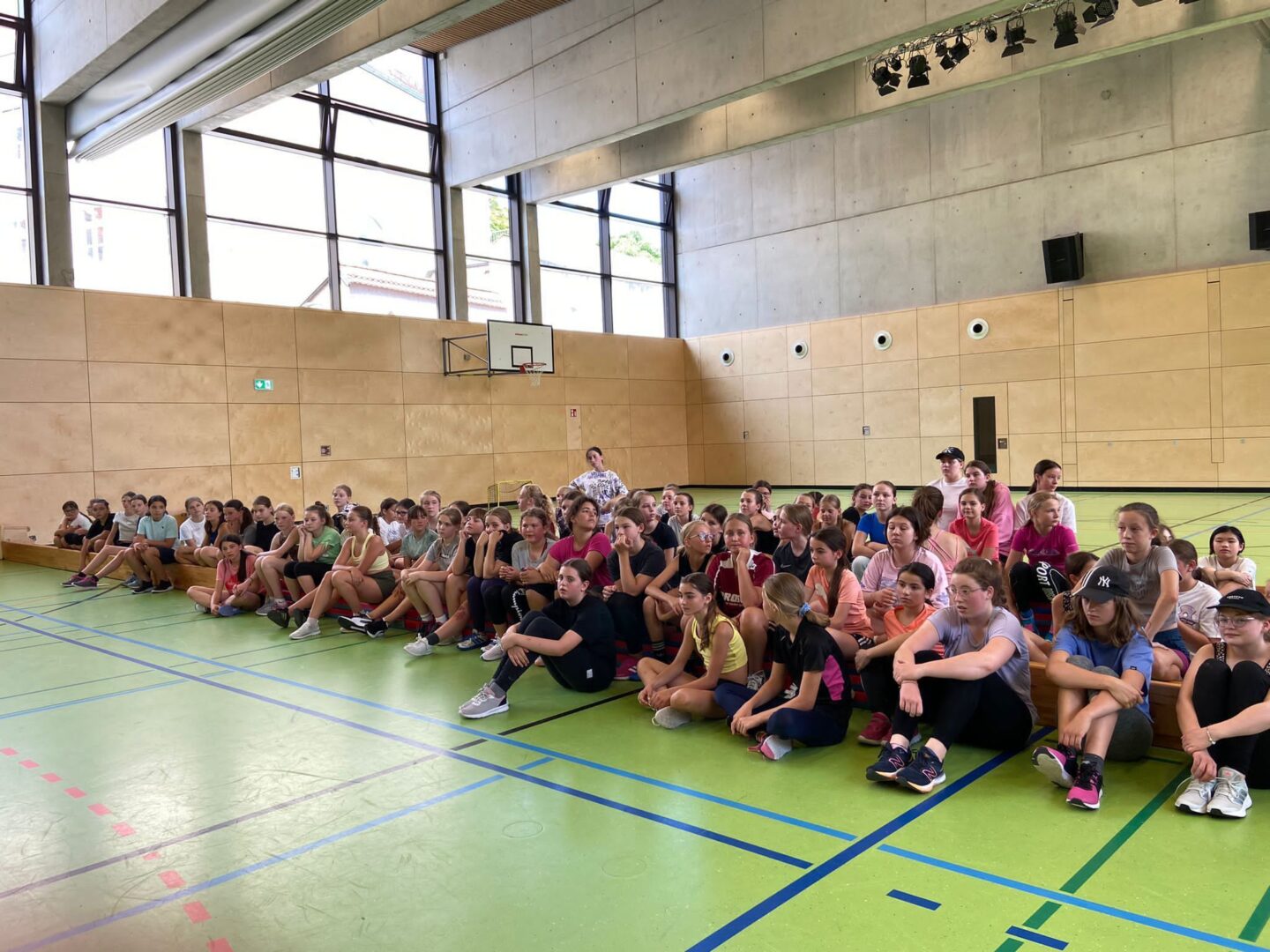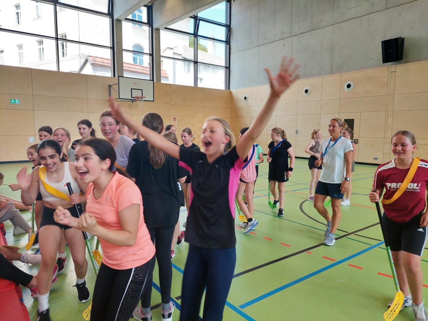 Voller Elan trafen die Schülerinnen der 6.Jahrgangsstufe vergangenen Donnerstag auf dem Spielfeld aufeinander, denn es hieß: Auf die Schläger, fertig, los!Lange dauerte es nicht, bis die Mädchen jubelnd durch die Halle tosten, da die ersten Tore gefallen waren. Zeitgleich fand im Freien ein spannendes Völkerballturnier statt, bei welchem wir sogar Aufpasserinnen rekrutieren mussten, die bei unserem rasanten Ballwechsel das Risiko, einen Ball in der Isar zu versenken, minimieren sollten. Der aktive Vormittag war geprägt von viel Freude, Teamgeist und Zusammenhalt, sodass die Schülerinnen am Ende zwar etwas erschöpft, aber voller Stolz auf ihre Urkunde und ihre Preise, die ihnen von den Sportlehrerinnen ausgehändigt wurden, blicken konnten. Im Hockey schaffte es die 6b auf den 1.Platz, dicht gefolgt von den Klassen 6c,6d und 6a. Die Nase vorn hatte in der Ballsportart die Klasse 6a, den zweiten Platz belegte die 6d, es folgten auf dem Siegertreppchen die 6c und 6b.