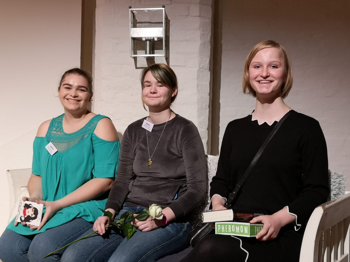 Entspannte Gesichter nach der Verleihung des Jugendbuchpreises: Jasmin Dahlmann (l.) und Leony Jakob (m.). sind froh über den guten Verlauf des Abends, Ida Nowak (r.) freut sich über ihre Tombolagewinne.