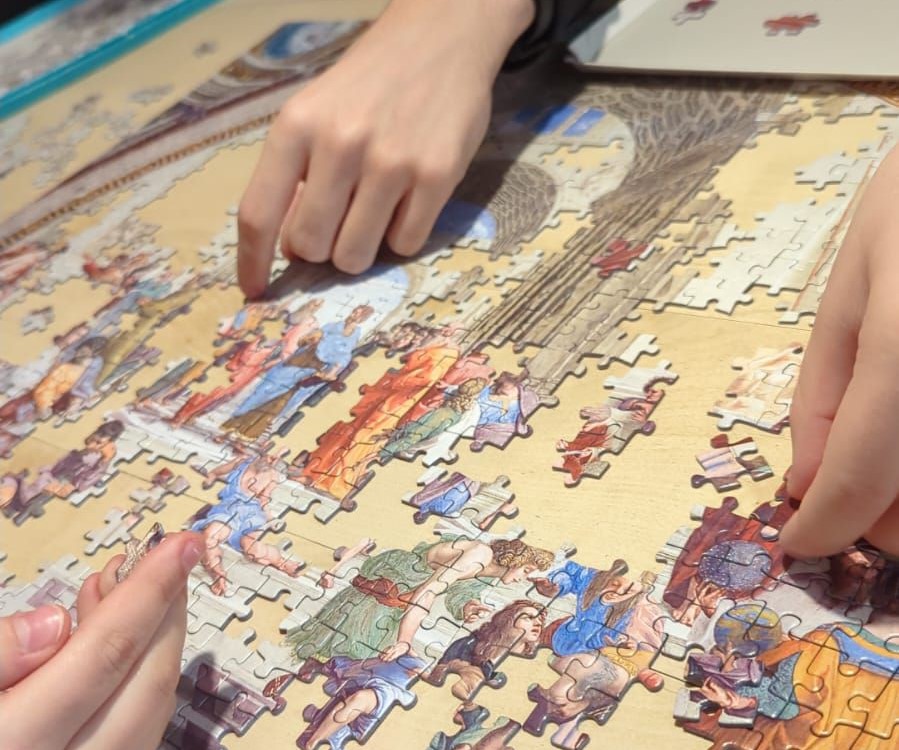 Nach dem Frühstück am nächsten Morgen versuchen wir uns zuerst darin, theoretisch eine Billardkugel mathematisch einzulochen und danach in Algebra. Viele Erkenntnisse später gibt es zuerst Mittagessen und im Anschluss eine Wanderung einen Berg hoch. Oben angekommen genießen wir die Aussicht, die an diesem Tag sogar bis zu den Alpen reicht. Zurück in der Jugendherberge gibt es Kuchen und eine Runde GarticPhone. Nach dem Abendessen werden wir, wie am Vortag, in Gruppen eingeteilt und dürfen uns an einem Staffellauf versuchen. Dieses Mal gibt es karierte Blöcke zu gewinnen, die Motivation ist also groß. Vierzehn Aufgaben später gibt es eine Siegerehrung, anschließend Puzzle, Risiko und GarticPhone.