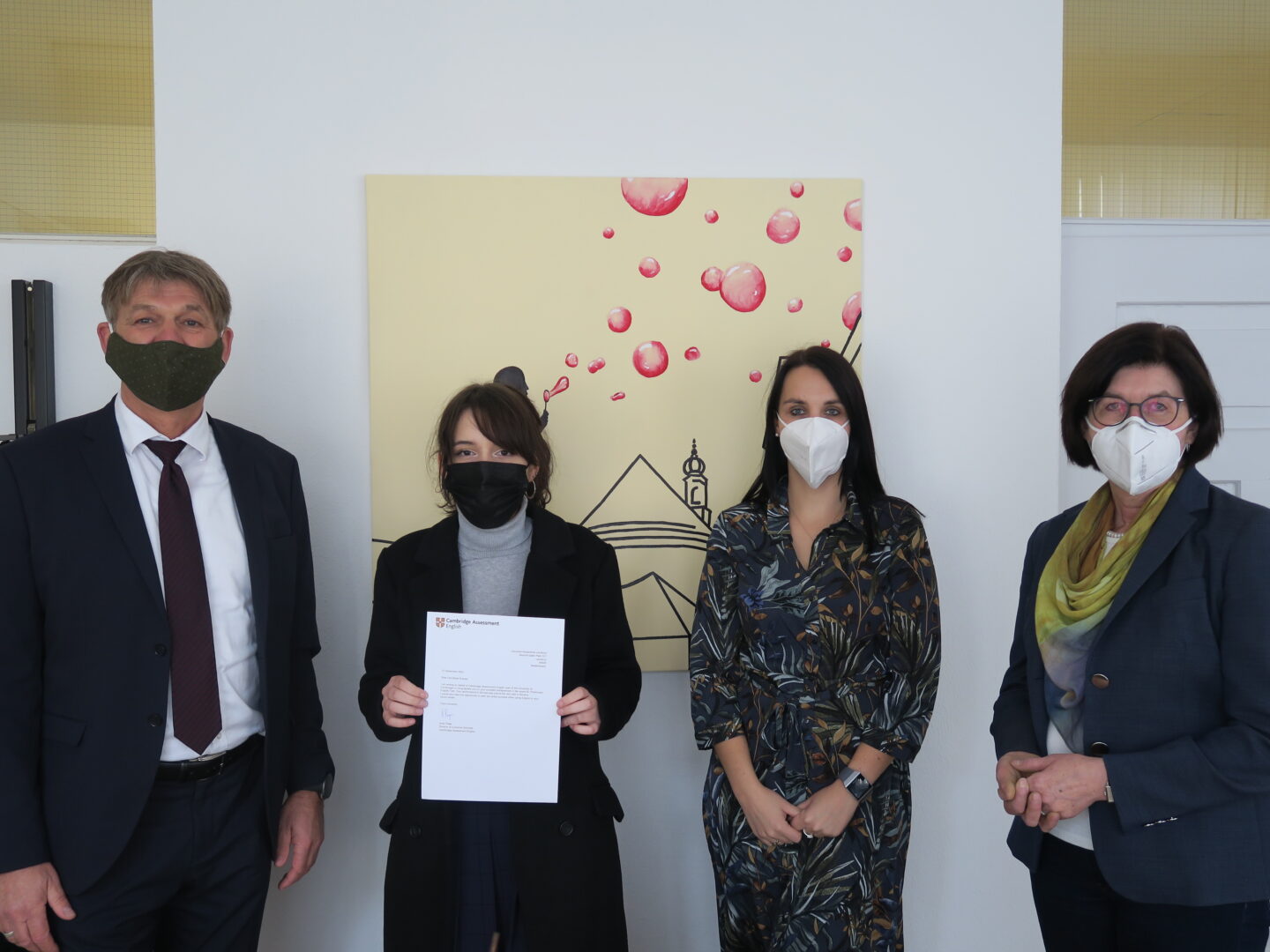 Nur neun Schülerinnen in Bayern und nur fünf Schülerinnen in Niederbayern brachten bei der diesjährigen Prüfung des Cambridge Institut das Kunststück fertig, alle 170 möglichen Punkte zu erringen.Lilly-Marie Krausevon unserer Schule war eine dieser Schülerinnen. Deshalb ließ es sich der Ministerialbeauftragte für die Realschulen in Niederbayern,Manfred Brodschelm, nicht nehmen, der Zehntklässlerin selbst zu gratulieren und einenBuchgutschein des Bayerischen Kultusministeriumssowie dieUrkunde des Präsidenten vom Cambridge Institutzu überreichen. Dieses Institut hat mit demPreliminary English Test(PET) eine Prüfung für geschriebenes und gesprochenes Englisch im Alltag konzipiert, deren erfolgreiches Bestehen in einem international sehr anerkannten Zertifikat attestiert wird. Brodschelm betonte bei seinem Besuch, dass die außergewöhnlich gute Leistung der Ursulinen-Schülerin viele beruflichen Türen im In- vor allem aber im Ausland öffnen werde, und wünschte ihr viel Glück für den weiteren Lebensweg.