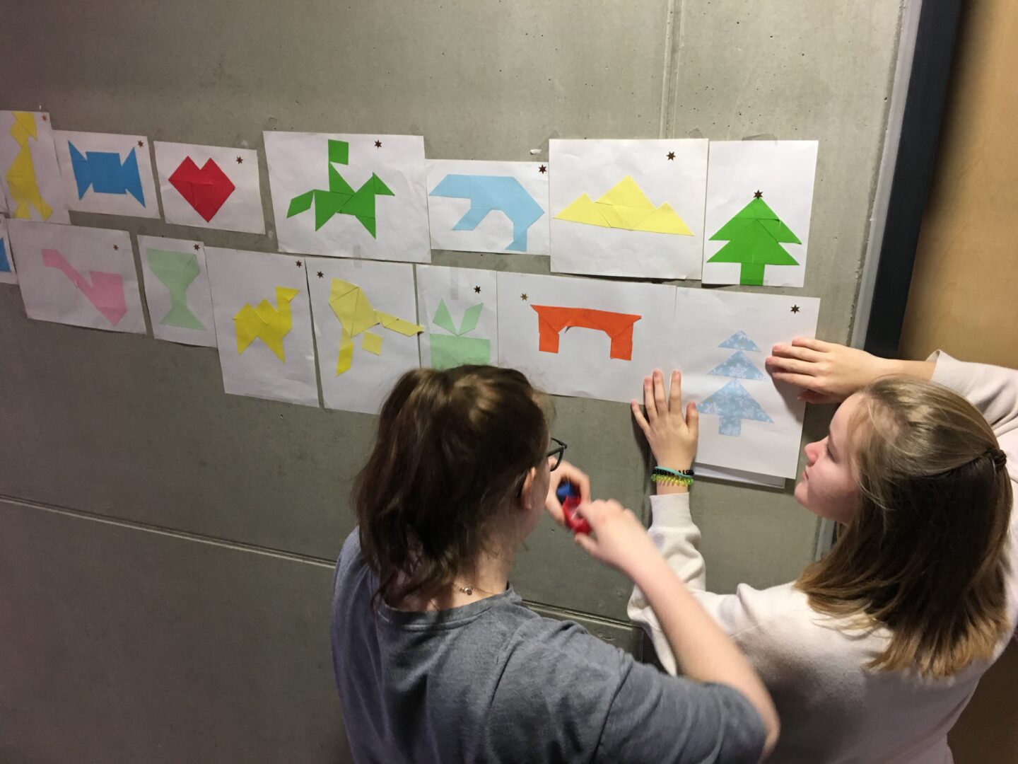 Einen Adventskalender der sportlichen Art bastelten die Schülerinnen im Sportunterricht. Teils als Hindernislauf, teils als Glückslauf mit Würfeln, teils als Staffeln mussten die Kinder die Tangram-Teile in der Halle finden und das „Tagesbild“ zusammenbauen. Die fertigen 24 Bilder wurden dann im Gang der Turnhalle aufgehängt.