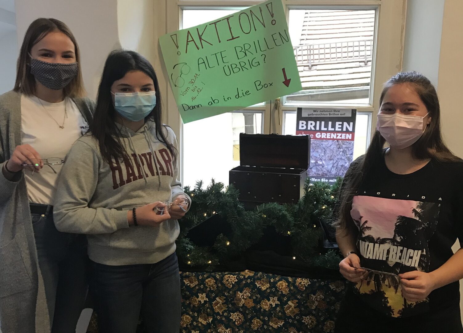 Nicht arbeiten oder in die Schule gehen können, weil die Brille fehlt? Für uns völlig unvorstellbar! Genau das ist aber die Situation der Hilfsbedürftigen in vielen armen Ländern, die sich keine Sehhilfen leisten können und damit im Bildungs- oder Erwerbsprozess ausfallen. Der französische Kapuzinerpater François Meyer hatte vor mehr als 40 Jahren die geniale Idee, mitgebrauchten BrillenAbhilfe zu leisten. Heute wird seine Idee von mehr als 30 ehrenamtlichen Mitarbeitern des Vereins„Lunettes sans frontières–Brillen ohne Grenzen“weitergeführt. Der Verein sortiert und reinigt das eingehende Sammelgut, misst die Dioptrien und vermerkt sie am Gläserrand. So können die Brillen den passenden Träger finden, wenn sie weltweit von ansässigen Hilfsorganisationen verteilt werden. Deshalb sammeln wir alte Brillen jeglicher Art, die wir mit Hilfe des Vereins den Menschen zukommen lassen, die sie benötigen. Wir hoffen auf große Unterstützung und freuen uns, wenn möglichst viele Brillen den Weg in die Spendenbox gegenüber vom Vertretungsplan finden!