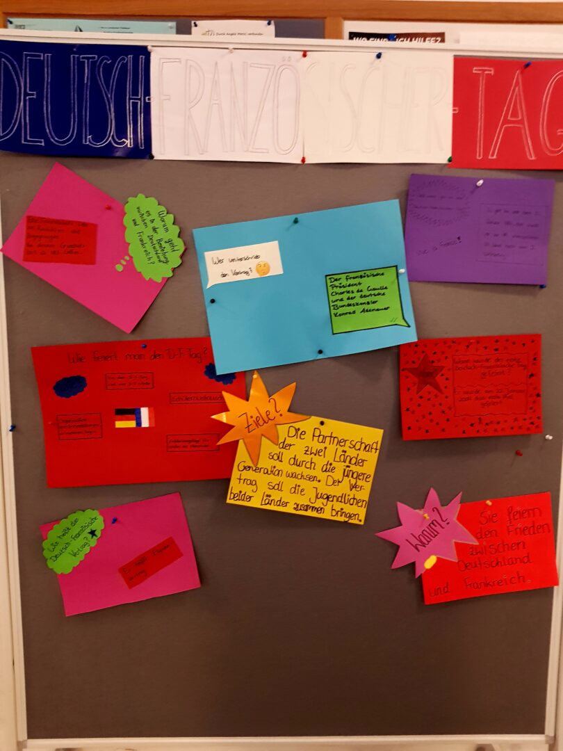 Sicher steht jetzt noch die Frage im Raum: Warum gab es dieses Quiz über Frankreich eigentlich? Anlässlich des deutsch-französischen Tages, der 1963 von Bundeskanzler Konrad Adenauer und Frankreichs Präsidenten Charles de Gaulle ins Leben gerufen wurde, gestalteten die Klassen 7c und 8e eine Stellwand mit den wichtigsten Fakten über dieses Ereignis. Ziel ist es, den Schülerinnen auf diese Weise Frankreich ein bisschen näher zu bringen und die Freundschaft beider Länder aufrecht zu erhalten. Und erst zum Jahrestag des deutsch-französischen Tages am 22. Januar haben Angela Merkel und Emmanuel Macron nochmals betont, wie sehr ihnen dieses Projekt am Herzen liegt. Auf eine lange Freundschaft!