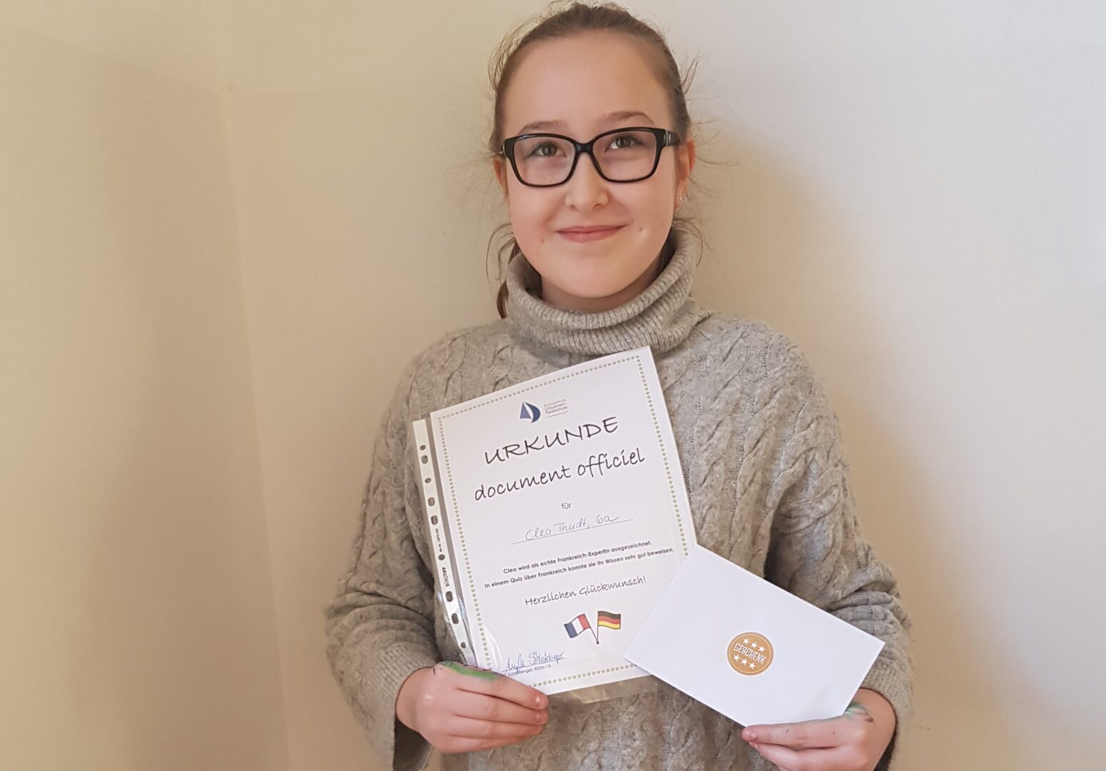 Diesen herausfordernden Fragen und noch vielen anderen mehr konnten sich alle Schülerinnen stellen, wenn sie am Quiz zum deutsch-französischen Tag teilnahmen. In den Pausen waren die Gänge voll mit rätselfreudigen Kindern, die alle auf der Suche nach den richtigen Antworten waren. Aber wie heißt er denn nun, der französische Präsident…Makkaroni? Macaron? – Cleo Thudt war sich bei allen Fragen sehr sicher und fand nicht nur für diese die richtige Lösung: Er heißt natürlich Macron. Fehlerfrei gab die Schülerin aus der Klasse 6a ihr Quiz ab und stand so schnell als Siegerin fest. Sie freute sich über die Auszeichnung als „Echte Frankreich-Expertin“ und ein kleines Geschenk.