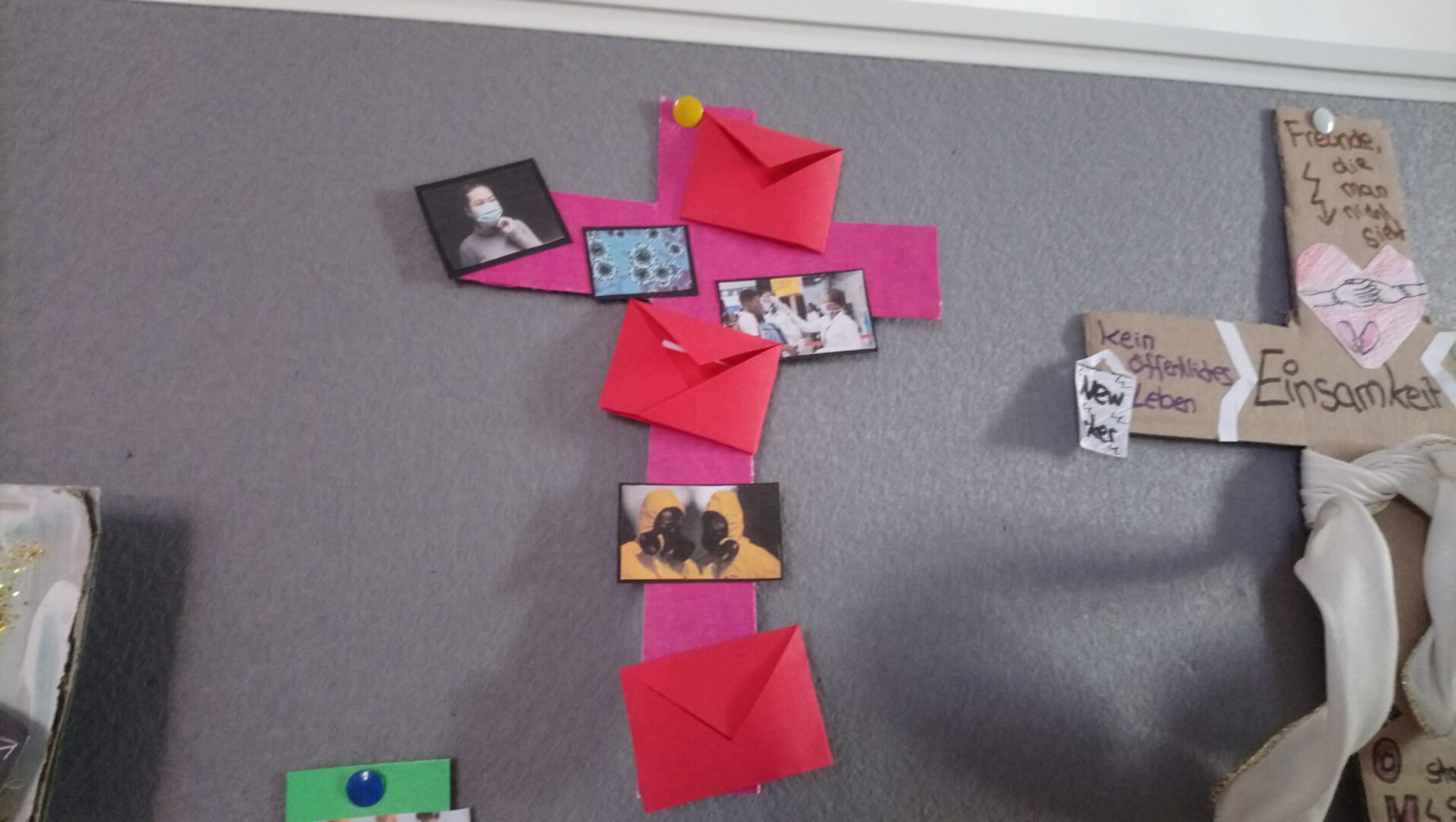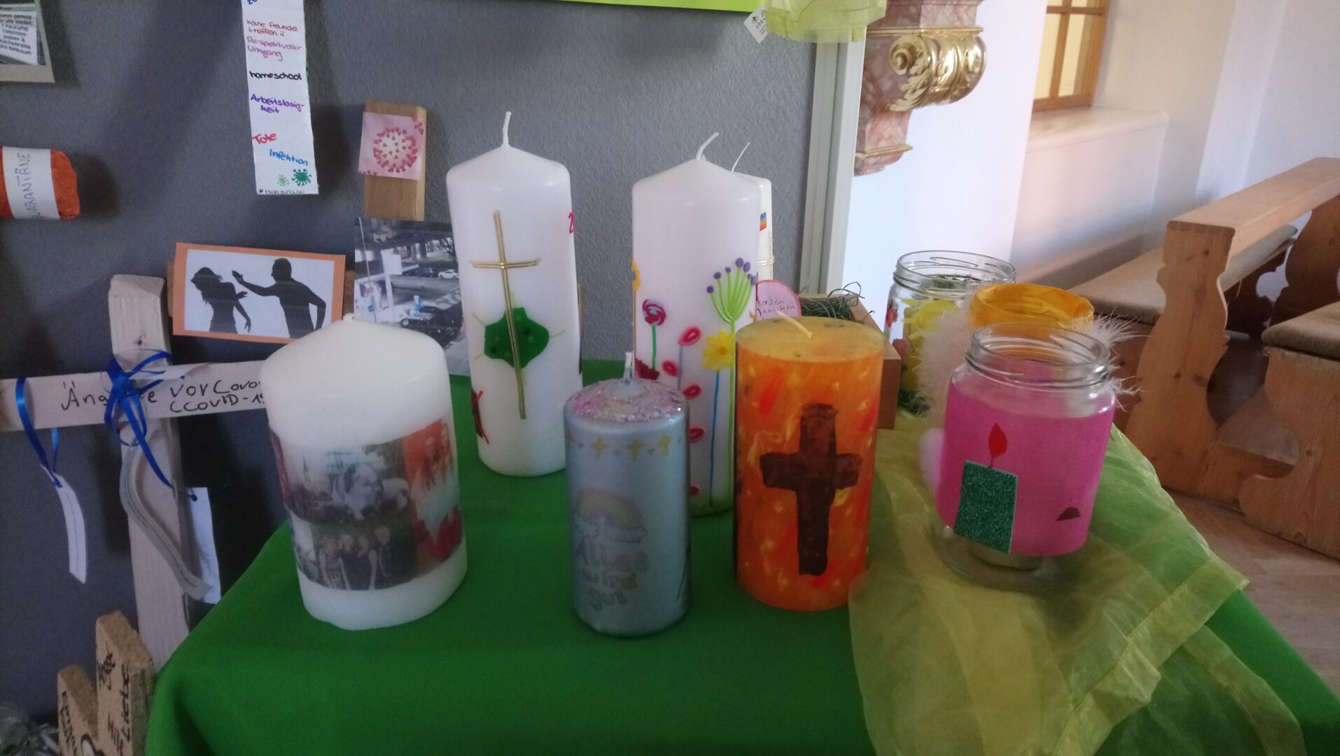 Religionsunterricht während der Zeit des Homeschoolings? – Die Klassen 8e, 9b, 10b und 10c haben während des Lockdowns auf kreative Weise eine Brücke zwischen Religion und Corona gebaut. Jeweils eine Hälfte der Klasse hat coronale Kreuze gestaltet, die Sorgen und Ängste während der Pandemie zum Ausdruck bringen. Der Nacht des Karfreitags folgt für uns Christen das Licht des Ostermorgens. Deshalb hat die jeweilige andere Hälfte der Klasse Kerzen angefertigt, die auf Lichtblicke und Hoffnungen dieser außergewöhnlichen Zeit hinweisen.
