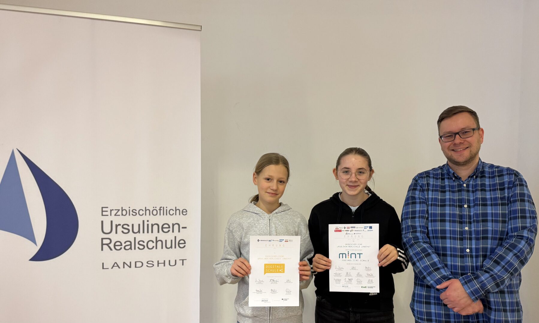 Mit diesen Prädikaten darf sich für die Ursulinen-Realschule auch in den nächsten drei Jahren schmücken. Nach der Erstauszeichnung 2018 wurden mit der Rezertifizierung als „Digitale Schule“ und „MINT-freundliche Schule“ die vielseitigen Bemühungen der Schule in diesen Sparten gewürdigt. Bereits seit vielen Jahren zeigt die Schule durch kreative und zukunftsorientierte Projekte eindrucksvoll, wie praxisnah und spannend der Bereich MINT an Schulen umgesetzt werden kann. Besonders hervorzuheben ist der Wetterballon, mit dem Schülerinnen Experimente bis in die Stratosphäre durchführten und auswerteten. Profilklassen, MINT-Schullandheim, Girlsday-Akademie uvm. unterstreichen den Stellenwert dieses Sektors bei den Ursulinen. Ein weiteres Highlight der letzten Jahre waren gewiss die mehrfachen Titelgewinne der Bayerischen Robotikmeisterschaften, bei denen die Ursulinen-Schülerinnen ihre digitale Kompetenz eindrucksvoll unter Beweis stellten. Auch im regulären Unterricht fand eine zeitgemäße Wissensvermittlung z.B. durch die Teilnahme am Projekt „Digitus“ in Kooperation mit der LMU-München zunehmend mehr Platz.Die Schulgemeinschaft ist stolz auf die beiden Signets und freut sich, auch weiterhin durch das Engagement Mädchen für den digitalen und technisch-naturwissenschaftlichen Bereich begeistern zu können.