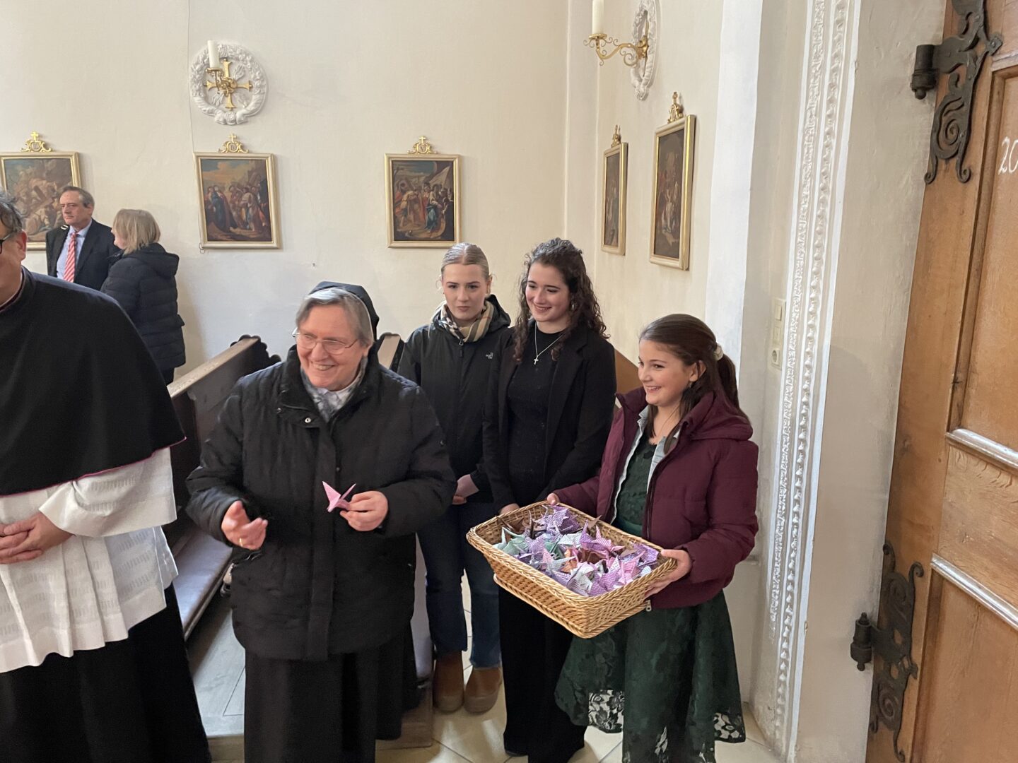 Berührend war der Moment, als unsere Schülerinnen im Auftrag des Seelsorgers unzählige kleine, selbstgebastelte Kraniche an die Gäste verteilten. Einer japanischen Legende nach sollen diese Vögel 1000 gesunde Jahre garantieren.