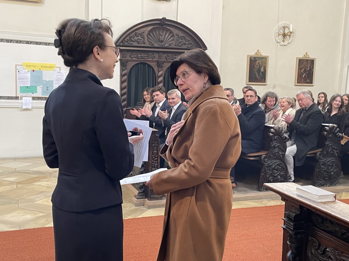 Als Zeichen der Anerkennung überreichte Dr. Krump im Namen der Erzdiözese München und Freising nicht nur die Entlassungsurkunde, sondern auch eine Ehrenauszeichnung des Katholischen Schulwerks in Bayern für ihre besonderen Dienste.