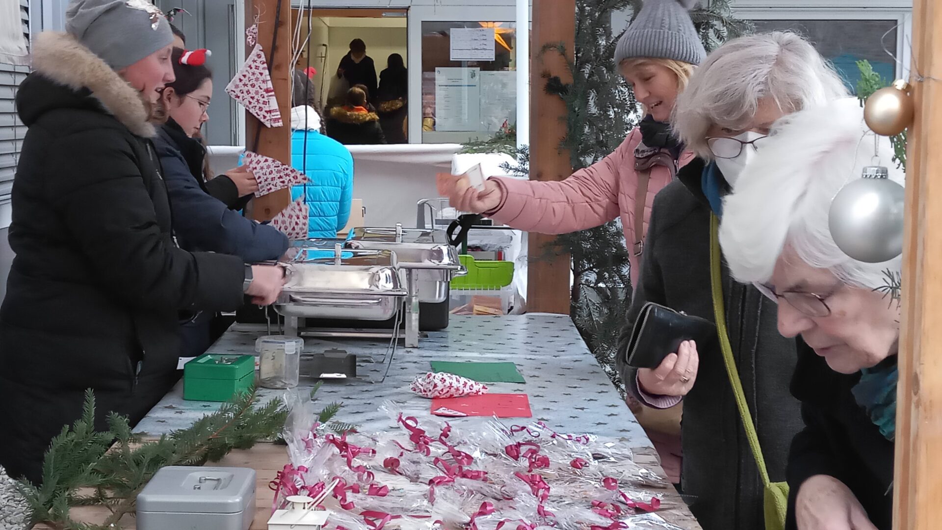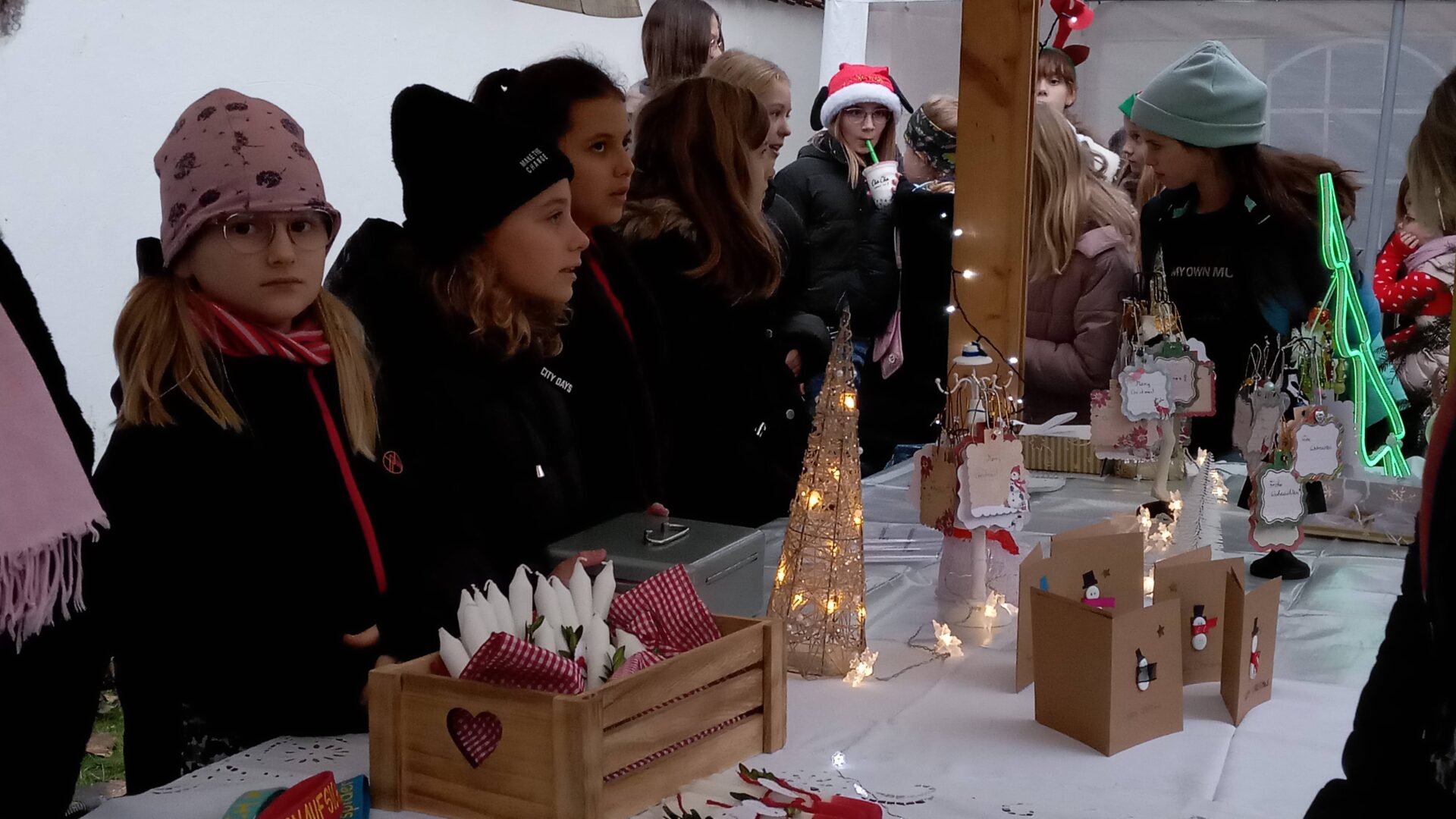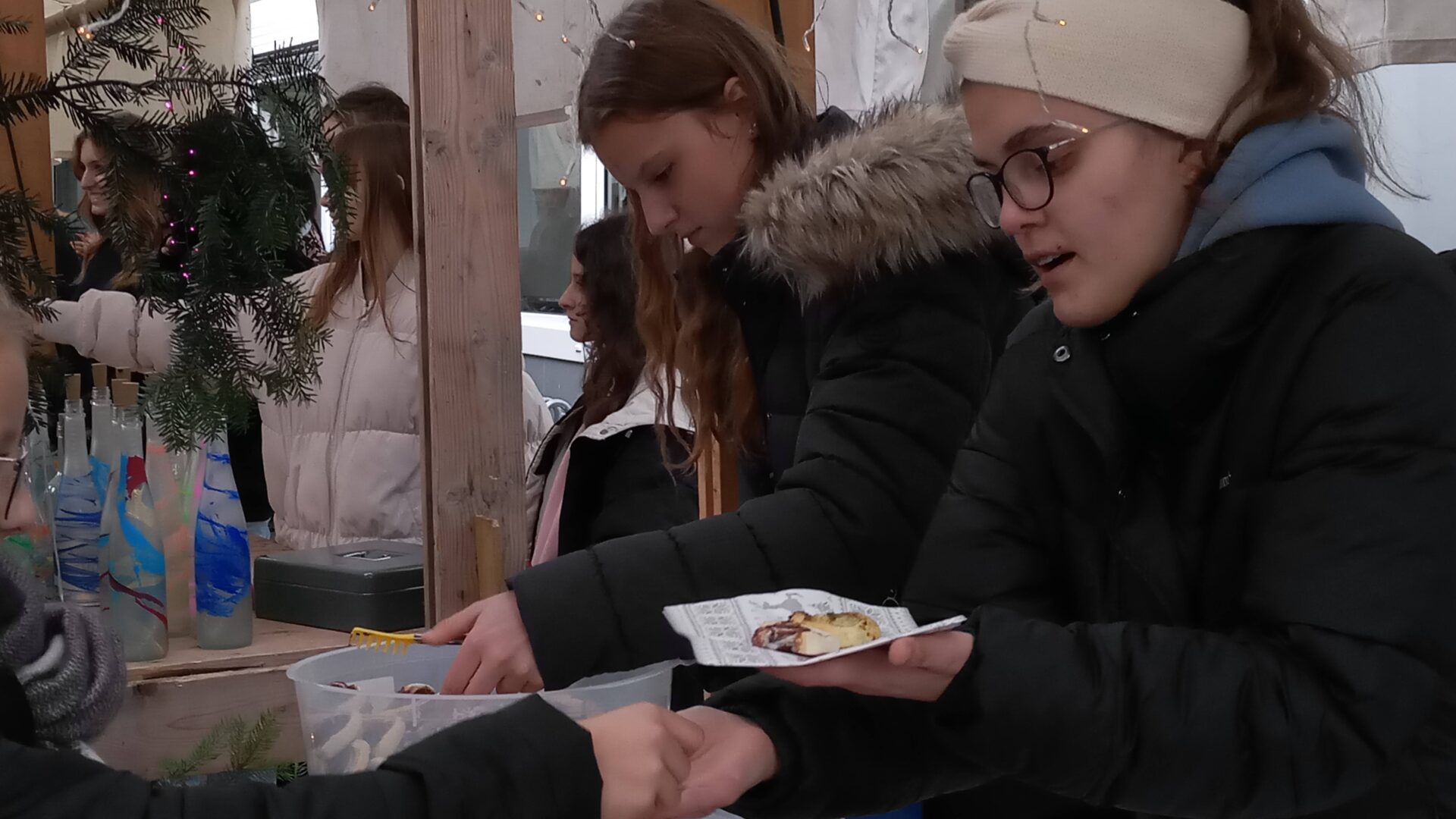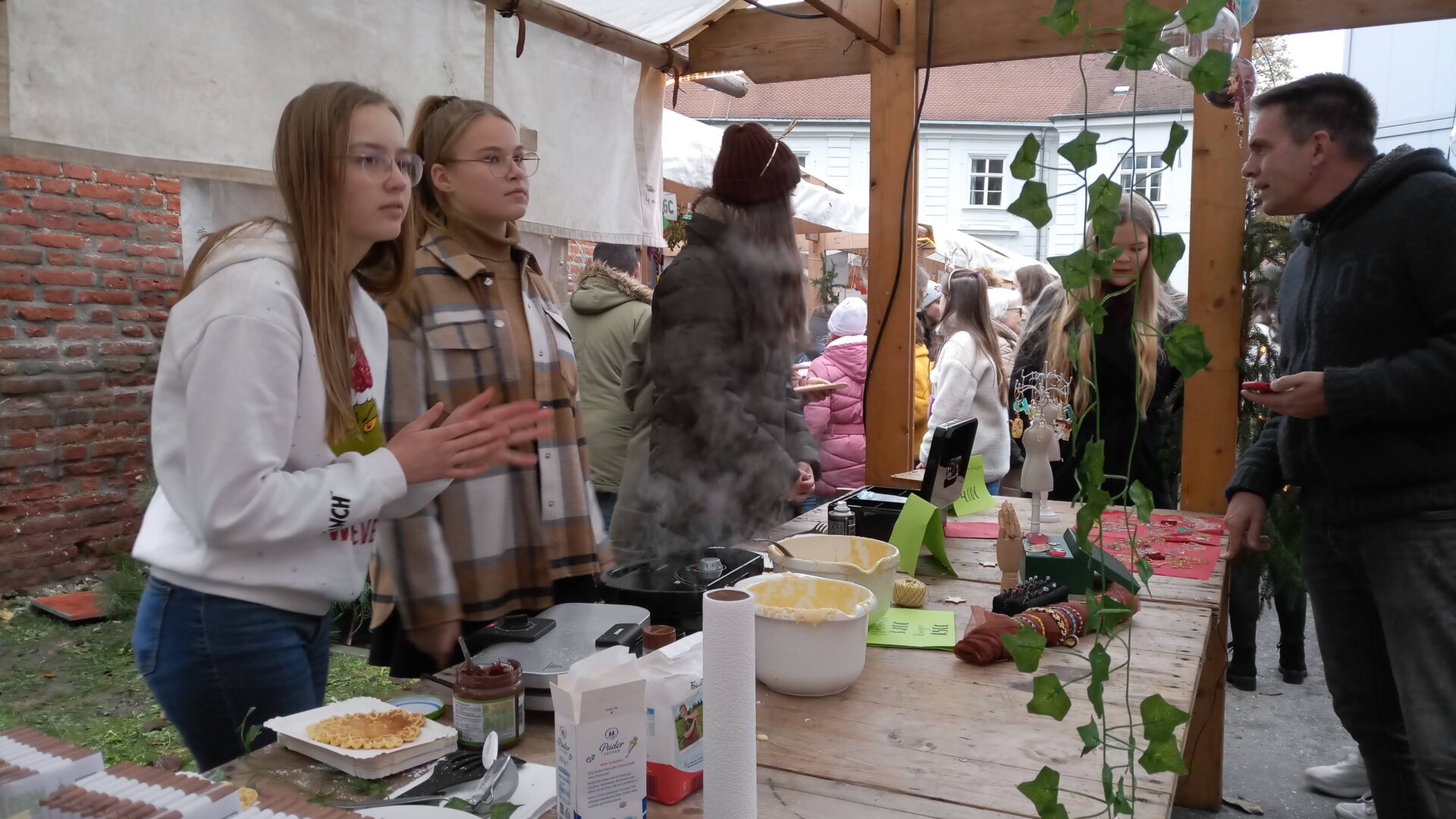 Sogar den wenigen Vierbeinern dürfte an diesem Nachmittag klar geworden sein, dass eine besondere Zeit bevorsteht: Für sie waren nämlich Buttermilchleckerlis, Bananenkekse und besonders herzhafte Meat-Love-Plätzchen im Angebot. Und wenn versehentlich ein Zweibeiner seinen Fuß unsanft auf einem Hundebein platziert hätte, so hätte dieser auch gleich Pfotenbalsam kaufen können, den die Schülerinnen der 6c aus „hochwertigen Zutaten“ gemischt hatten. Ein versehentlich Tritt auf des Nachbarn Fuß – diese Gefahr lauerte beim Adventsbasar der Ursulinen-Realschule tatsächlich, schließlich waren es viele, ja sehr, sehr viele Schülerinnen, Eltern, Geschwister, Lehrer und Freunde der Schule, die erstmals nach vier Jahren – Corona sei’s geklagt! – wieder zu diesem traditionsreichen vorweihnachtlichen Markt gekommen waren.Aufgrund der Sanierungsarbeiten im Schulhof, fand die Benefizveranstaltung heuer auf dem Freigelände neben der Modulschule statt. Diese ungewohnte Räumlichkeit wurde durch die von Hausmeistern, Lehrer- und Schülerinnen liebevoll dekorierten Buden stimmungsvoll in Szene gesetzt.Wer davon inspiriert den vorweihnachtlichen Zauber auch ins eigene Zuhause transportieren wollte, fand auf den Verkaufsflächen der Buden zahllose Gelegenheiten; hatten die Schülerinnen doch seit Wochen geschnitten, gebastelt, gestanzt und geklebt, um Adventskränze, Weihnachtspyramiden, Tonanhänger, Schneemänner, Nusswichtel, Christbaumkugeln, Makrameesterne, Duftseifen und vieles mehr anzubieten.Und die Leckerlis gab’s natürlich nicht nur für den Hund: Pizzaschnecken und Plätzchen, Wraps und Crêpes, heiße Maronen und lustige Muffins, Spekulatius- und Philadelphiatorten, Kartoffelsuppe und Kaffee erfreuten Gaumen und Mägen.Die längste Schlange bildete sich fortwährend vor dem Glühweinstand. Wer sich hier in Erwartung seines Heißgetränks einreihte, musste sich nicht langweilen – schließlich hatte er einen guten Blick auf die Freilichtbühne, auf der Vokalisten und Instrumentalisten der Schule die Glocken süßer klingen und der Engel helle Lieder verlauten ließen. Schade nur, dass gegen Ende bei „Let it snow“ jene besungene Substanz in noch flüssigerem Aggregatzustand vom Himmel fiel.Der guten Stimmung tat dies keinen Abbruch. Längst hatte sich der Adventsbasar, dessen Gewinn in diesem Jahr der Kinderkrebshilfe Dingolfing-Landau-Landshut e. V. sowie Ecuador Licht und Schatten e. V. zugute kommen wird, in ein großes Ehemaligentreffen verwandelt: Während die ehemalige Schülerin ihren damaligen Lehrer ohne zu zögern namentlich grüßte, begann der Kopf des Lehrers mit dem Glühwein um die Wette zu rauchen: Wie hieß das damals unterrichtete kleine Mädchen bloß, das nun als erwachsene Frau mit ihren drei Kindern vor ihm steht und ankündigt, ihre Kinder bald auch zu den Ursulinen schicken zu wollen…