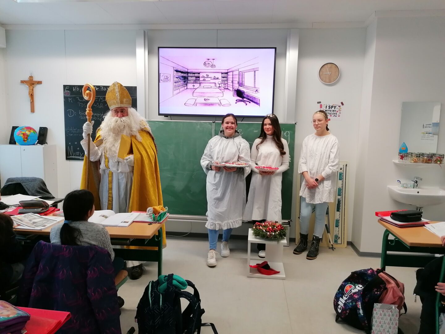 Auch wenn es der Nikolaus aus zeitlichen Gründen nicht in alle Klassen schaffte, so überbrachten die dreiengelhaften Schulsprecherinnen Julia Dang, Teresa Gehwolf und Julia Koschallen Schülerinnen persönlich einen Nikolaus aus Schokolade.