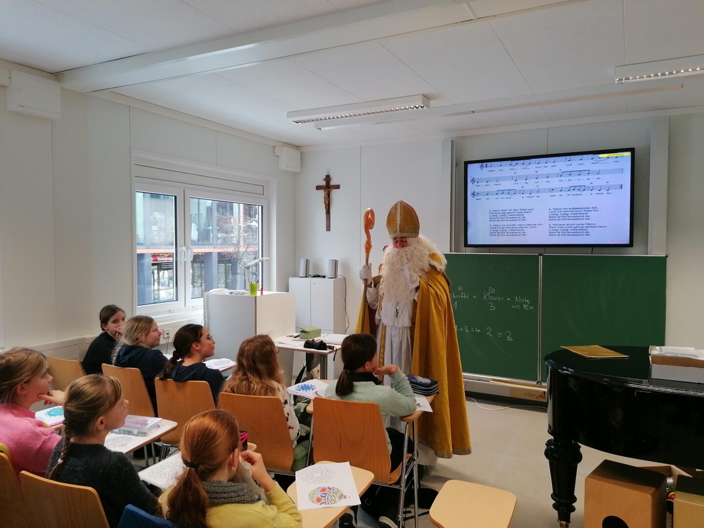In der Klasse 5c durfte der Nikolaus dem Lied „Lasst und froh und munter sein“ lauschen, begleitet von ihrer MusiklehrerinBettina Weber am Klavier.
