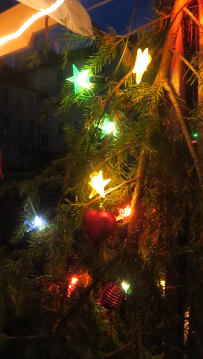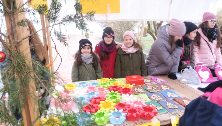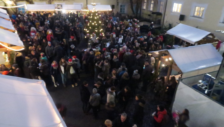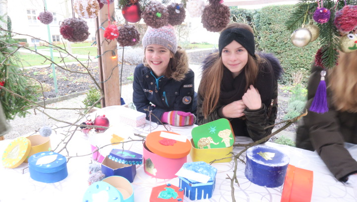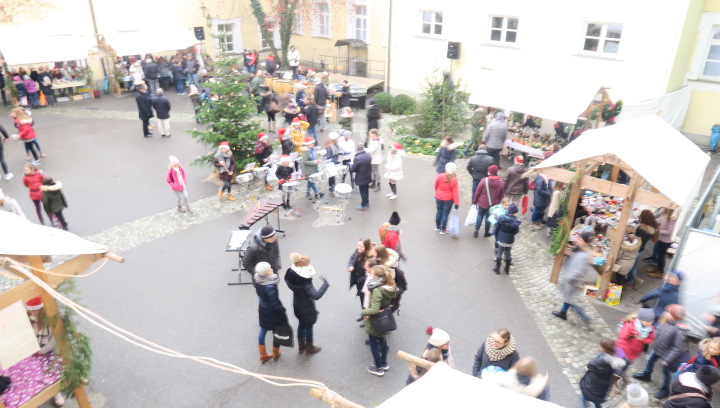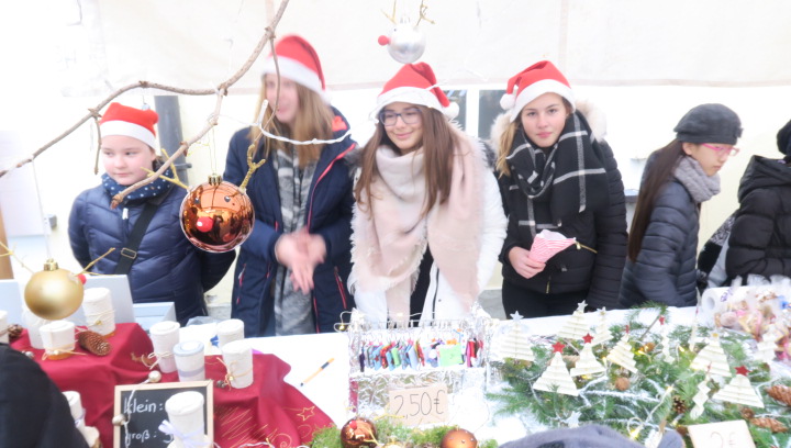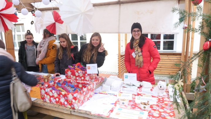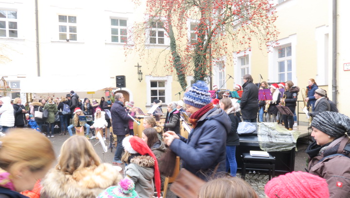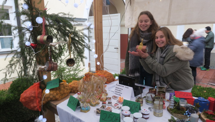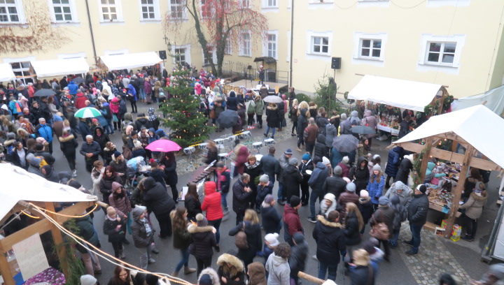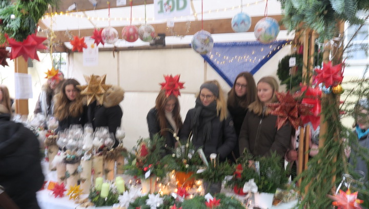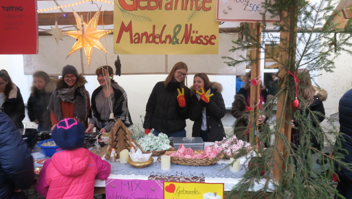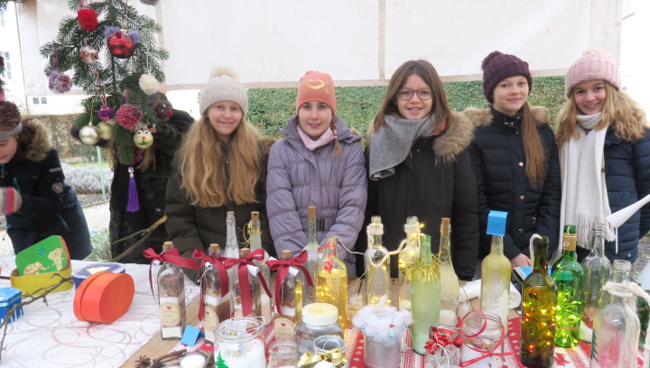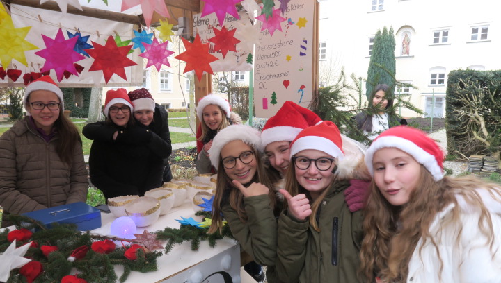 Nein, der Schnee rieselte nicht, weihnachtlich glänzten aber der Pausen- und der Klosterhof am vergangenen Freitag, als der große Adventsbasar unserer Schule bei nieselfeuchter Kälte stattfand. Still und starr war’s keine Minute, denn jedermann konnte horchen, wie lieblich es vom Anfang bis zum Ende durch den Hof schallte, schließlich waren Bläserensembles, Trommler, Tänzerinnen und Chorklassen der Schule im Dauereinsatz auf der kleinen Bühne inmitten der Budenwelt. Spätestens beim hellen Gesang der Fünftklässlerinnen schien der Chor der Engel erwacht. In den Herzen der Eltern, Geschwister und Lehrer wurd’s warm, als sie die filigran gebastelten Sterne, Armreife, Freundschaftsbänder, die liebevoll verpackten Plätzchen, Pralinen, Lebkuchen der Schülerinnen an den Verkaufsständen sahen. Und in den Mägen wurd’s warm bei Glühwein, Kinderpunsch, Kartoffelsuppe, Pizzas, Wraps und Crêpes. Still schweigen sollte die Waage am nächsten Tag, mochte sich mancher beim Verzehr von schokoglasierten Früchten, gebrannten Mandeln und zuckersüßen Tortenstücken gedacht haben. Schulseelsorger Armin Weyers segnete die im Vorfeld gebastelten Adventskränze in der Klosterkirche und warf schon einen Blick voraus auf die baldige heilige Nacht. Am Ende waren die Sorgen des Regens verhallt, denn die Freunde der Schule strömten wieder in Massen herbei und so waren fast alle angebotenen Waren verkauft. Die Landshuter Frauenhäuser sowie Licht und Schatten Ecuador dürfen sich also auf eine großzügige Spende freuen. Die Klassensprecherinnen hatten nämlich im Vorfeld beschlossen den gesamten Erlös des diesjährigen Adventsbasars diesen beiden Organisationen zur Verfügung zu stellen.