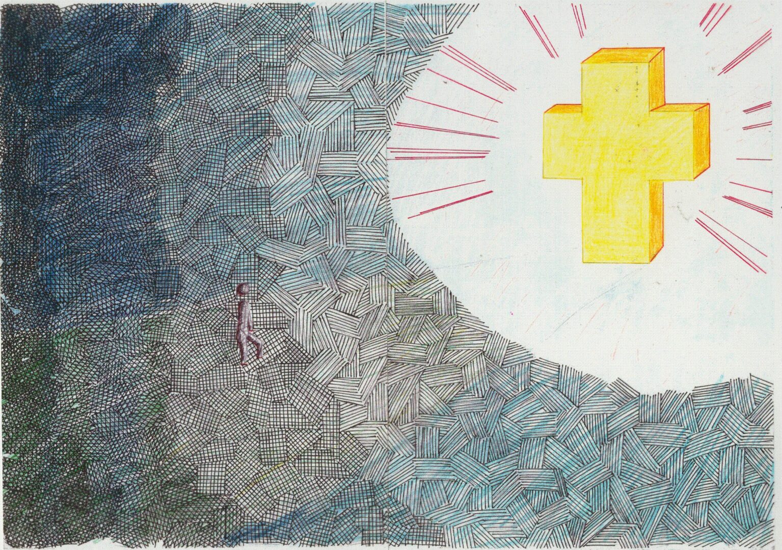 Ostern 2020 – Ein Mensch. Allein. Fernab von allen anderen. Auf unklarem Terrain. Ein Kreuz, das schon Licht ist und strahlt. Dessen Glanz auf den unsicheren Schrittes trottenden Menschen fällt. Unsere ehemalige Schülerin Irene Mühlhofer hat dieses Jesusbild vor sechzehn Jahren gemalt. Nie hat es mehr Aktualität gehabt als in diesen Tagen, in denen Social Distancing und Jesu Auferstehung auf so ungewöhnliche Weise aufeinanderprallen. Möge allen Freunden unserer Schule österliches Licht ins Herz scheinen. Frohe Ostern!