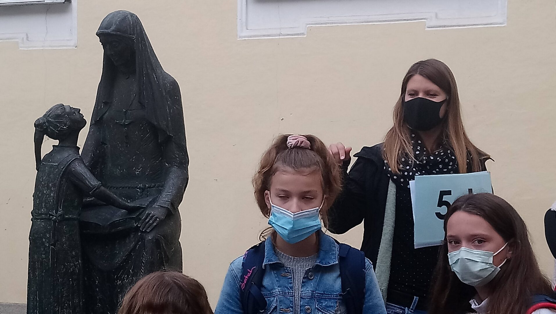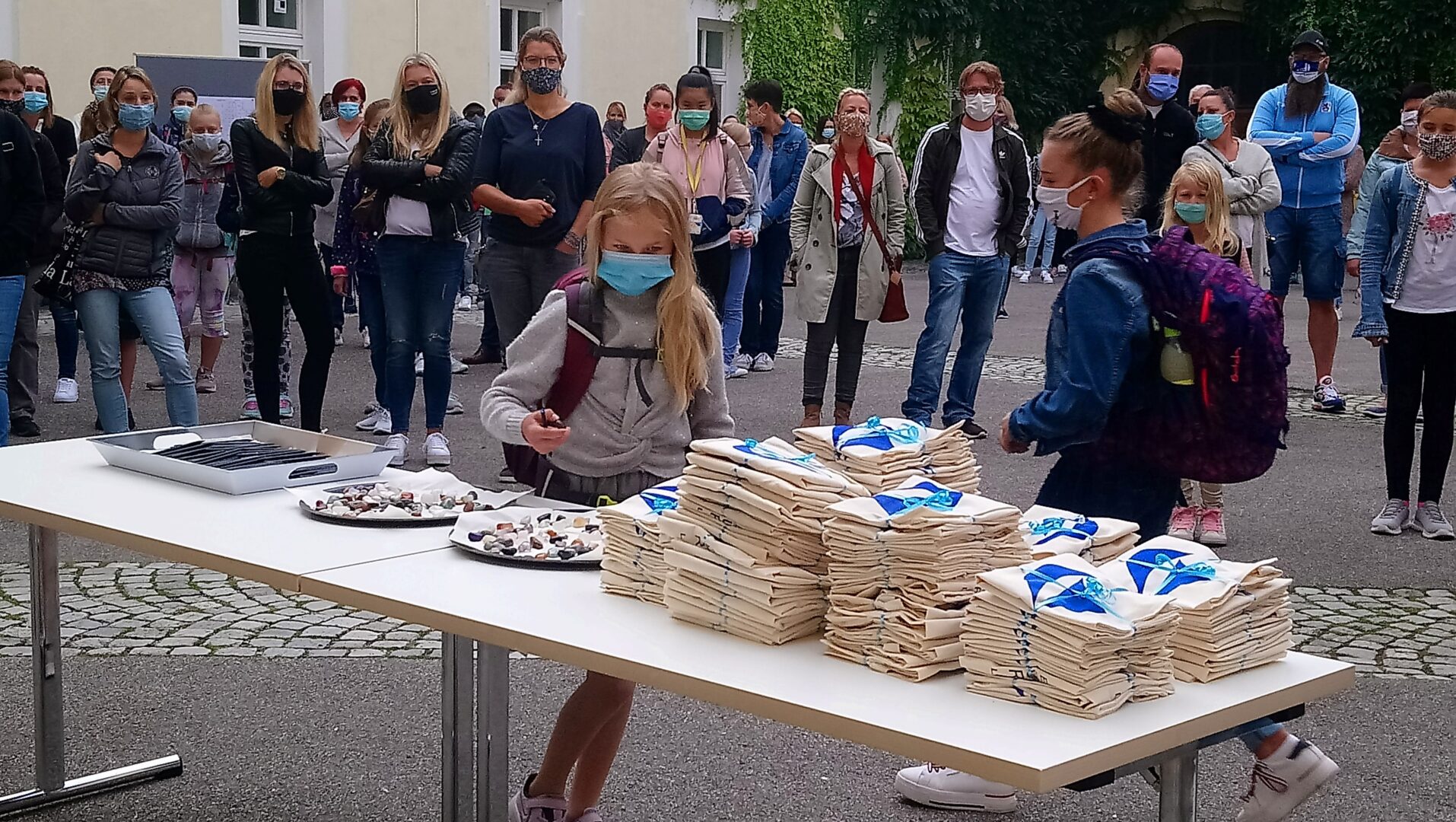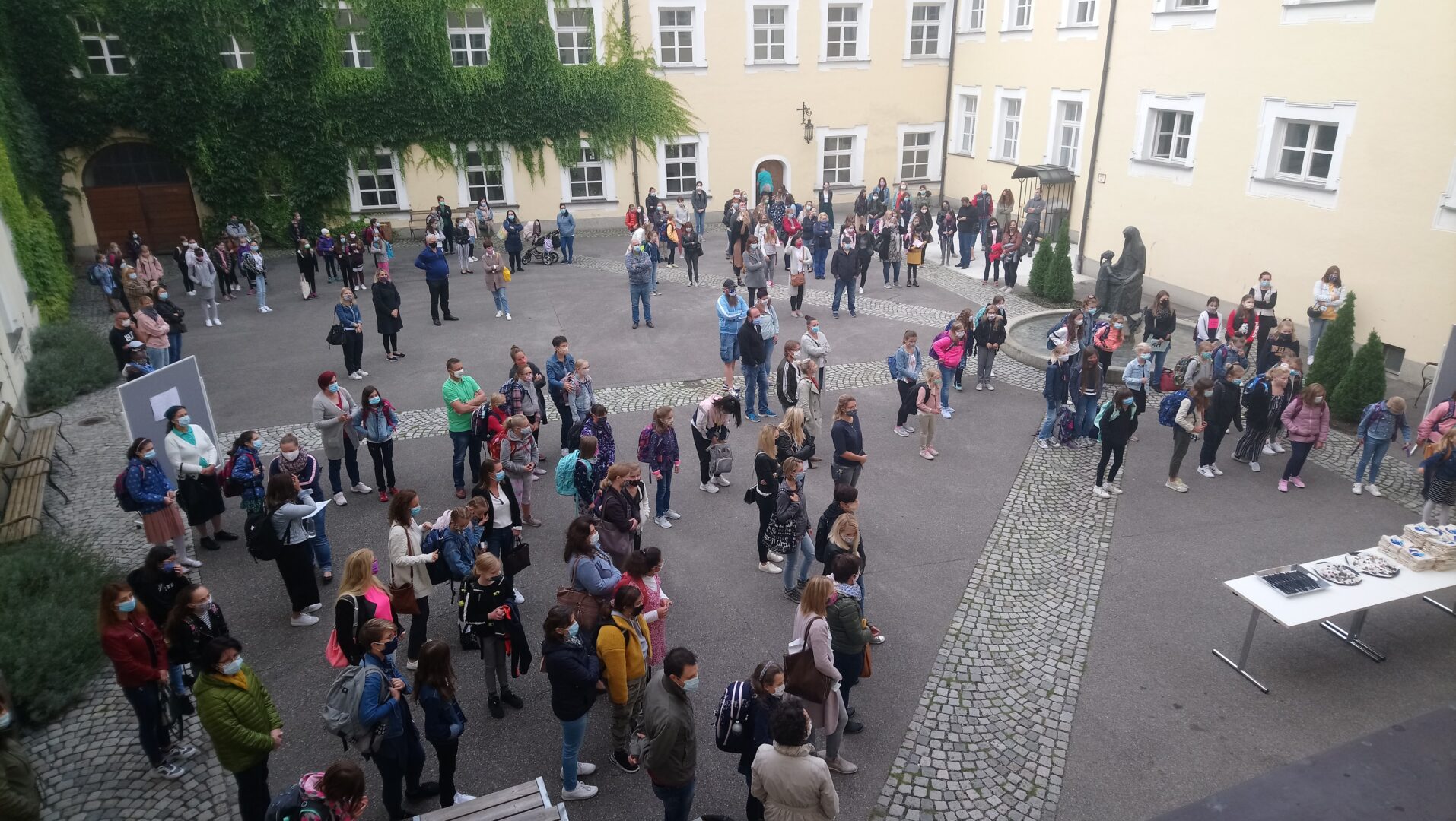 Nur das bronzene Mädchen, das der heiligen Angela vertrauensvoll in die Augen blickt, trug heute morgen keinen Mund-Nasenschutz. Alle, die sich heute rund um den Angela-Brunnen im Pausenhof trafen, hielten sich aber an das Gebot der Stunde und verdeckten ihre untere Gesichtshälfte mit der Maske. Besonders aufregend war dieser erste Schultag natürlich für unsere 104 Fünftklasslerinnen. Viele von ihnen betraten überhaupt zum ersten Mal in ihrem Leben diese Schule, da der Tag der offenen Tür sowie die Einschreibung den Corona-Maßnahmen im Frühjahr zum Oper fielen. Schulleiterin Angela Schleibinger las ihren Augen förmlich den bangen Gedanken ab: "Werden mich die hier mögen?" - Vor sieben Jahren habe sie sich bei ihrem Amtsantritt genau dieselbe Frage gestellt, doch im Handumdrehen habe sie gemerkt, dass dies hier ein Ort mit lauter freundlichen Menschen sei: "Die Lehrer, die Sekretärinnen, ja sogar die Hausmeister sind hier besonders nett!" In dieser Zuversicht und mit viel Vertrauen dürften die neuen Schülerinnen hier starten. Natürlich wurde im coronalem Zeitalter auf den Handschlag zur Begrüßung verzichtet. Dieser kann im Juli 2026 nachgeholt werden, wenn die dann jungen Frauen im Ballkleid ihre Abschlusszeugnisse überreicht bekommen werden. Vielleicht wird manche dann noch den bunten Glückstein im Handtäschchen tragen, den sie sich heute als Talisman aus einem Korb nehmen durfte.