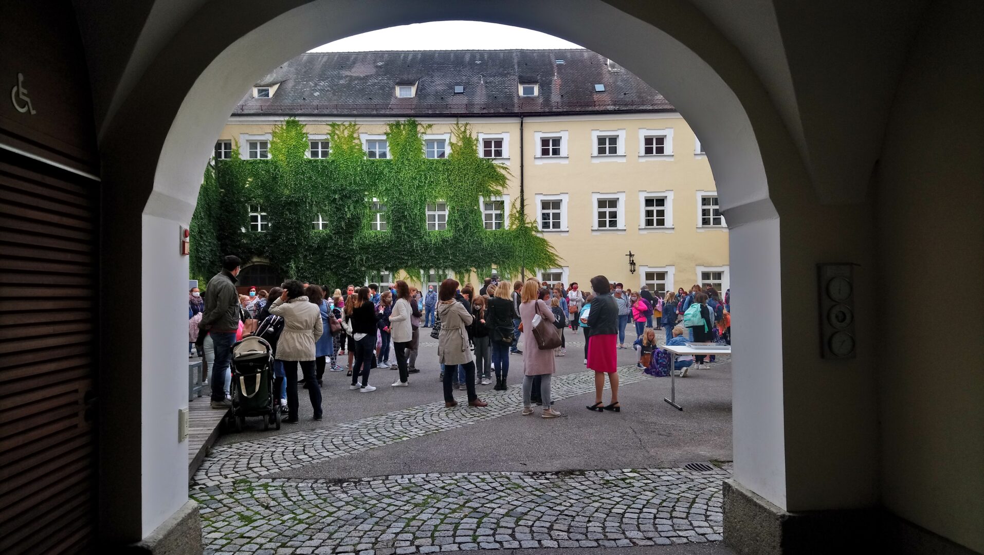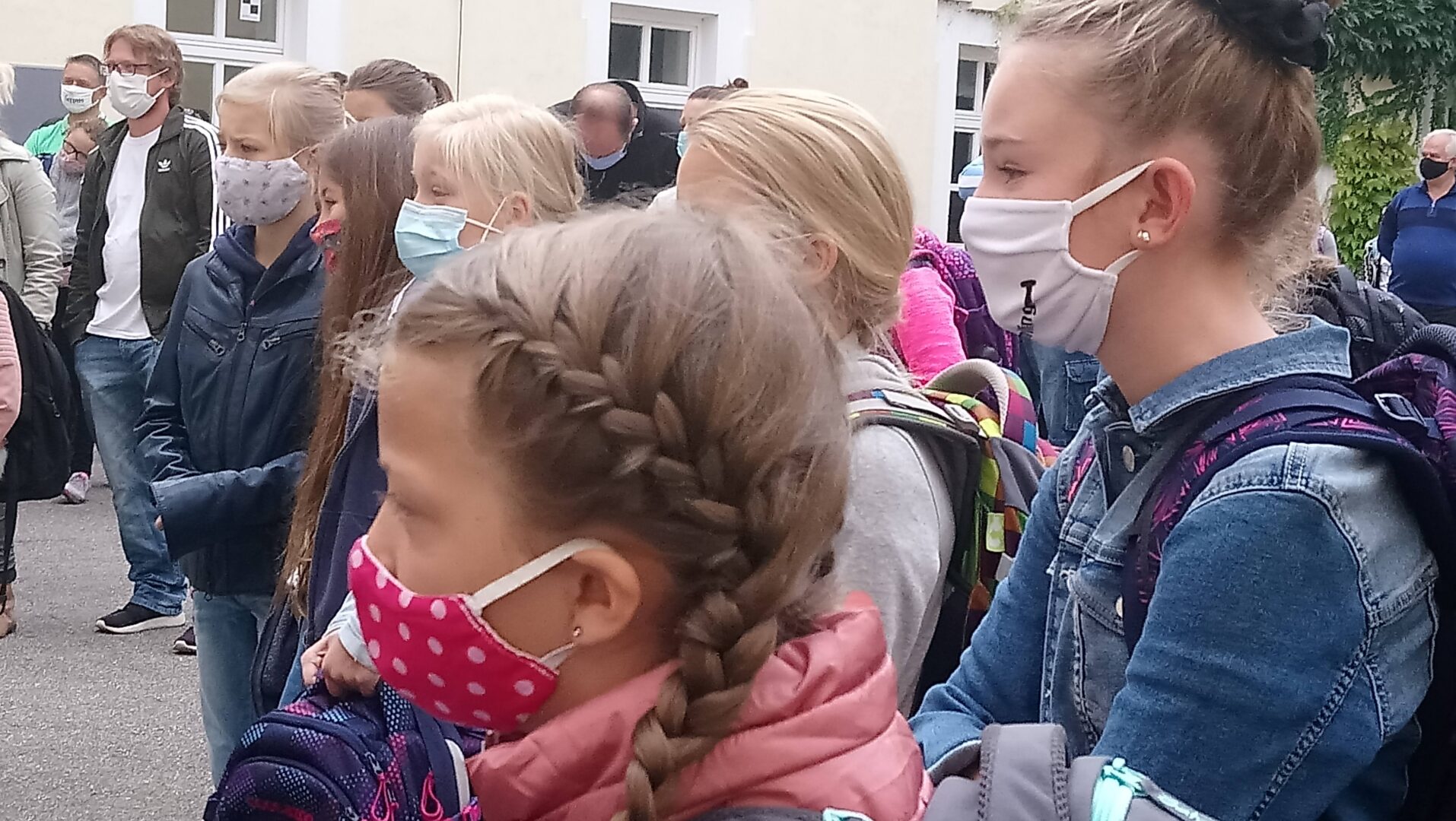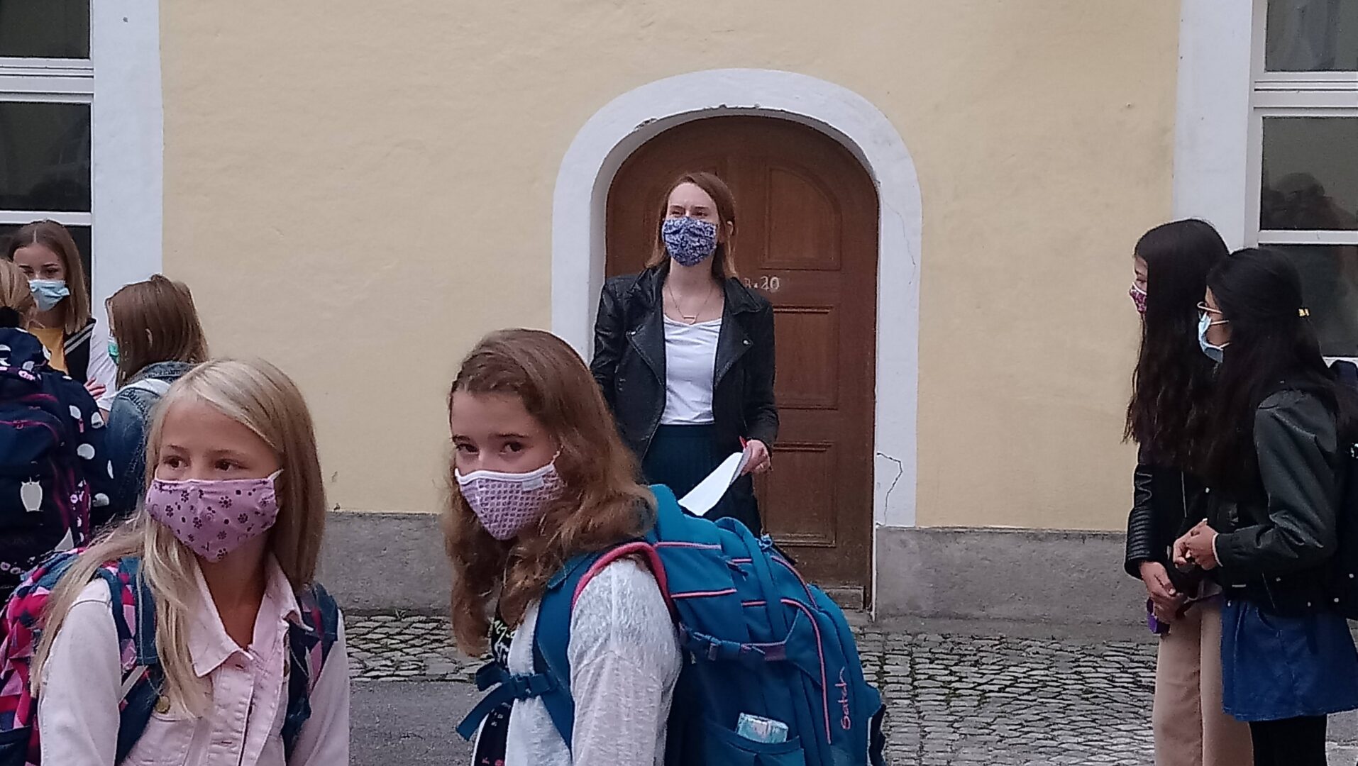 Nur das bronzene Mädchen, das der heiligen Angela vertrauensvoll in die Augen blickt, trug heute morgen keinen Mund-Nasenschutz. Alle, die sich heute rund um den Angela-Brunnen im Pausenhof trafen, hielten sich aber an das Gebot der Stunde und verdeckten ihre untere Gesichtshälfte mit der Maske. Besonders aufregend war dieser erste Schultag natürlich für unsere 104 Fünftklasslerinnen. Viele von ihnen betraten überhaupt zum ersten Mal in ihrem Leben diese Schule, da der Tag der offenen Tür sowie die Einschreibung den Corona-Maßnahmen im Frühjahr zum Oper fielen. Schulleiterin Angela Schleibinger las ihren Augen förmlich den bangen Gedanken ab: "Werden mich die hier mögen?" - Vor sieben Jahren habe sie sich bei ihrem Amtsantritt genau dieselbe Frage gestellt, doch im Handumdrehen habe sie gemerkt, dass dies hier ein Ort mit lauter freundlichen Menschen sei: "Die Lehrer, die Sekretärinnen, ja sogar die Hausmeister sind hier besonders nett!" In dieser Zuversicht und mit viel Vertrauen dürften die neuen Schülerinnen hier starten. Natürlich wurde im coronalem Zeitalter auf den Handschlag zur Begrüßung verzichtet. Dieser kann im Juli 2026 nachgeholt werden, wenn die dann jungen Frauen im Ballkleid ihre Abschlusszeugnisse überreicht bekommen werden. Vielleicht wird manche dann noch den bunten Glückstein im Handtäschchen tragen, den sie sich heute als Talisman aus einem Korb nehmen durfte.