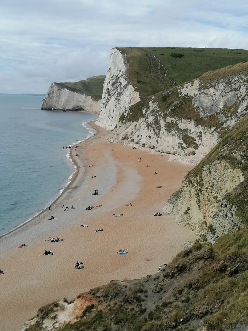 Es ist Dienstagnachmittag und endlich steigen wir wieder aus dem nach Schweiß riechenden Bus aus, doch wie sieht unser nächstes Ziel aus? Da ist ein Trampelpfad der durch den Wald führt, den ich und meine Gruppe gehen müssen, um dort anzukommen, wo wir hin wollen. Wir folgen immer dem Weg entlang zum Ziel. Nach ein paar anstrengenden Minuten, die wir durch den Wald wandern, kommen wir endlich aus dem Wald hinaus über einen Hügel, man kann schon von weitem das funkelnde Meer und die riesigen Klippen sehen. Jetzt nur noch den rutschigen Weg bergab und ein paar Treppen hinunter und schon sind wir da, bei der atemberaubenden englischen Küste. Es ist zu schön, um wahr zu sein: das salzige Wasser, türkisfarben wie in der Karibik, beruhigendes Meeresrauschen, glänzender Kieselstein-Strand und prächtige Steinklippen. In mir ein Gefühl der Freiheit und Unabhängigkeit! (Maya Sianghom)
