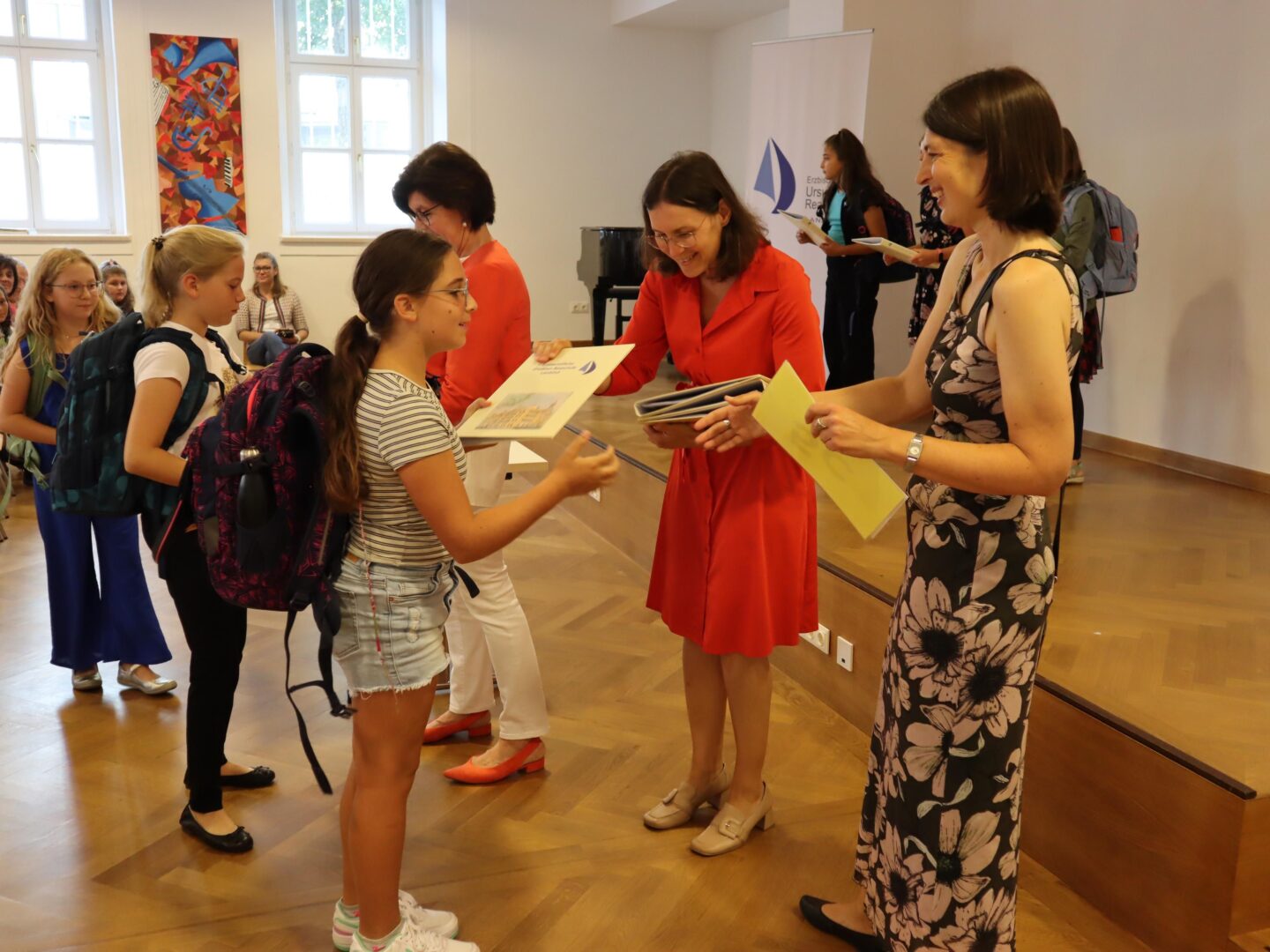 Laut Wikipedia versteht man unter Tradition „die Weitergabe (das Tradere) von Handlungsmustern, Überzeugungen, Glaubensvorstellungen“. Auch in diesem Schuljahr bemüht sich die Schulfamilie neben den Lehrplaninhalten wie bereits seit 355 Jahren an diesem Ort die Grundideen des Ursulinen-Ordens an Mädchen weiterzugeben. 60 muntere Schülerinnen sind heute in diese großen historischen Fußstapfen getreten und verbrachten ihren ersten Tag an der Ursulinen-Realschule. Angela Schleibinger begrüßte als Schulleiterin jede Fünftklässlerin mit Handschlag und einem geschliffenen Stein, der zum Glückstein werden möge. Danach erfolgte die Ersterkundung des neuen Klassenzimmers, wo allmählich dann auch der Abschied von den mitgekommenen Mamas und Papas erfolgte.Wir wünschen euch allen eine gute Eingewöhnung bei uns im Haus und viel Erfolg für eure Schulzeit. Schön, dass ihr da seid!