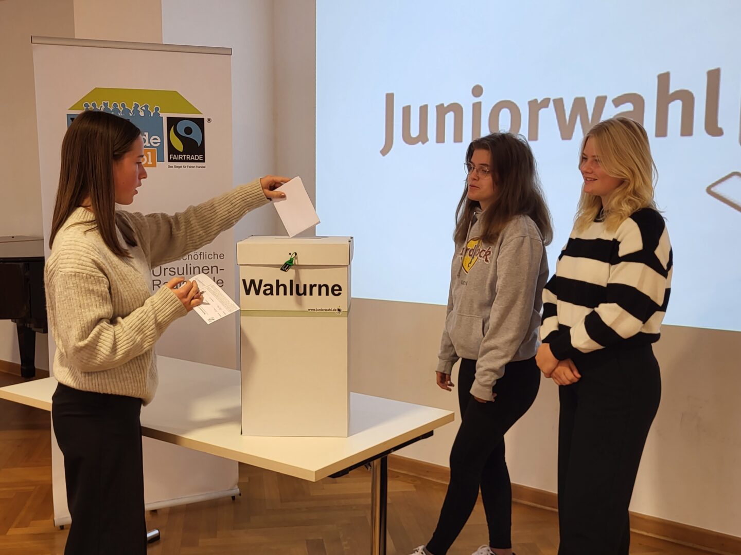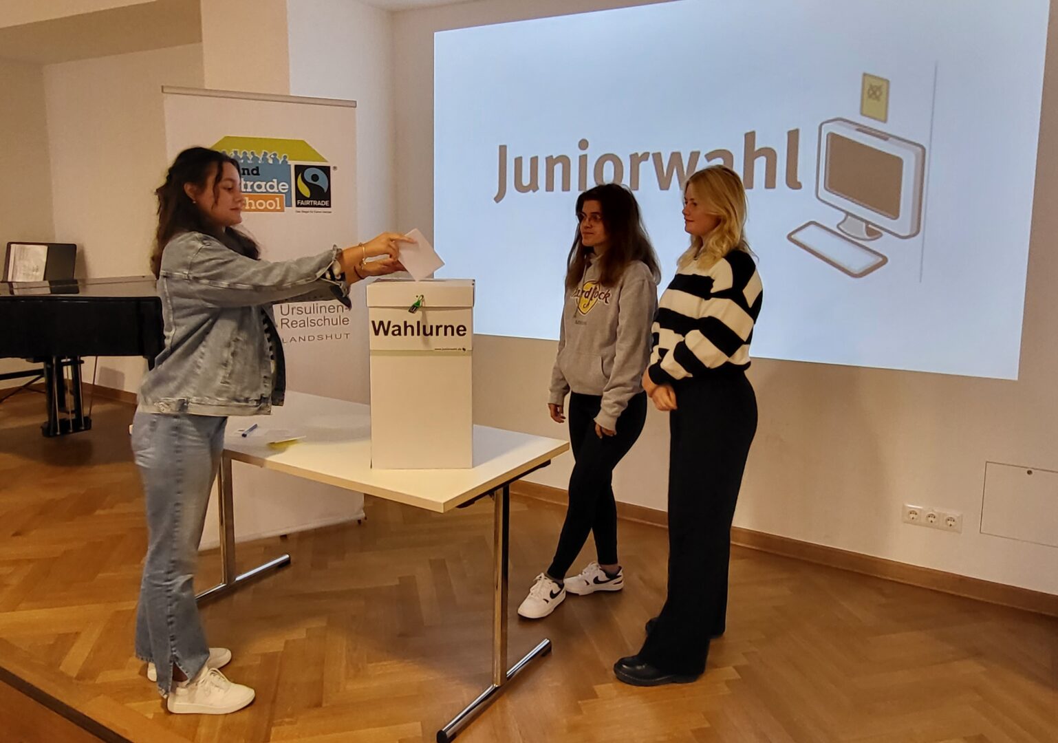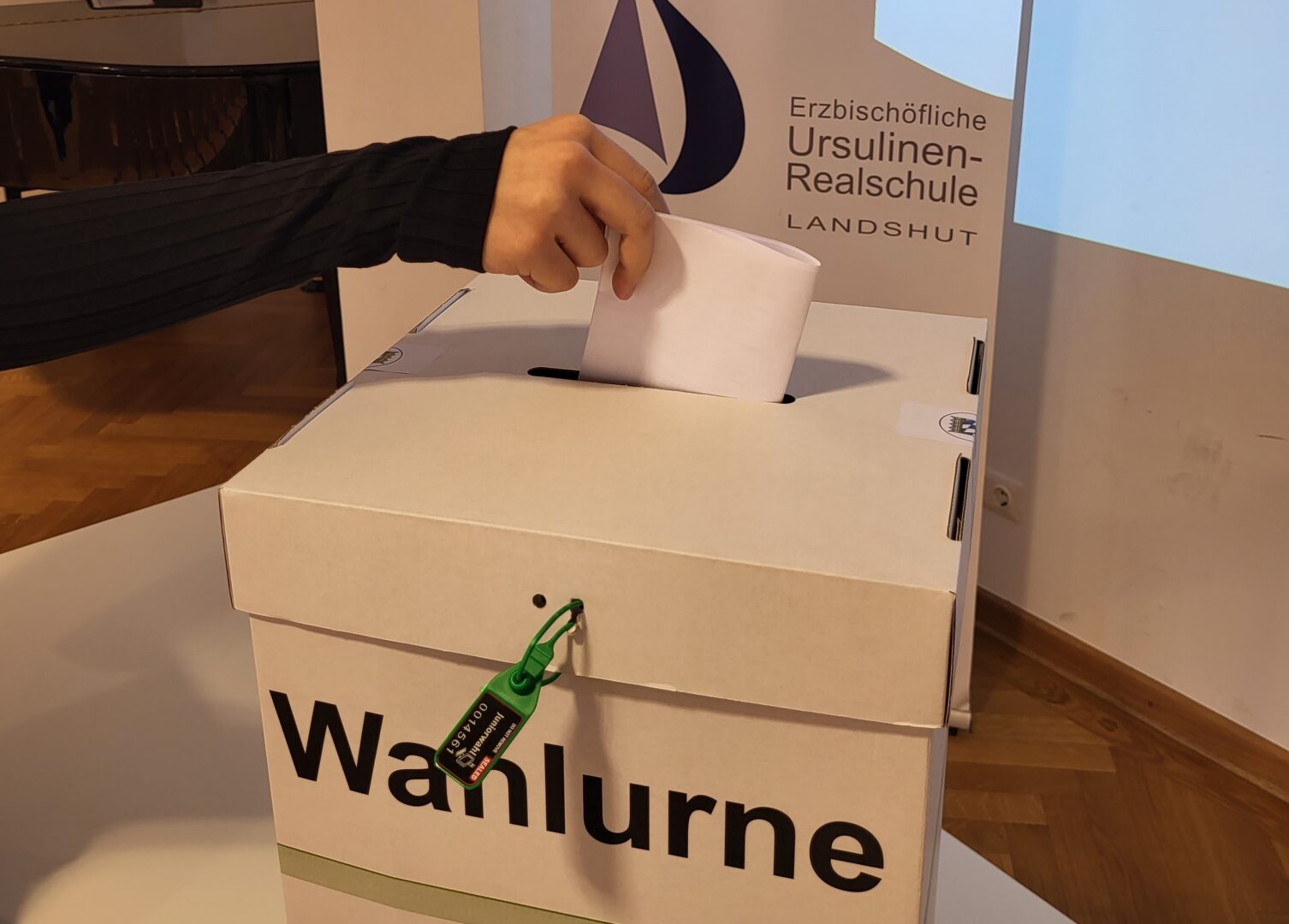 Ja, an unserer Schule geht das! Und das schon vor dem offiziellen Wahltermin in Bayern. Wir sind nämlich eine der Schulen in Bayern, die an derwww.juniorwahl.de/“ target=“_blank“ rel=“noopener noreferrer“>www.juniorwahl.de/bayern-2023.html“ target=“_blank“ rel=“noopener noreferrer“>Juniorwahlteilnimmt. Damit unsere Schülerinnen in den nächsten Jahren ihr politisches Wörtchen mitreden, durften die Zehntklässlerinnen schon einmal einen Probelauf absolvieren und wenige Tage vor der diesjährigen Wahl des Bayerischen Landtags in ein improvisiertes Wahllokal an der Schule gehen.„Demokratie lebt vom Mitmachen – und das kann man lernen. Deshalb freut es mich sehr, dass so viele Schulen bei der Juniorwahl 2023 mitmachen. Denn dabei erleben junge Menschen, die noch nicht wahlberechtigt sind, Politik und Demokratie aktiv und hautnah. Gleichzeitig leistet das Projekt einen wichtigen Beitrag für die Entwicklung eines demokratischen Rechtsverständnisses. Das ist angesichts der Anfeindungen unserer Demokratie von innen wie von außen so wichtig wie nie.“ – SoLandtagspräsidentin Ilse Aigner,die zusammen mit Kultusminister Michael Piazolo die Schirmherrschaft für die Landtagsjuniorwahl in Bayern übernommen hat. Zugespitzter formuliert es der Kabarettist Hagen Rether: „Wählen musst du. Das ist wie Zähneputzen: Wenn du’s nicht machst, wird’s braun.“Auch wenn die Stimmen unserer Schülerinnen natürlich noch nicht in das Ergebnis der echten Landtagswahl einfließen, steigt nach einer wissenschaftlichen Begleituntersuchung die Wahlbeteiligung bei den Eltern der teilnehmenden Schüler um mindestens vier Prozent. Und der Anteil der künftigen Nichtwähler sinkt bei den Jugendlichen die an einer Juniorwahl teilgenommen haben, von 22 Prozent auf 7 Prozent.Voraus geht der eigentlichen Juniorwahl eine intensive Vorbereitung im Unterricht, die federführend von der SozialkundelehrerinSilvie Gruberin die Wege geleitet wurde.Das Ergebnis der Juniorwahl wurde zeitgleich mit der Veröffentlichung der ersten Prognose der echten Landtagswahl am 8. Oktober um 18:00 Uhr aufwww.juniorwahl.debekannt gegeben.