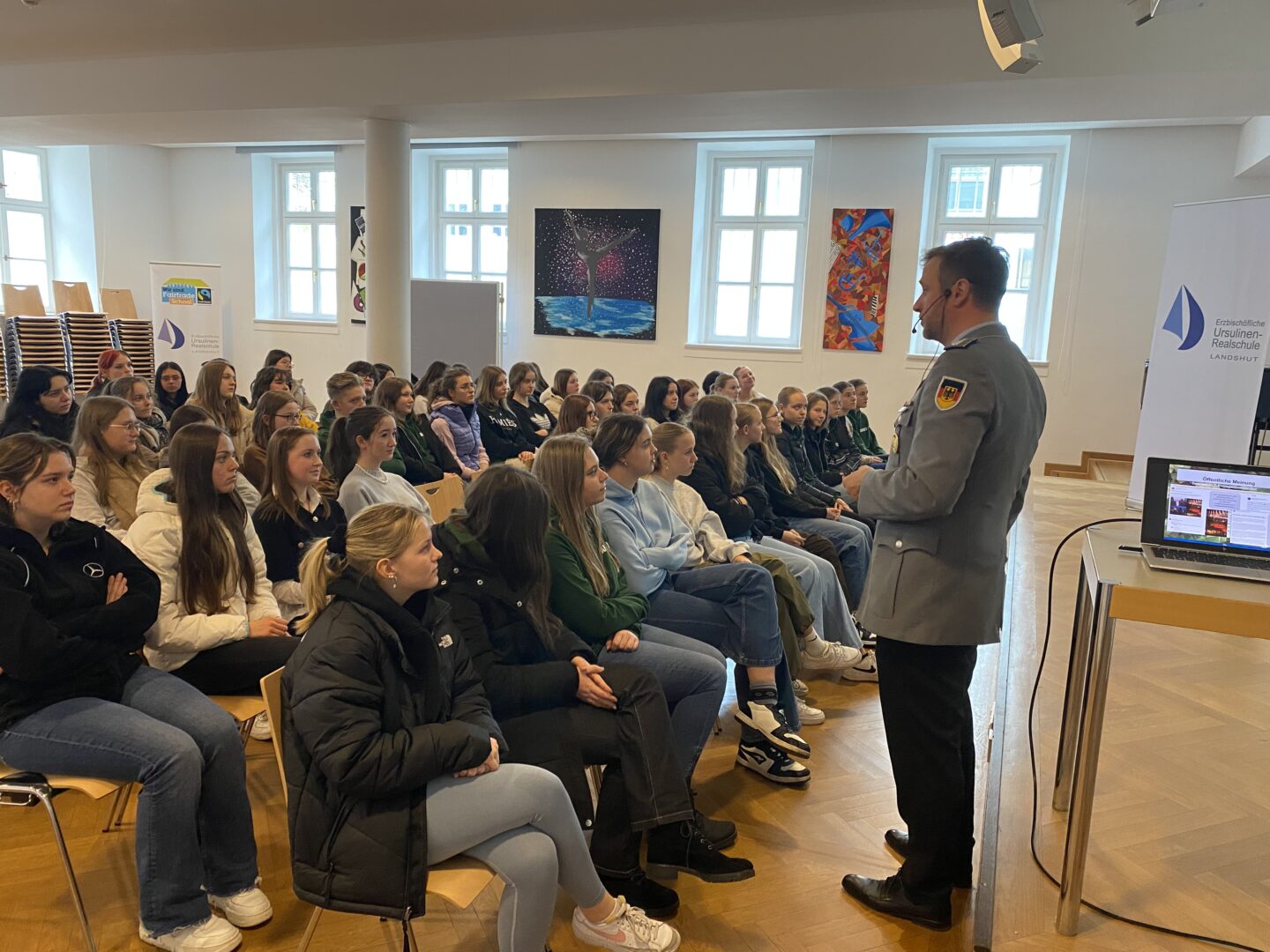 Am vergangenen Montag besuchteJugendoffizier Klaus Schedlbauerunsere Schule, um den Schülerinnen derzehnten Klassenim Rahmen des Unterrichts inPolitik und Gesellschafteinen Vortrag zu halten.Schedlbauer begann den Vortrag, indem er den Schülerinnen die Hintergründe und Ursachen des Ukraine-Krieges erläuterte und aufzeigte, wie unterschiedlich die Perspektiven auf den Konflikt sein können. Er betonte dabei die Bedeutung einer kritischen Auseinandersetzung mit verschiedenen Meinungen und der Vermeidung von Fehlinformationen und Vorurteilen.Ein besonderes Augenmerk legte Herr Schedlbauer auf die Themen Fake-News und Bildmanipulationen, die in der heutigen Zeit eine große Bedeutung haben. Er zeigte den Schülerinnen auf, wie leicht es ist, Informationen zu manipulieren und wie wichtig es ist, diese kritisch zu hinterfragen.Zum Abschluss seines Vortrags sprach Schedlbauer über die Bedeutung einer wehrhaften Demokratie. Er betonte, dass es wichtig sei, die Freiheit und die demokratischen Rechte zu schützen und dass es jedem Einzelnen obliege, sich für die Demokratie einzusetzen.Die Schülerinnen waren von dem Vortrag von Herrn Schedlbauer angetan und hatten viele Fragen, die Schedlbauer engagiert beantwortete.