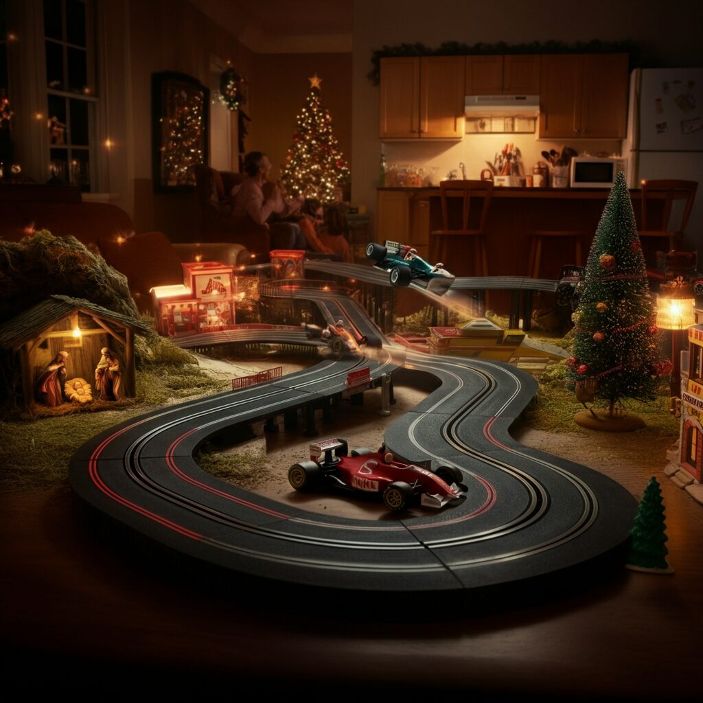 Zurück zu Heilig Abend, sobald ich das Paket artgerecht aufgerissen hatte, war es mein Vater, der sich auf das Spielzeug stürzte und sofort begann, die Bahn aufzubauen. Dagegen hatte ich nichts, da ich auch nicht vorgehabt hatte, sie aufzubauen. Während er den großen Wunsch seiner Kindheit mitten im Wohnzimmer errichtete, fiel ihm auf, dass das Zimmer wohl etwas zu klein für die monströse Rennstrecke ausfiel. Damit sie in das Zimmer gepasst hätte, hätte der Weihnachtsbaum weichen müssen. Da kam mein Vater auf die geniale Idee, die Strecke mit dem Baum zu kombinieren, denn dort wo er stand, hätte eine Kurve sein sollen. Bloß die Krippe musste der schwarzen Plastikfahrbahn weichen. Anstatt sie einfach wegzuschieben, bekam sie einen anderen Platz. In einem Stall die Nacht zu verbringen, ist sicherlich schlimm, aber in einem Stall neben der Autobahn ist dann wohl noch etwas extremer. Nachdem mein Vater nun endlich seine ingenieurstechnische Meisterleistung fertiggestellt hatte, ließ er mich gütigerweise auch einmal mit meinem Geschenk spielen. Ich nahm die Fernsteuerung in die Hand und er erklärte mir kurz, wie alles funktionierte. Gerade hatte er gesagt: „Bitte erst ganz langsam auf das Gas drücken!“ - Da hatte ich den Knopf schon bis zum Anschlag nach unten gedrückt. Das kleine Formel 1-Auto gab ein lautes Quietschen von sich und schoss sofort los, auf die Kurve mit integriertem Weihnachtsbaum zu. Die Kurve hatte eine kleine Erhöhung, weshalb das Auto die Erhebung hochraste. Dann hob es direkt in der Kurve ab und flog geradewegs auf den schönen Weihnachtsbaum zu. Keine Ahnung wie das Fahrzeug es durch den dichten Baum schaffte, aber es landete ein paar Meter entfernt von ihm und erreichte tatsächlich noch die Küche. Da kam der Wagen endlich zum Stillstand.
