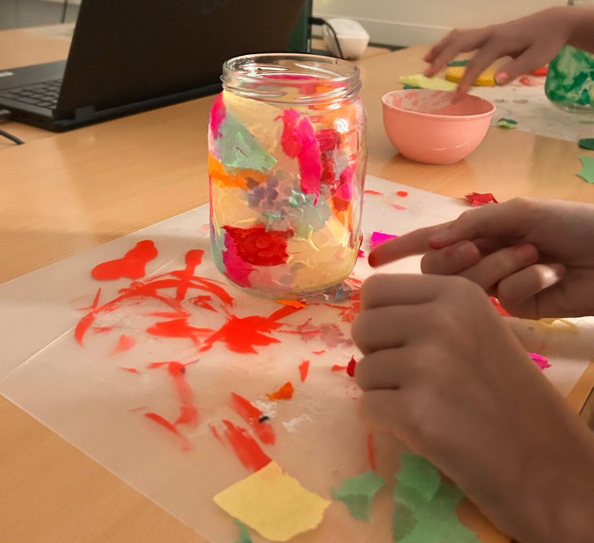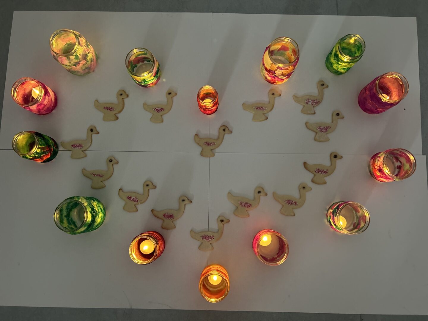 Jedes Jahr um den 11. November erhellen die Laternen der Kinder Städte und Dörfer in halb Europa. Der Heilige Martin ist ein Prototyp eines Heiligen und wird seit über 1600 Jahren von Christen in allen Konfessionen verehrt. Die Geschichte seiner Wandlung vom Elitesoldaten des Kaisers zum asketischen Soldaten Gottes inspiriert bis heute – so auch dieSchülerinnen der Klasse 6b, die unter der Anleitung vonMichaela Braun und Judith Wössmoderne Laternen anlässlich Sankt Martin gestalteten: Mit buntem Transparentpapier verzierten sie Gläser, die nun leuchtend in vielen Farben erstrahlen. Die selbstgemachten Laternen wurden liebevoll in einer Herzform arrangiert, in deren Mitte selbstgebackene Gänseplätzchen, die symbolisch an die im 15. Jahrhundert aufgekommene Legende erinnern, wonach Martin sich im Gänsestall vor der Ernennung als Bischof versteckt haben soll. Deren schnatternder Verrat hat ihn dann aber doch in jenes Amt gehievt, das er mit der für ihn so charakteristischen Herzensliebe gefüllt hat.