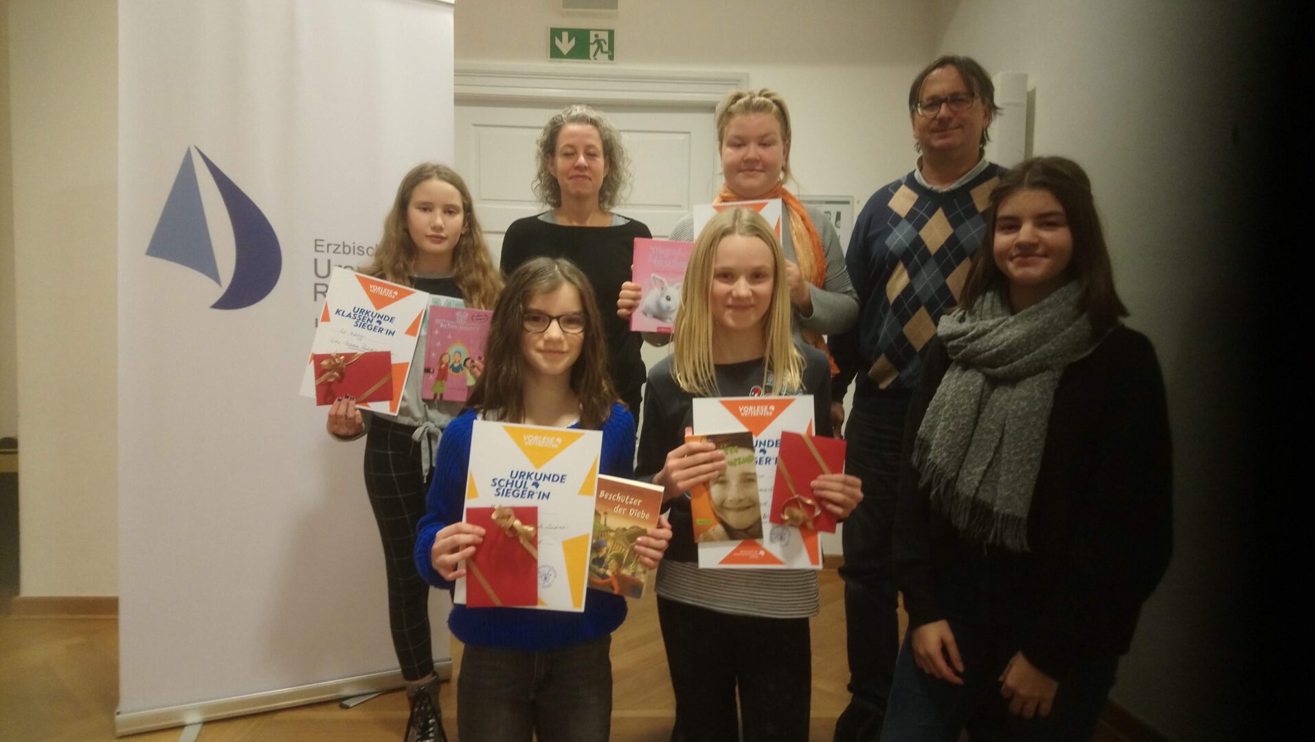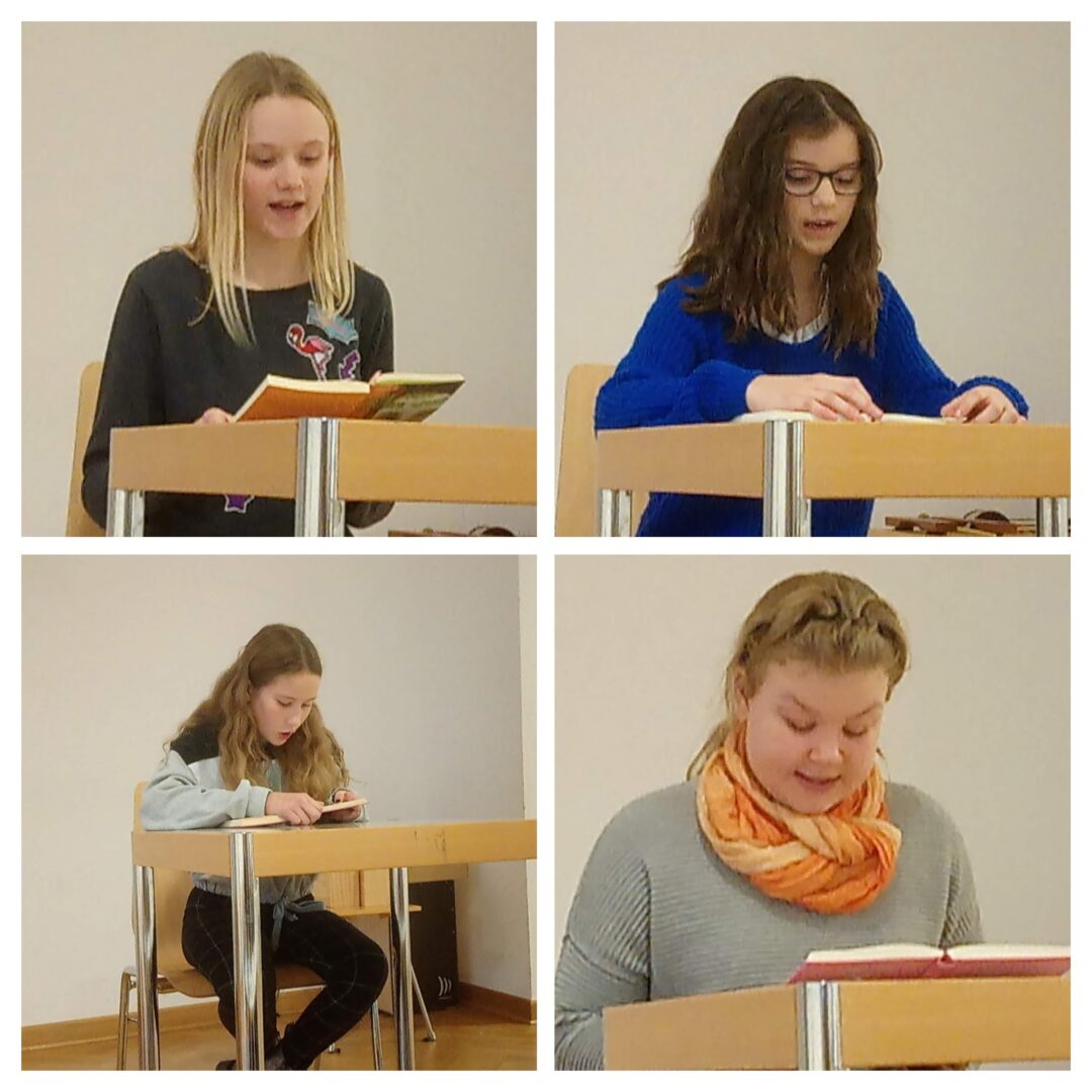 Eine zufällig beobachtete Entführung, eine atemlose Jagd. Das erleben drei Freunde in Berlin. Die Spannung dieses Buches ließ Melisa Prokshi (6a) beim diesjährigen Vorlesewettbewerb an unserer Schule den Zuhörern spüren. Sie hatte sich in der ersten Runde, in der die Schülerinnen ein selbtsgewähltes Buch vorstellen, eine Passage aus Buch Andreas Steinhöfels „Beschützer der Diebe“ ausgesucht. In ihrem Vortrag gelang es ihr besonders gut, diesen ungewöhnlichen Vorfall lebendig werden zu lassen. Auch die Vertreterinnen der anderen sechsten Klassen, Miriam Gunser (6c), Lilli Richter (6d) und Victoria Russ (6b) lasen sehr flüssig und überzeugend aus ihren selbstgewählten Texten vor. Über den Sieg entschied dann die zweite Runde, in der die Jury den Teilnehmerinnen einen unbekannten Text vorlegte. Hier galt es eine anspruchsvolle Passage aus Karin Barons Winterkrimi „Tote tragen keine Pelzmütze“ zum Besten zu geben. Da auch hier die Mädchen hochkonzentriert zu Werke gingen, war es für die Jury nicht leicht, eine Siegerin zu küren. In der Jury saßen Schülersprecherin Elena Gulich als Vertreter der Schülerinnen, Isabelle Valina als Vertreterin der Eltern sowie Dr. Rainer Hauke, stellvertretend für die Deutschlehrer. Bei der Siegerehrung erhielten die vier Klassensiegerinnen jeweils eine Urkunde und einen Buchgutschein, der vom Elternbeirat der Schule gestiftet wurde.Melisa Prokshi wird in der nächsten Wettbewerbsrunde nun die Ursulinen-Realschule vertreten. Insgesamt werden in diesem Schuljahr über 700.000 Schülerinnen und Schüler um den Bundessieg im traditionsreichen Vorlesewettbewerb kämpfen.