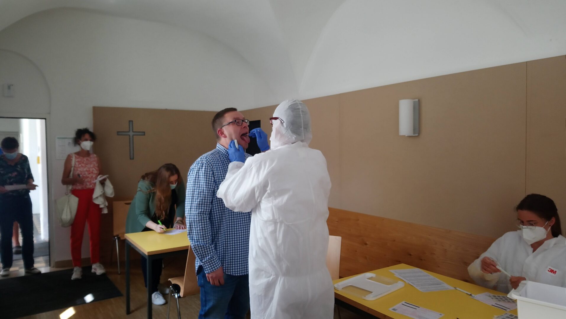 Nein, sie stehen nicht in der Wartehalle eines europäischen Flughafens Schlange, sondern im Pausenhof ihrer Schule. Über 60 Lehrerinnen und Lehrer waren in dieser letzten Ferienwoche freiwillig gekommen, um sich ein Wattestäbchen tief in den Rachenraum stecken zu lassen.
