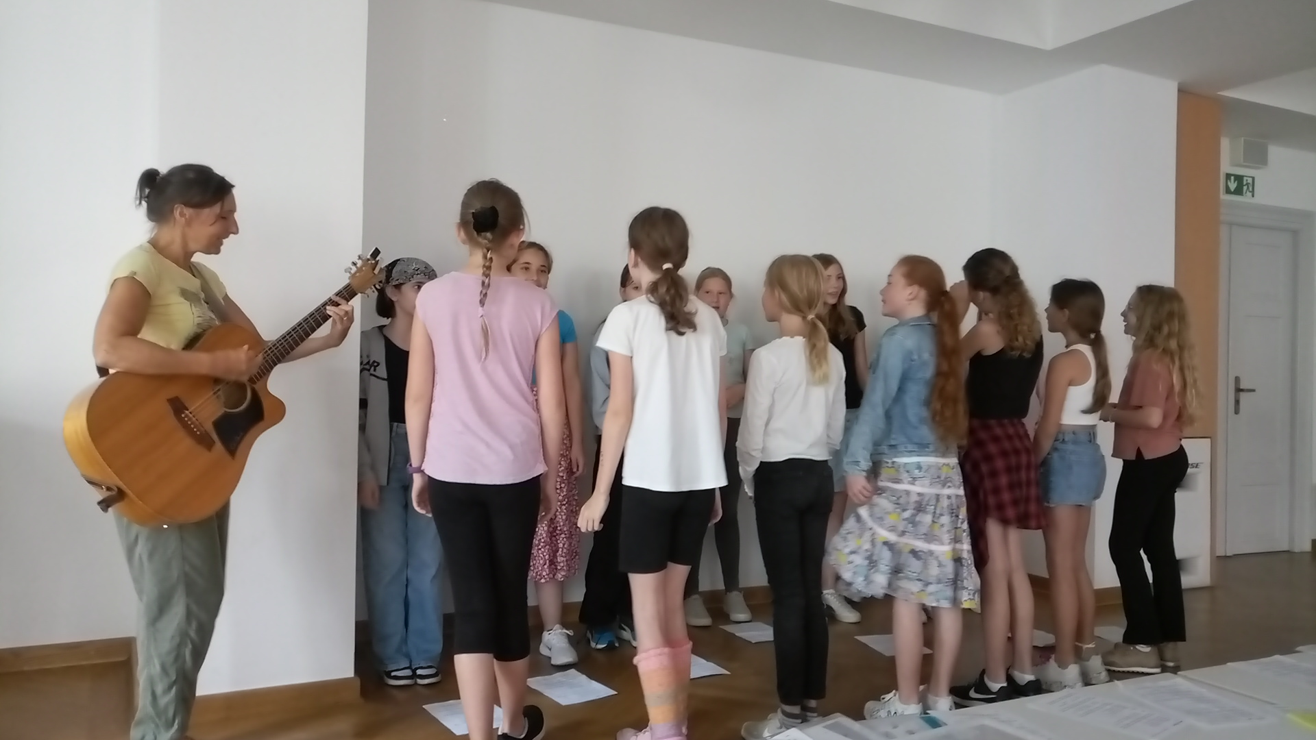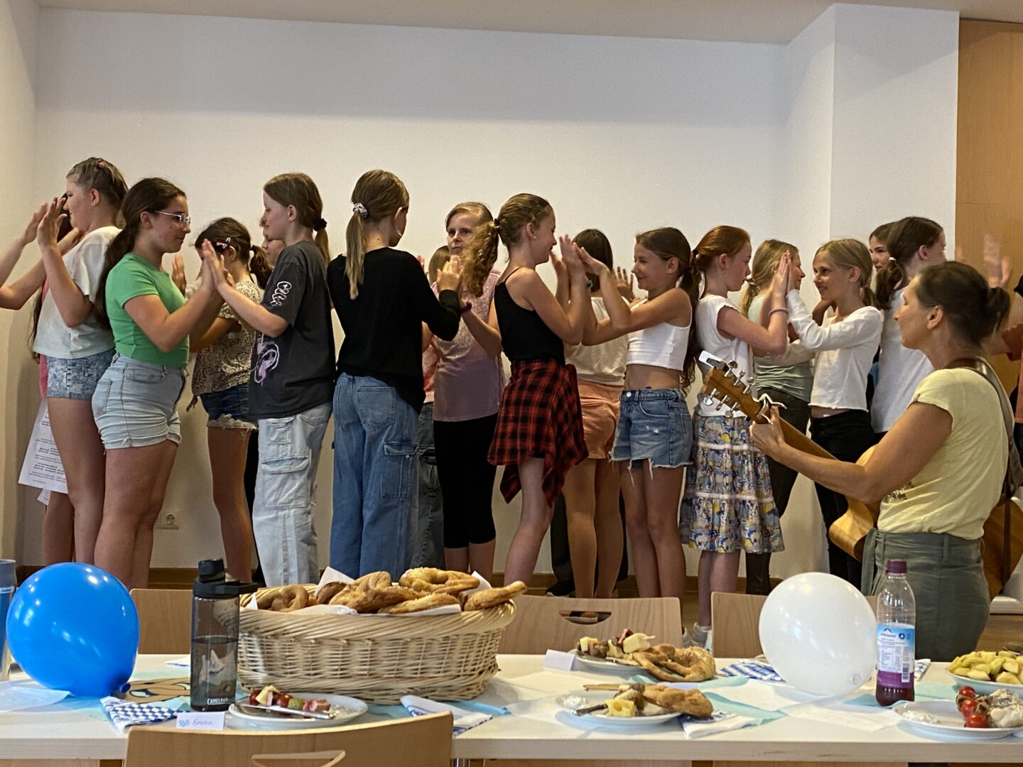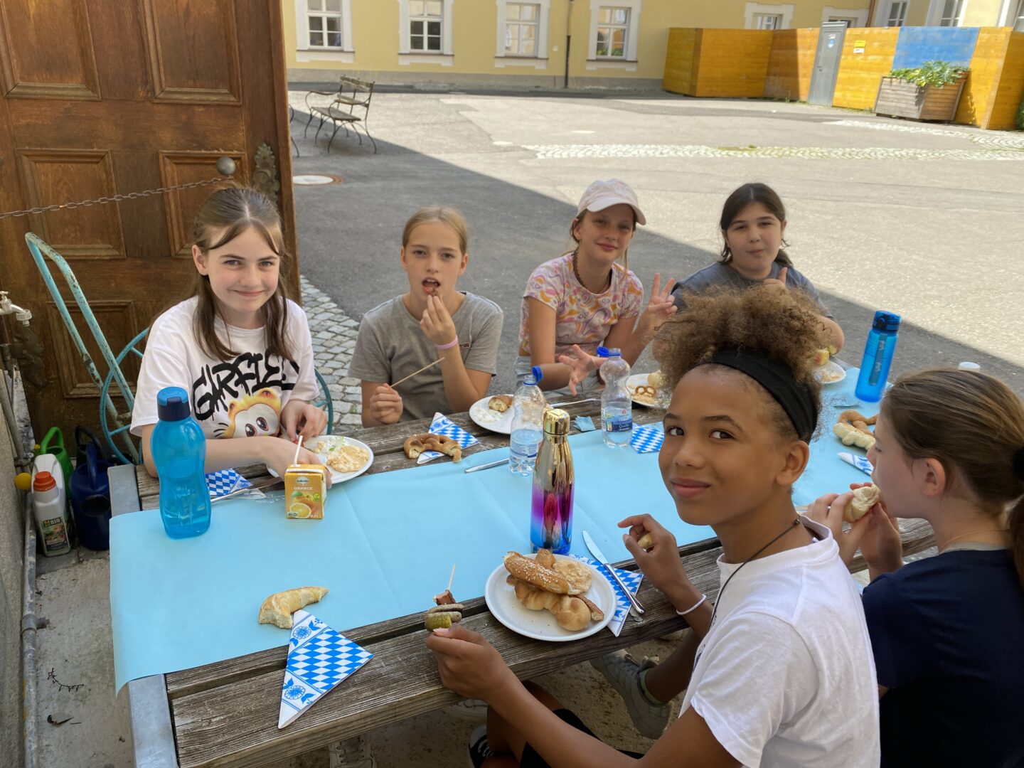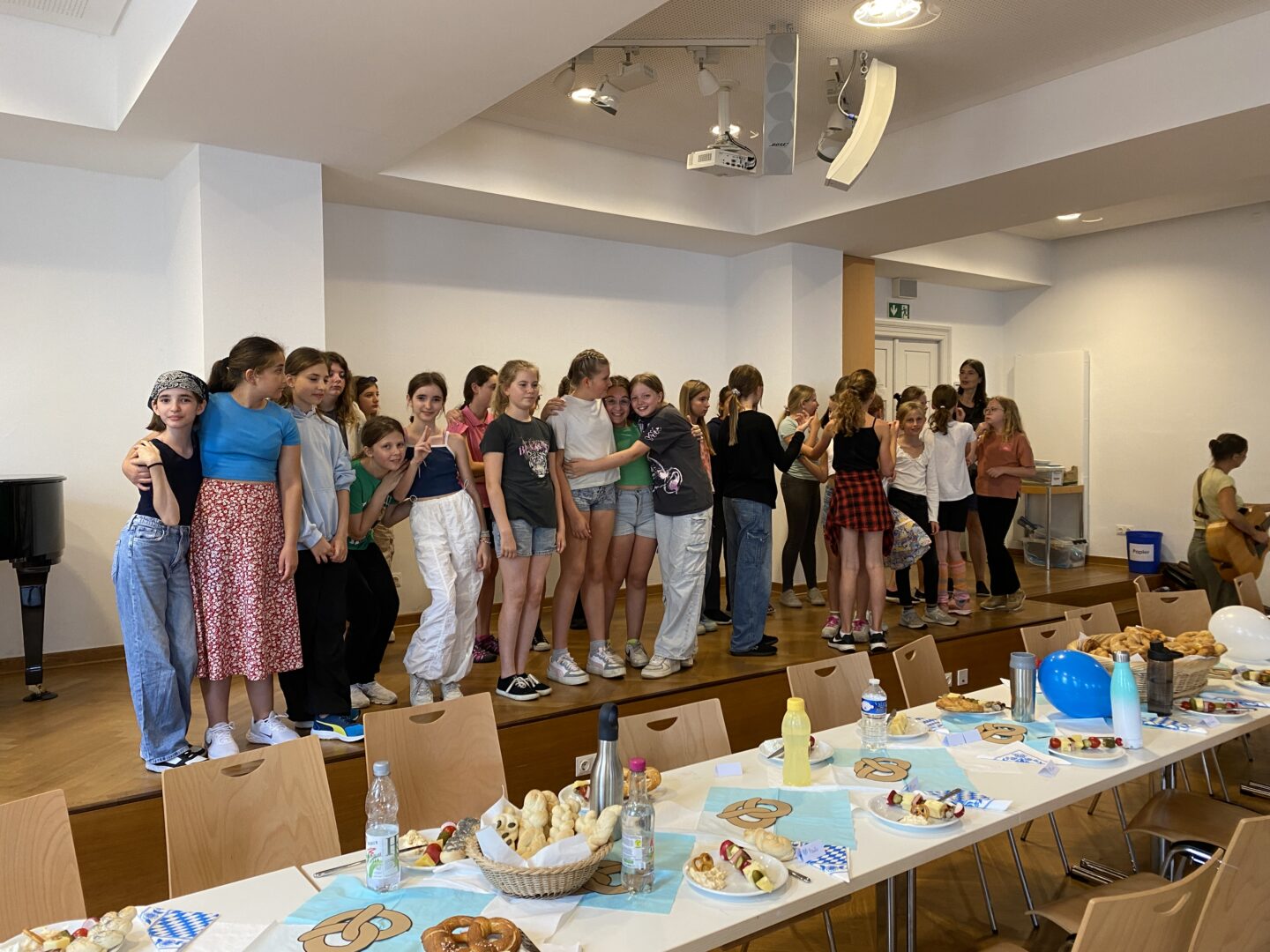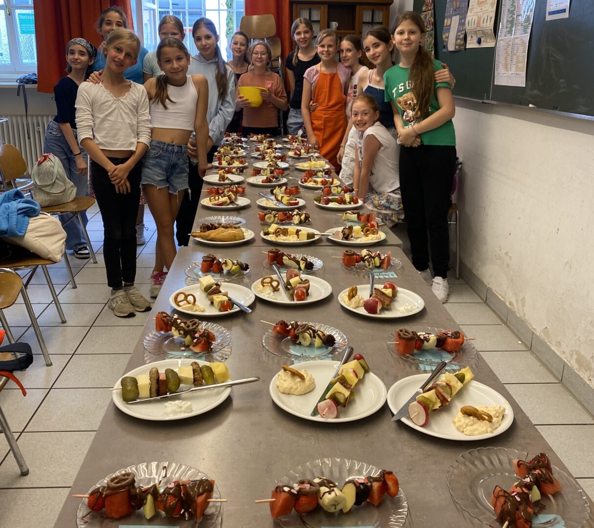 Die Klassen wurden in zwei Gruppen aufgeteilt und wechselten zwischen der Küche und musikalischen Workshops.Judith Wöss, Lehrerin für Hauswirtschaft und Ernährung, leitete denkulinarischen Teil, unterstützt vonDr. Alexandra Schrempf. Mit viel Begeisterung und Geschick formten die Mädchen Brezen und Zöpfe und bereiteten einen „Bayerischen Brotzeitspieß“ zu. Auch ein Obatzta- und Kräuterquark-Aufstrich wurden hergestellt. Als süße Belohnung gab es einen Schoko-Obstspieß und ein kleines Eis.