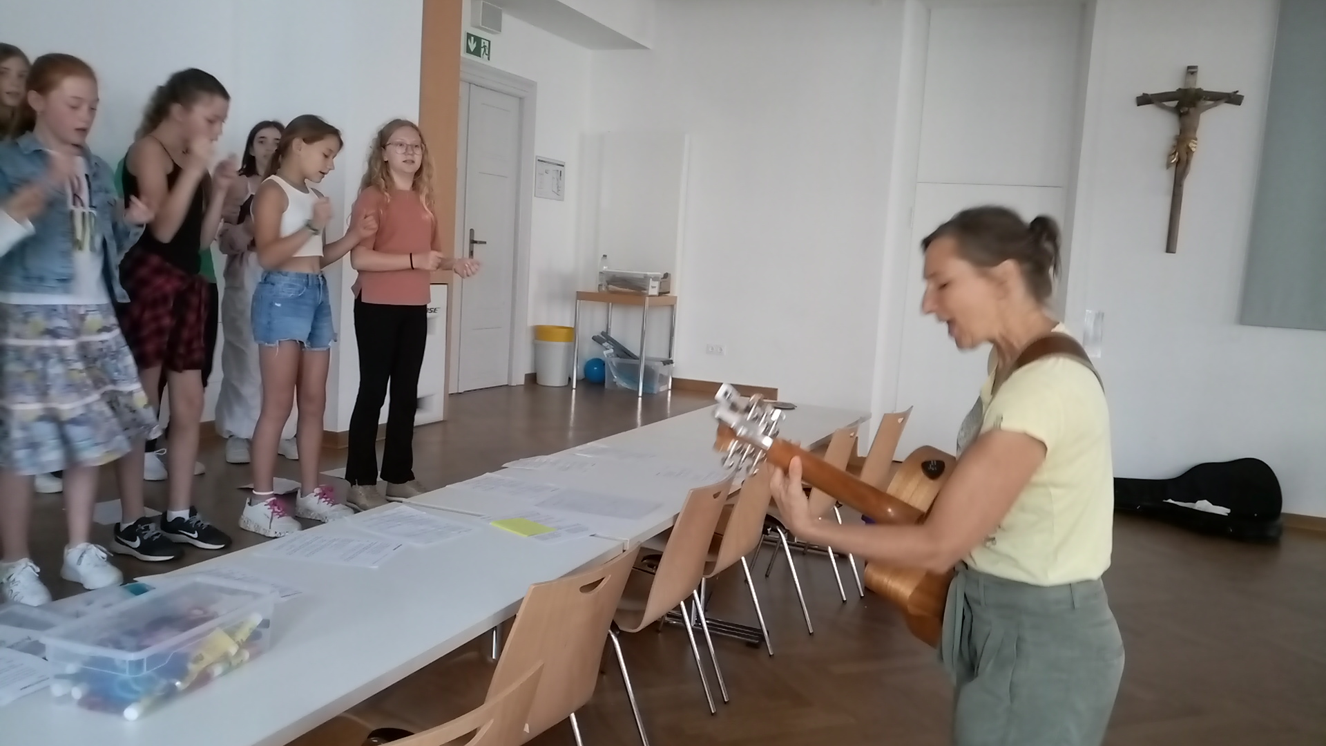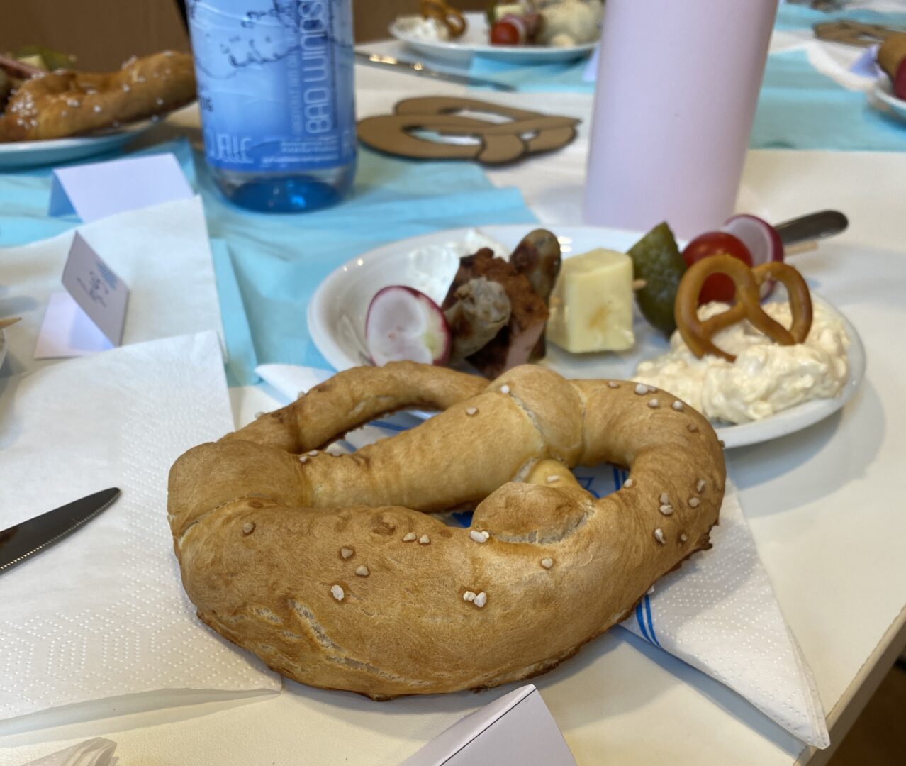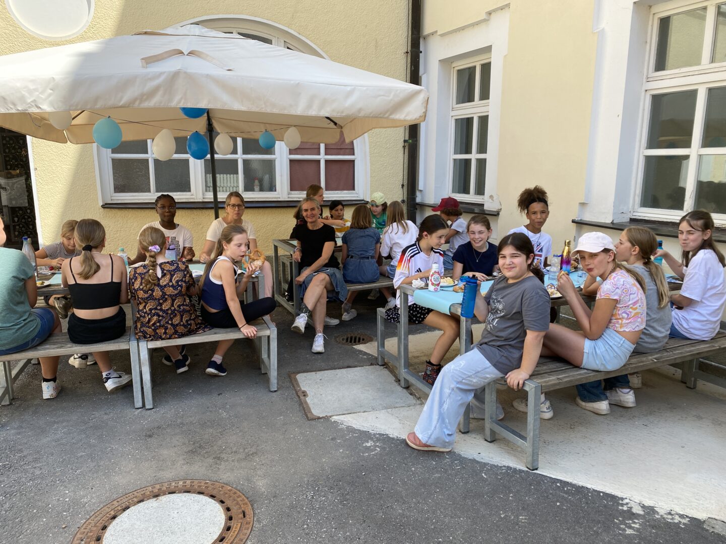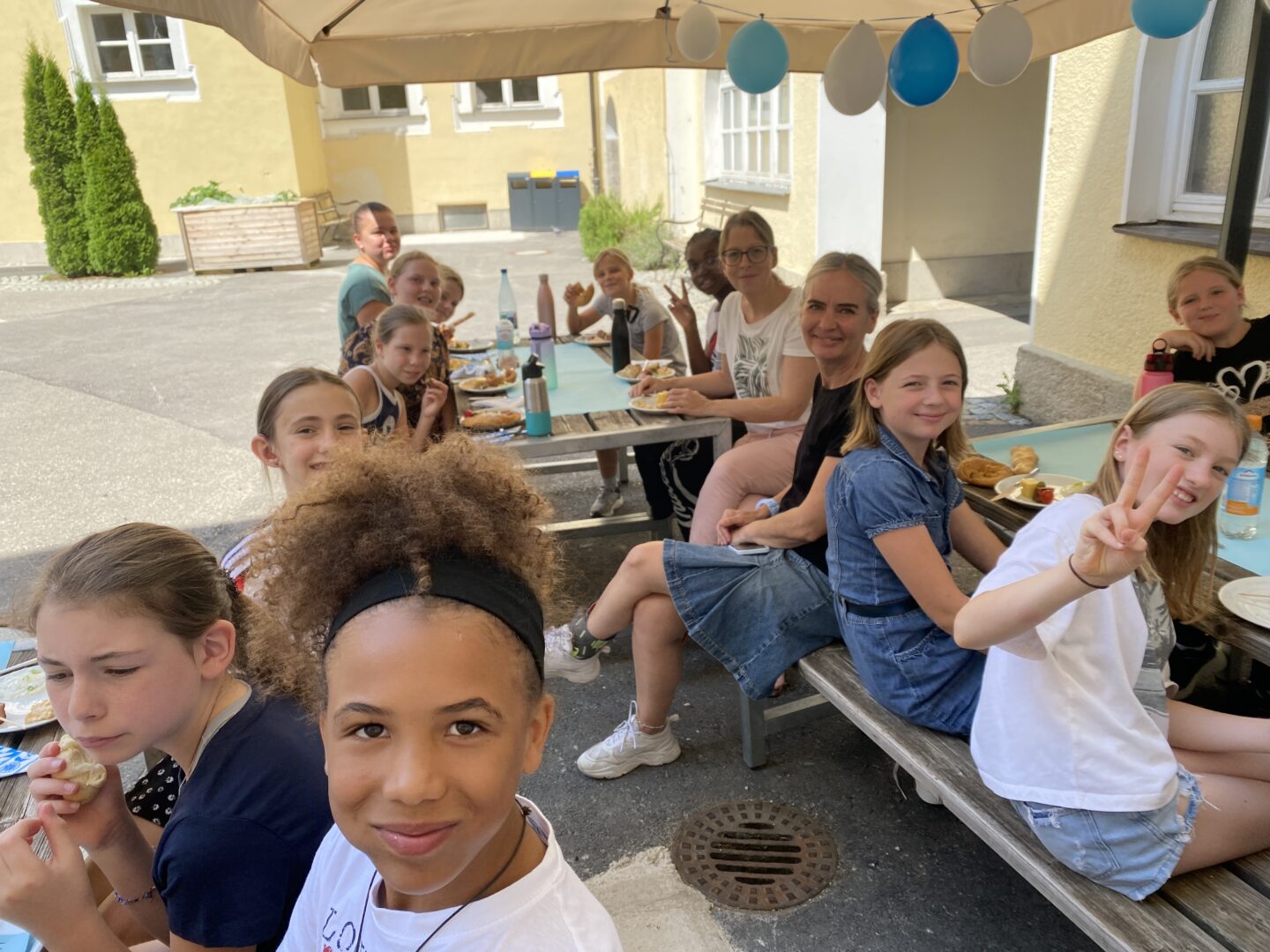 „Bleib oiwei auf da Sunnseitn vom Lem!“ – Der eingängige Refrain aus Helga Brenningers Lied sowie der Jodelruf am Ende fassen die Tage des bayerischen Brauchtums am besten zusammen, die in den Klassen 5b und 5c in der vergangenen Woche stattgefunden haben.Die Klassen wurden in zwei Gruppen aufgeteilt und wechselten zwischen der Küche und musikalischen Workshops.Judith Wöss, Lehrerin für Hauswirtschaft und Ernährung, leitete denkulinarischen Teil, unterstützt vonDr. Alexandra Schrempf. Mit viel Begeisterung und Geschick formten die Mädchen Brezen und Zöpfe und bereiteten einen „Bayerischen Brotzeitspieß“ zu. Auch ein Obatzta- und Kräuterquark-Aufstrich wurden hergestellt. Als süße Belohnung gab es einen Schoko-Obstspieß und ein kleines Eis.Die Schülerinnen gestalteten auch die Tische liebevoll und kreativ. „Viele Köchinnen verderben den Brei nicht, sondern das Kochen im Team macht viel Spaß und ist erstaunlich produktiv“, fasste Judith Wöss den Tag zusammen. Alle waren überrascht, wie viel in der kurzen Zeit zubereitet wurde.Den musikalischen Part übernahm die sympathische LiedermacherinHelga Brenninger aus Dorfen. Mit ihrer Gitarre und einem kleinen Jodelkurs, der nicht die Komplexität des Futur II bei Sonnenaufgang auslotete , sondern einfach Spaß am Jodeln erweckte, brachte sie die Schülerinnen zum Singen und Jodeln. Ihre Texte und Melodien, die tief in die bairische Seele blicken lassen, berührten die Herzen der Schülerinnen.Helga Brenningerist bekannt dafür, die kleinen und einfachen, aber wichtigen Dinge des Lebens in ihren Liedern zu feiern und Hoffnung, Fröhlichkeit und Sanftmut zu wecken.Die Fotos vom Projekttag zeigen strahlende Gesichter und liebevoll gestaltete Tische, die den Erfolg und die Freude dieses besonderen Tages widerspiegeln.