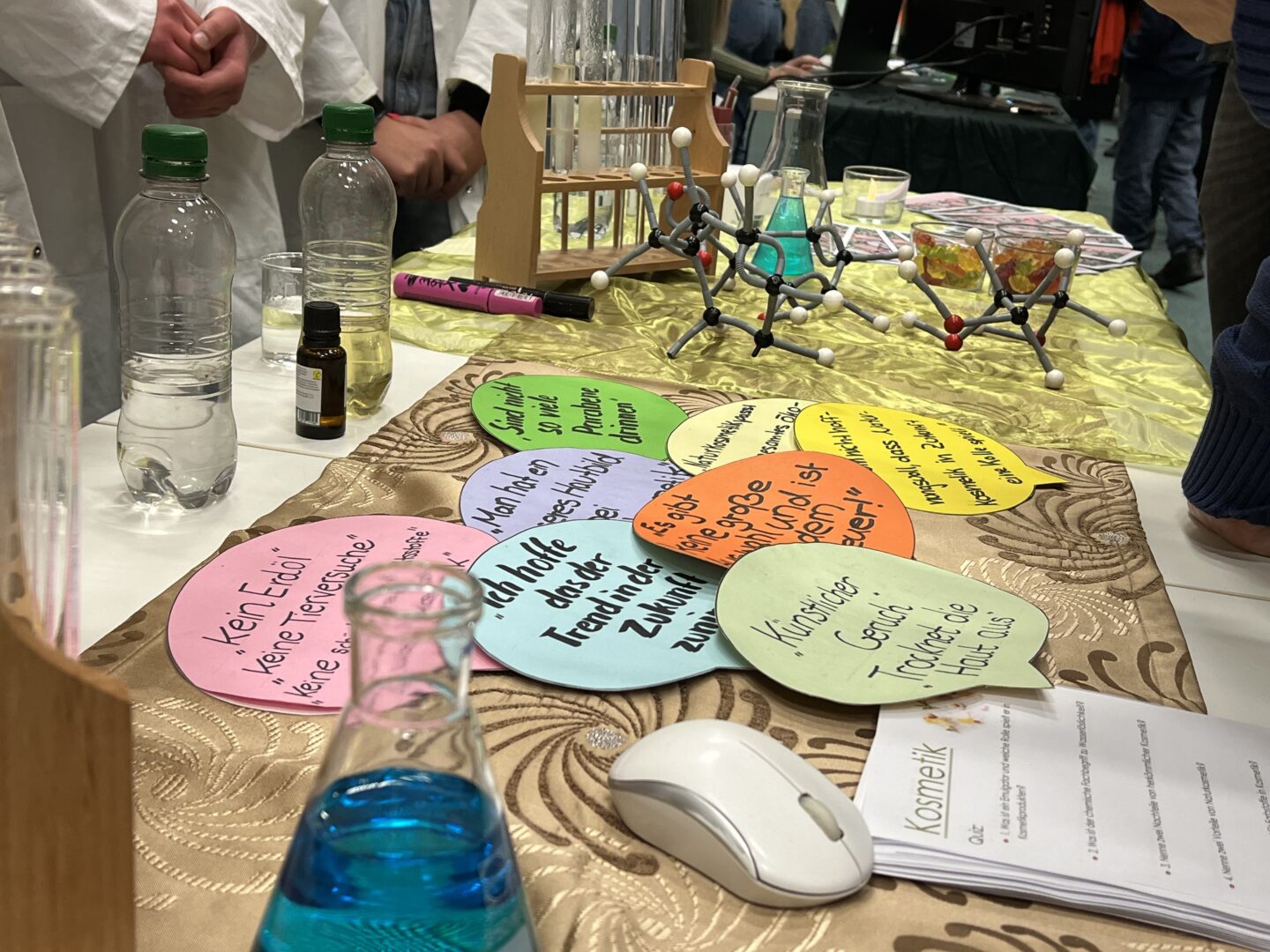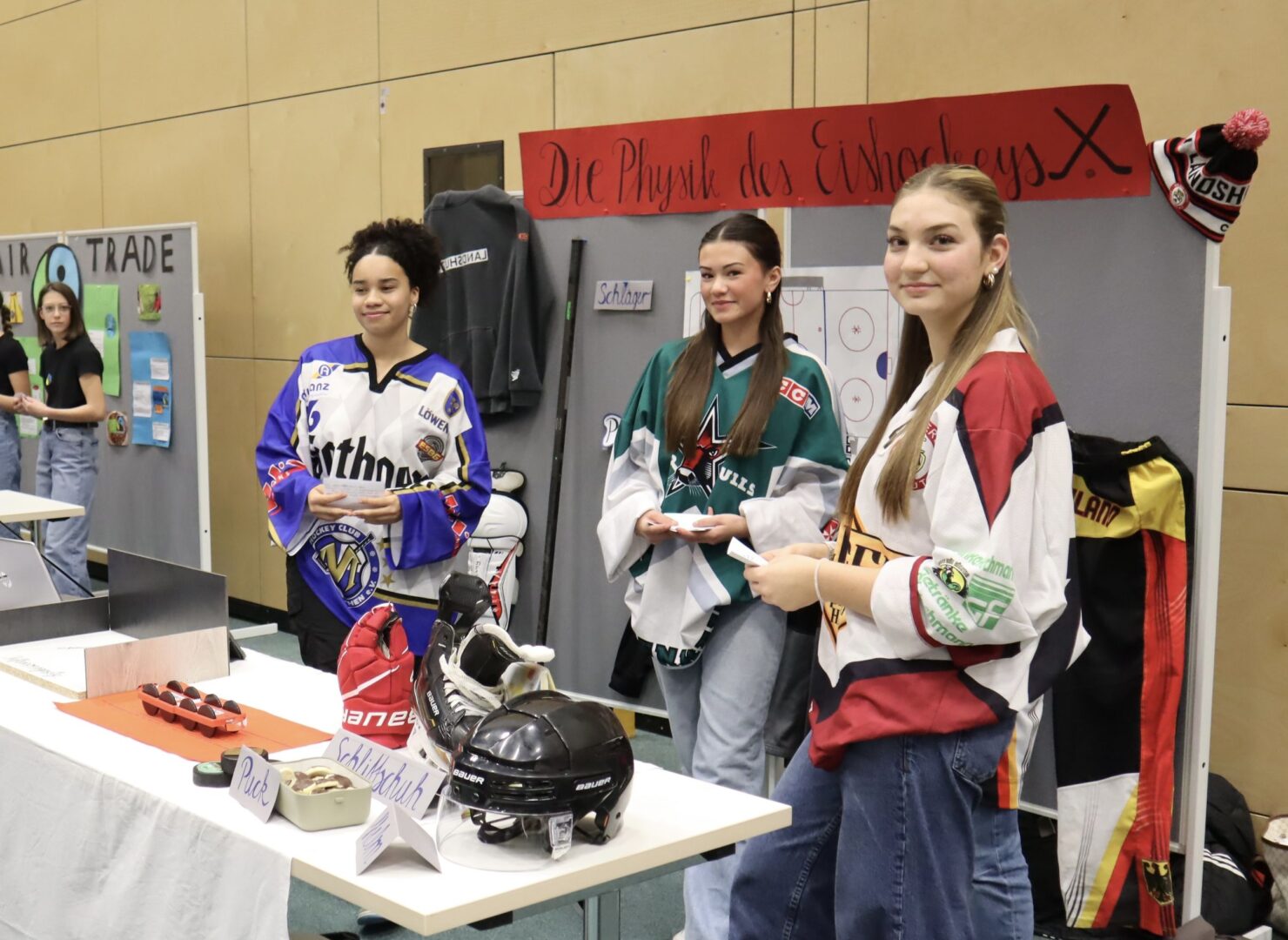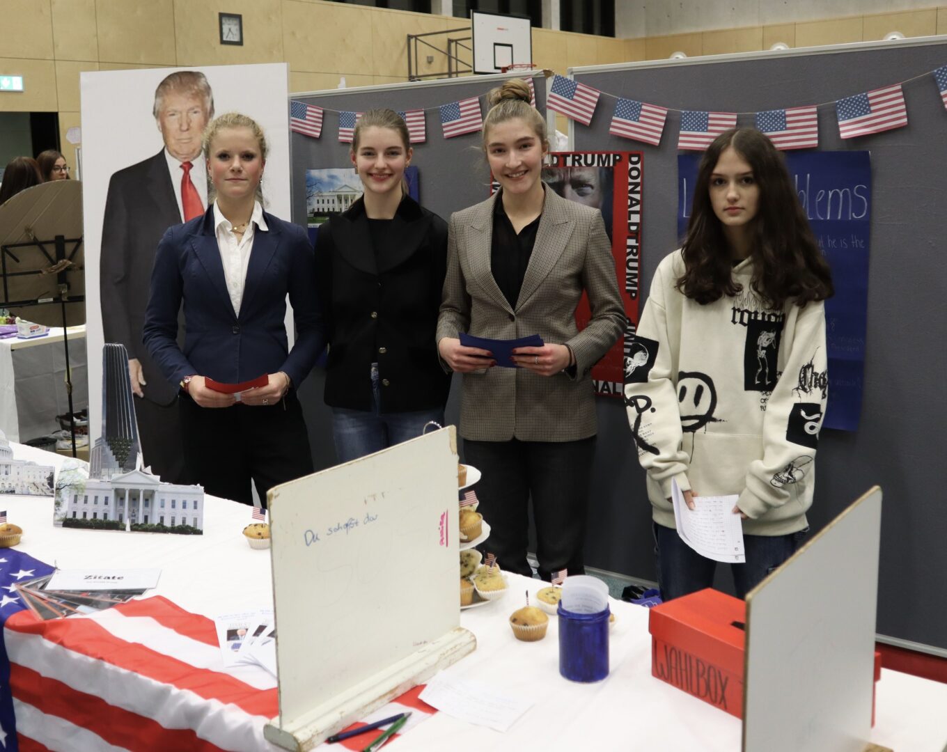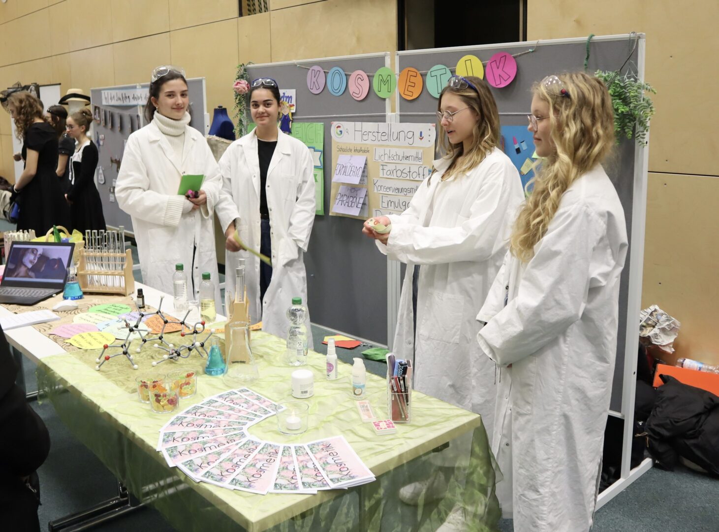 Donald Trump beobachtet zusammen mit Eishockey-Spielerinnen einen blubbernden Vulkan. Fotoapparate sind auf Flugzeuge gerichtet. Queen Victoria macht einen Abstecher nach Neuseeland. Nein, es handelt sich hier nicht um die Beschreibung der bewegendsten Momente in einem der derzeit häufig anzutreffenden Jahresrückblicke 2023, sondern um die Projektpräsentation der 9.Klasse zum Thema „Das bewegt mich“. Seit mehreren Wochen ackerten die Mädchen in ihren Gruppen sowohl an den Projekttagen in der Schule als auch an vielen Nachmittagen zu Hause, führten Interviews und Umfragen durch und durchforsteten das Internet nach Informationen, um das Beste aus dem gewählten Thema zu machen. Denn neben dem Wunsch nach guten Noten im Betreuungsfach, Deutsch und IT, sorgte der Besuch von vielen Eltern und Freunden bei der Präsentationsmesse für eine gehörige Portion Aufregung. Wie die begeisterten Gesichter der Gäste aber belegten, hat sich der Aufwand gelohnt. Man konnte sich Anregungen für Auslandsreisen nach Südamerika oder Frankreich holen, Berufsperspektiven bei der Kripo oder Apotheke ausloten, Fachwissen zum Thema Kosmetik oder Vulkanismus erwerben und vieles, vieles mehr. Wir bedanken uns bei den Neunklässlerinnen für den tollen Abend und die informativen Vorträge. Es ist spannend zu sehen, welch tolle Talente in so einem Projekt zum Vorschein kommen.