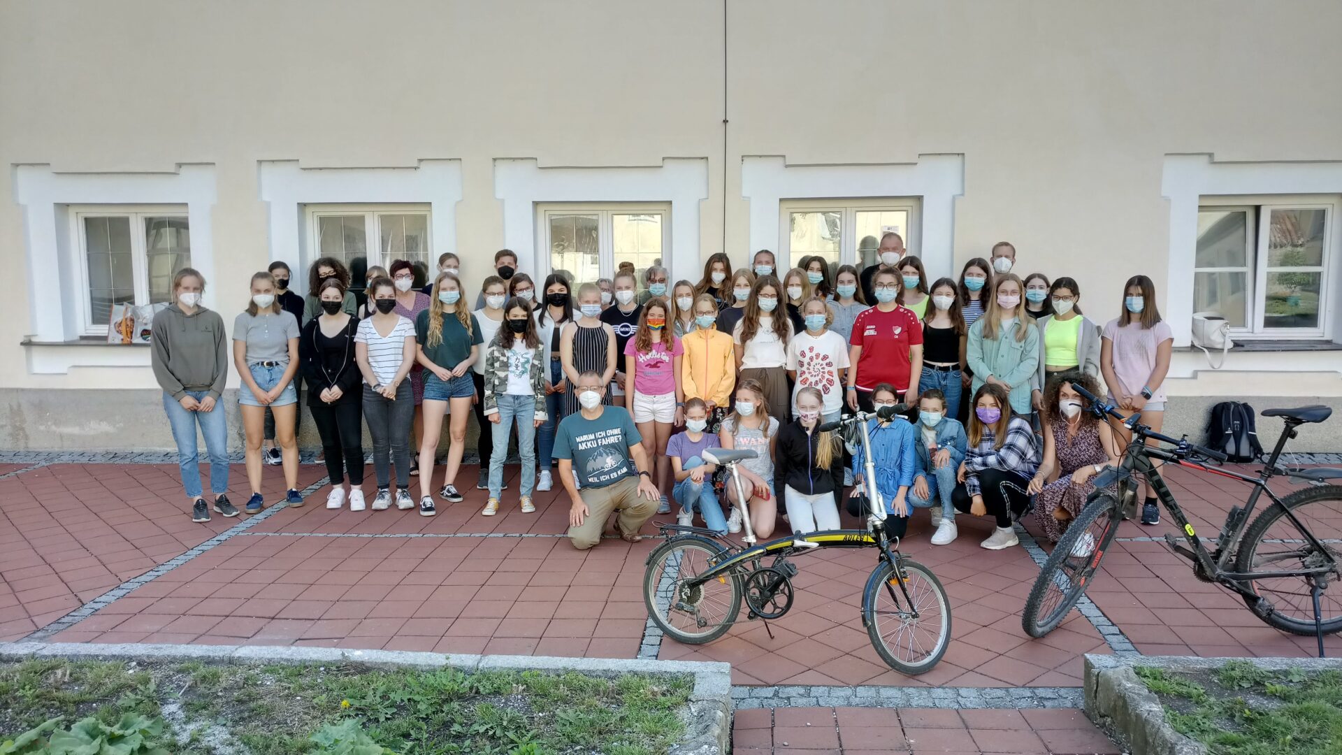 Nur ein Wimpernschlag von59 Kilometerntrennt uns vom ersten Platz beim diesjährigenLandshuter Stadtradeln.37 310 Kilometersind unsere336 Radler(davon 83 mit eigenem Account) innerhalb vondrei Wochengefahren. Unsere Radler – das sind Schülerinnen, Lehrer und deren Partner, Angestellte der Schule, (Groß-)Eltern, Ehemalige, und so manche weitere Person, die sich unserer Schule verbunden weiß. Dabei kam es innerhalb des Teams zu interessanten kleinen Privatduellen, die für die Beteiligten oft eine Zusatzmotivation bildeten, um aufs Rad zu steigen. Peter Kulzer beflügelte Renate Bumeder mit dem Satz, er sehe schon ihr „Rücklicht“, während Leonie Pucknus ihr Erfolgsrezept, mit dem sie ihren ehemaligen Lehrer bereits zum dritten Mal im Stadtradeln-Duell düpierte, in einer Mail so zusammenfasst: „Ich erledige auch alles mit dem Rad und weigere mich mit dem Auto gefahren zu werden.“ – Damit zeigt sie besonders deutlich, dass sie den Sinn des Stadtradelns vollauf verinnerlicht hat – schließlich geht es ja in erster Linie darum, Kohlendioxid einzusparen, indem man Autofahrten aufs Fahrrad verlegt. Unsere Gruppe kann sich diesbezüglich5485 Kilogramm eingespartes Co2auf die Ökofahne schreiben. Einige dieser fleißigen RadlerInnen haben sich stellvertretend für alle anderen zu einem gemeinsamen Foto (rechts) getroffen.