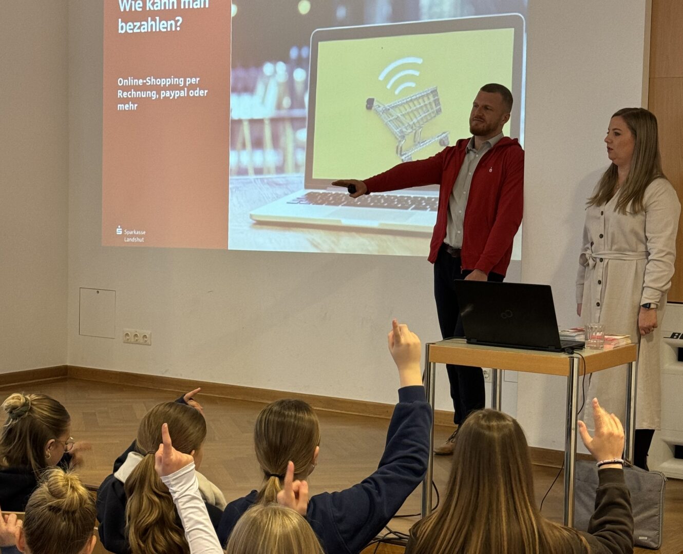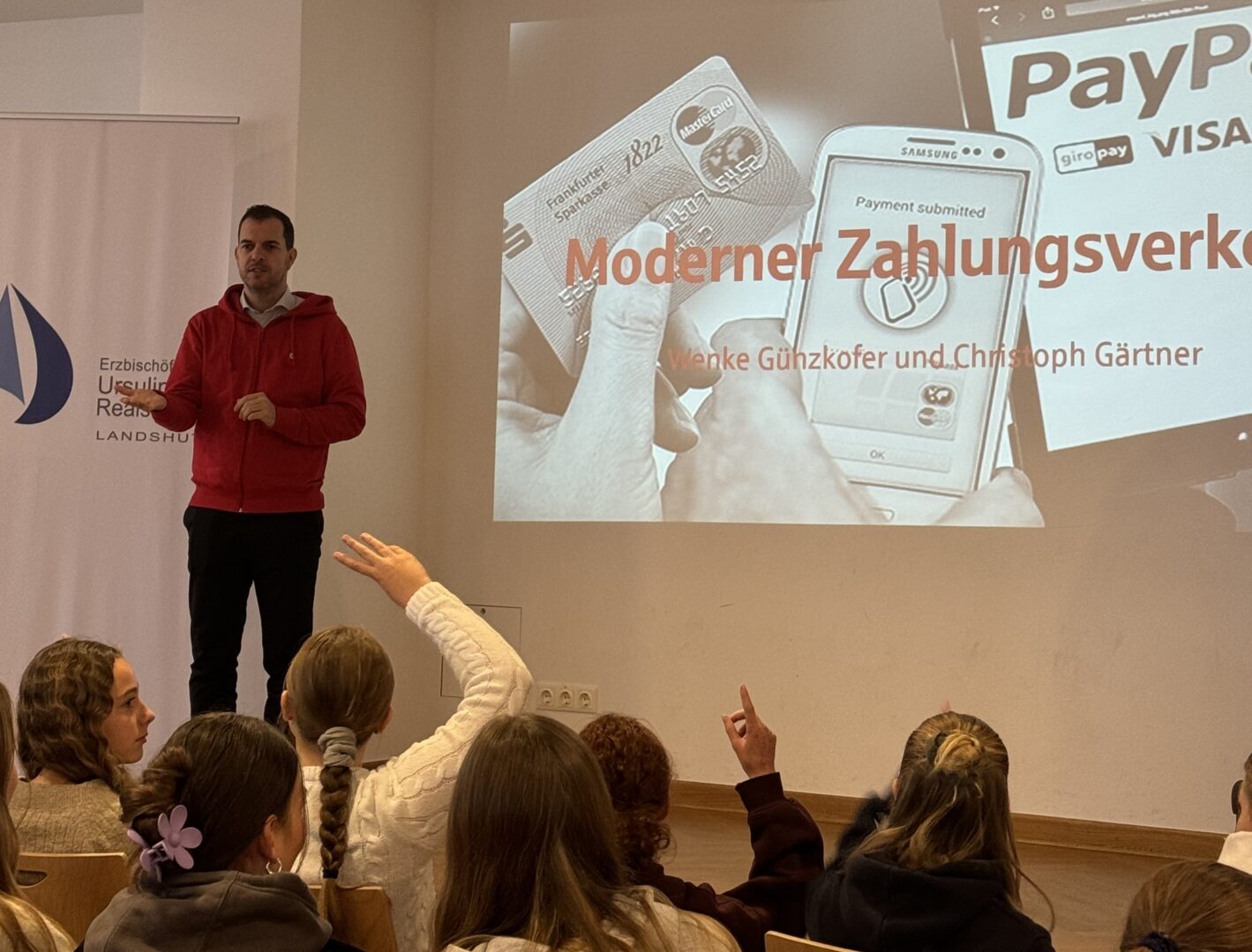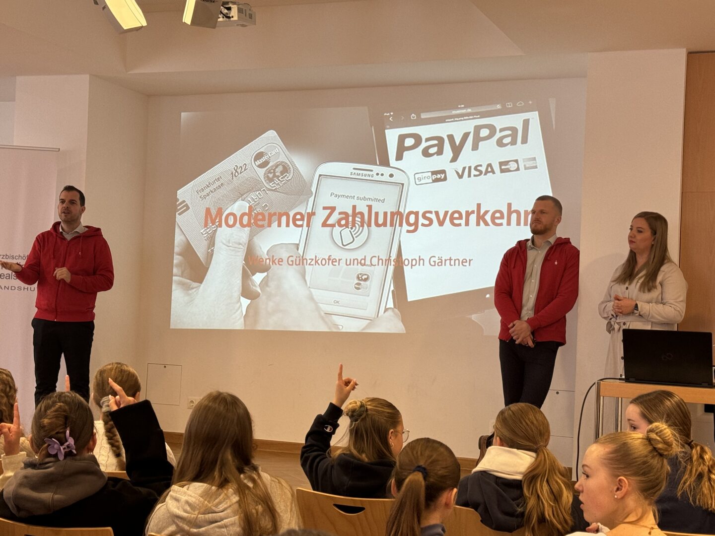 Wer hätte gedacht, dass ein Vortrag über IBAN, Bezahl-Apps und Co. so spannend sein kann?Richtig lebendig wurde es heute, als eine Ehemalige unserer Schule und heutigen Mitarbeiterin der Sparkasse Landshut, Wenke Günzkofer, den aktuellen Jahrgängen einen Einblick in die faszinierende Welt des modernen Zahlungsverkehrs gewährte.Mit einer sympathischen Mischung aus Fachwissen und Elan entführte Günzkofer zusammen mit ihrem Kollegen Christoph Gärtner in die faszinierende Welt des digitalen Geldes. Schülerinnen der siebten und neunten Klassen wurden auf eine Reise durch die Welt des modernen Zahlungsverkehrs genommen, weg von staubigen Kontoauszügen und hin zu mobilen Zahlungen. Von der ersten Berührung mit Online-Banking bis hin zu den neuesten Trends wie dem Bezahlen mit dem Smartphone wurde zeigte, wie einfach und bequem es sein kann, heute mit Geld umzugehen.Dadurch, dass die Mädchen bereits ein fundiertes Wissen aus dem schulischen Unterricht mitbrachten, konnten sie den Vortrag mit zahlreichen Beiträgen sowie einigen Fragen bereichern: Wie sicher ist eigentlich das Bezahlen mit dem Handy? Welche Vorteile hat es, eine eigene Kreditkarte zu haben? Und was genau ist eigentlich ein Wallet?Die Schülerinnen staunten, als die Vorteile von Apps für das mobile Bezahlen thematisiert und erklärt wurde, wie praktisch es ist, mit dem Smartphone zu bezahlen. Dabei wurde immer wieder der sichere Umgang mit persönlichen Daten betont.Am Ende des Vortrags waren sich alle einig: Das war nicht nur informativ, sondern auch unterhaltsam. Es wurde nicht nur eine Menge Neues, sondern auch eine Ehemalige in ihrem beruflichen Umfeld kennengelernt. Ein Vorbild, das zeigt, dass auch in der Finanzwelt spannende und abwechslungsreiche Jobs warten. Der Ausbildungsleiter Alexander Goldbrunner, stellte noch eine weitere Einsatzmöglichkeit des Smartphones vor: Mit einem QR-Code können sich die Schülerinnen für ein Praktikum bei der Sparkasse Landshut bewerben. Die Tätigkeiten dabei stellte die Auszubildende Annika vor.Fazit: Die Sparkasse Landshut hat mit diesem Vortrag einmal mehr gezeigt, dass Finanzthemen auch für junge Menschen interessant sowie wichtig sind und man als Absolventin immer wieder gerne an ihre „alte“ Schule zurückkehrt – zum Beispiel als Expertin für den modernen Zahlungsverkehr.