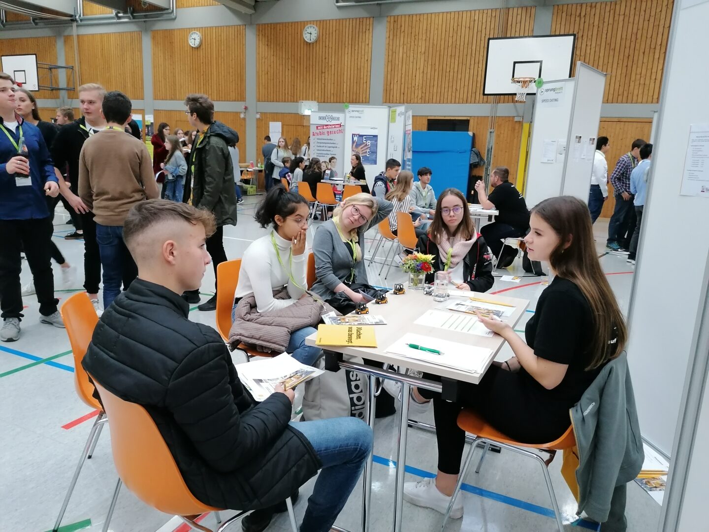 Benjamin Liebl vom Bildungswerk der Bayerischen Wirtschaft kam bereits zwei Wochen vorher an unsere Schule, um den Interessierten den Ablauf an diesem Tag zu erklären. Anhand von Fragebögen, auf denen die individuellen Interessen angegeben werden sollten, wurden dann feste Gesprächstermine mit den anwesenden Unternehmen verteilt, so dass sich sowohl potentielle Arbeitgeber als auch die möglichen Bewerber gegenseitig „beschnuppern“ konnten. In einigen Fällen war sogar ein Betriebspraktikum das Ergebnis dieser Gespräche. Daneben wurden Workshops, zum Beispiel zum Thema Motivation oder „Eigene Stärken erkennen“ angeboten ebenso wie die „Virtual Work Experience“, bei der man mit einer VR-Brille u. a. eine CNC-Fräsmaschine bedienen aber auch die Erfahrung des „Schweißens“ machen konnte. Fast alle Schülerinnen nutzten das Angebot von professionellen Bewerbungsfotos, die sie auf USB-Sticks mit nach Hause nahmen.