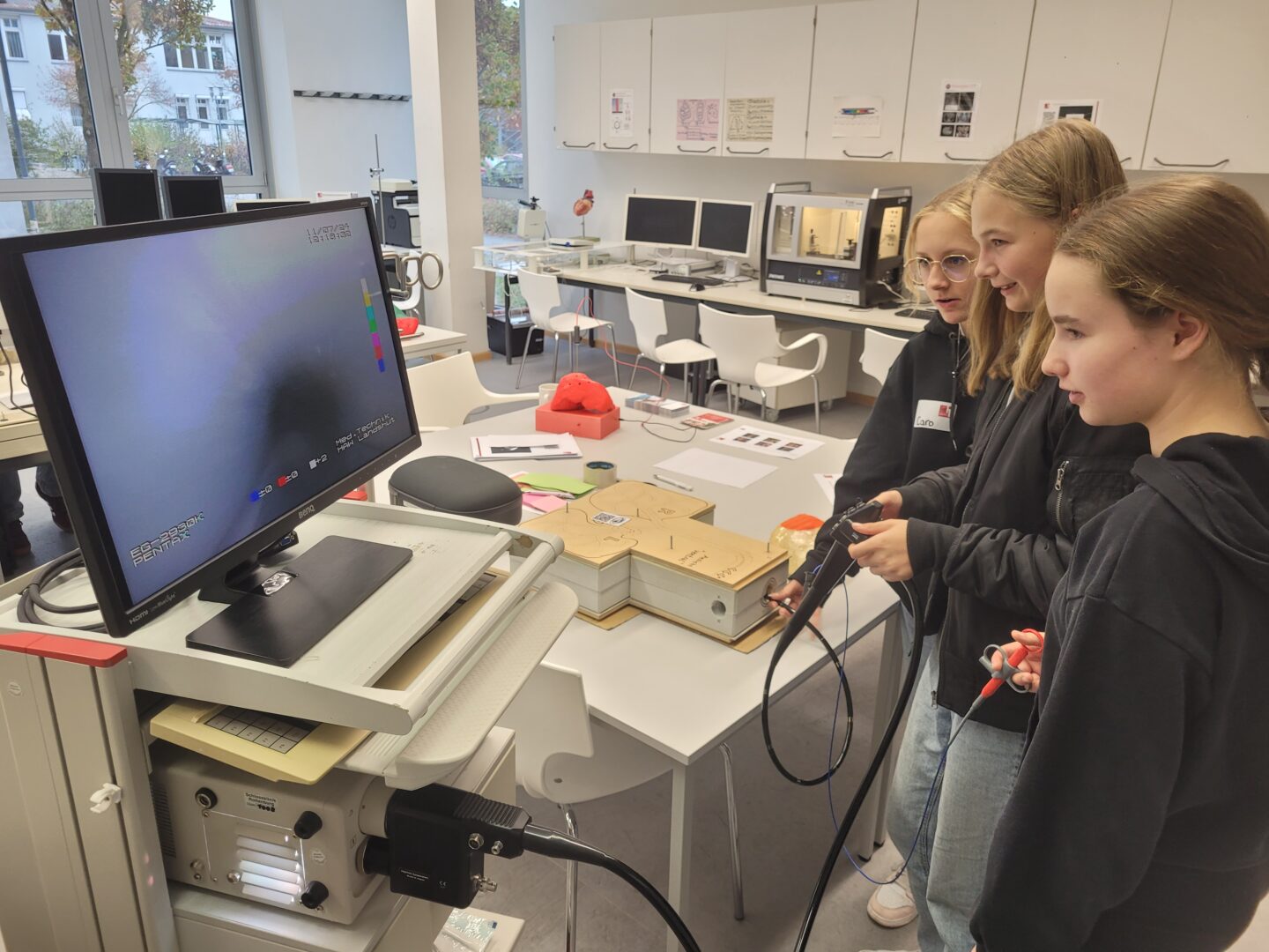 Roboter, die aussehen wie Menschen, die sprechen wie Menschen, die sich bewegen wie Menschen, kennt man aus diversen Sciencefiction-Filmen. Mit humanoiden Robotern in direkten Kontakt sind jedoch nur wenige bisher gekommen. Daher war die Freude bei 16 technikbegeisterten Ursulinen-Schülerinnen natürlich groß, als sie erfuhren, diese bei einem Besuch an der Hochschule Landshut selbst programmieren zu dürfen. Denn all das beeindruckende Können zeigen Roboter nur, wenn man es ihnen vorab am Computer vorgegeben hat. Nach einer allgemeinen Einweisung legten die Mädchen den anfänglichen Respekt schnell ab und erstellten schrittweise Programmschleifen, um mit den NAOs namens Lenny, Alice und Co. kommunizieren und sie zum Tanzen anleiten zu können.Wäre dies zwar eigentlich schon genug an tollen Erfahrungen gewesen, ermöglichte Frau Hofmann von der MINT-Organisation „Zukunftswerker“ zusammen mit der Hochschule Landshut den Jugendlichen einem zweiten Workshop, diesmal im Bereich Medizintechnik. In einem Escape-Game schlüpften die Gruppen in die Rolle eines Kriminalpolizisten und begaben sich auf die Suche nach Schneewittchens Mörder. Als Ermittlungsmethoden in dieser alten Geschichte standen den Mädchen jedoch moderne technische Verfahren wie z.B. Röntgengeräte, MRT-Aufnahmen oder Ultraschallbildgebung zur Verfügung. Ein Highlight war gewiss die Entfernung des Apfelstücks aus Schneewittchens „Bauch“ mit Hilfe eines Laparoskopie-Gerätes.Neben tollen Erfahrungen konnten die Ursulinen-Schülerinnen dann auch noch einen eigenen Roboter mit nach Hause nehmen. Natürlich nicht die sehr teuren NAO-Roboter, sondern selbstgebaute, kreativ verzierte und flitzende Bristle Bots aus Zahnbürstenköpfen.Ein Blick in die glücklichen Gesichter bei der Rückfahrt bestätigte einmal mehr, dass Technik nicht nur unser aller Leben beeinflusst, sondern auch unfassbar interessant und spannend ist.