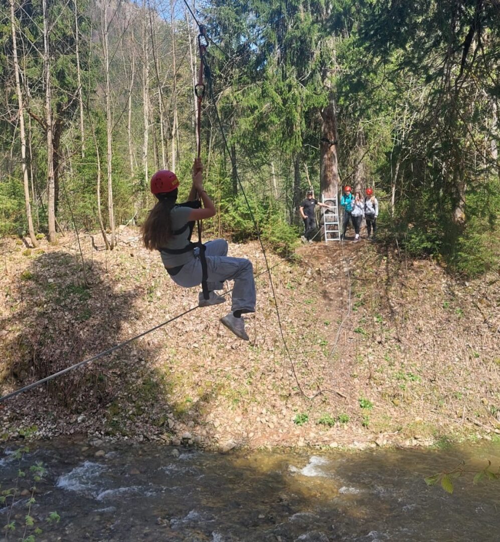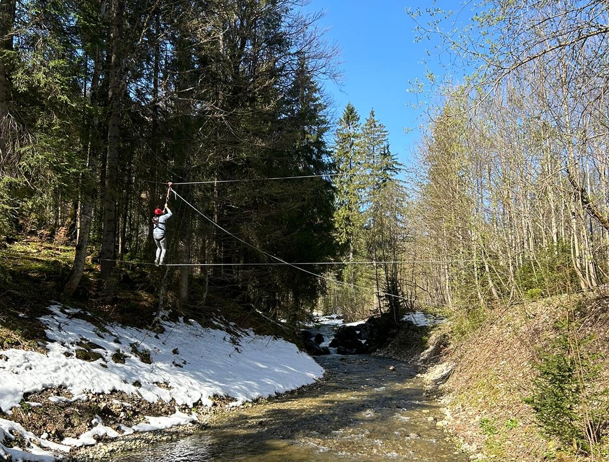 Nach dem Wanderklettern folgte das Überqueren einer Schlucht, wobei wir uns unter „Schlucht“ einen Canyon vorstellten, indem wir auf einem Seil tanzend dem Tode nahe waren. Ganz so nervenaufreibend und vor allem gefährlich stellte sich das Ganze nicht heraus. Der von uns erwartete Canyon war „nur“ eine Flussstelle, bei der man sich gesichert auf einem Drahtseil auf die andere Seite zubewegte und am Ende wie an einer Seilbahn zurücksausen konnte. Beim Warten genossen wir die wunderbare Aussicht auf das klare Wasser und den von Bäumen umschlossenen Spitzingsee.