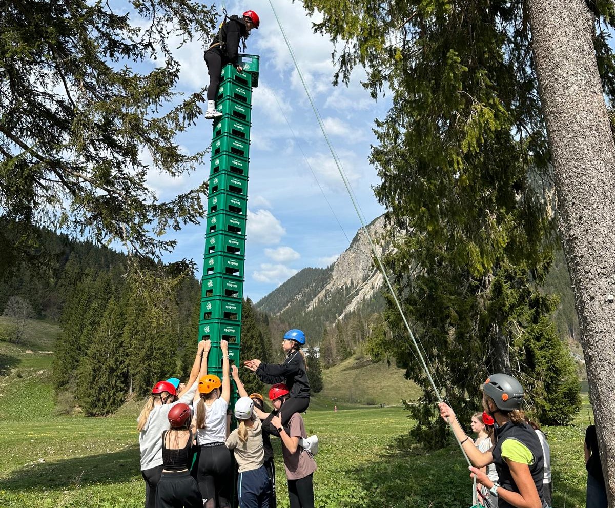 Nach dem Mittagessen mit Spätzle, Kartoffelgratin und vegetarischer Lasagne ging es weiter mit der Übung, die wohl am meisten Teamwork und Mut forderte, dem Bierkastenstapeln. Eine Person stieg auf die aufeinandergestapelten Bierkisten und nahm weitere von ihren Klassenkameraden entgegen. Es wurde in schwindelerregenden Höhen gebaut und etliche Helme erfüllten ihren Zweck, als der Turm umfiel. Doch am Ende schafften wir es den Tagesrekord der anderen beiden Gruppen zu schlagen und bauten 22 – waren es wirklich so viele? – Kisten übereinander.