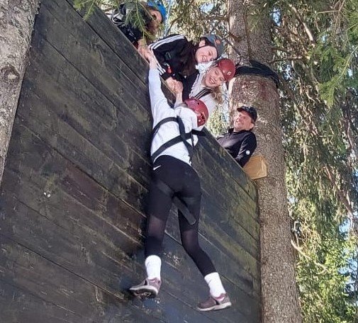 Der Dienstagmorgen startete mit einem reichhaltigen Frühstücksbuffet. Nachdem wir uns auf den Zimmern für den vor uns liegenden Tag vorbereiteten, folgte die Einteilung in drei Gruppen. In den Gruppen wurden nach und nach die drei bzw. vier Campstationen absolviert, mit Hilfe von einer Lehrkraft und eines Rangers aus dem Camp. Beim „Wandklettern“ handelte es sich um eine etwa vier Meter hohe Wand, die man ohne sonstige Hilfsmittel, nur mithilfe von den untenstehenden Klassenkameraden und den oben händereckenden Helfern erklimmen musste. Sobald die Taktik klar war, wurde jeder einzelne aus der Gruppe sicher nach oben gehoben und wieder nach unten abgeseilt. Natürlich auch inklusive der Lehrer, die eine uns überraschende Eleganz an den Tag legten.