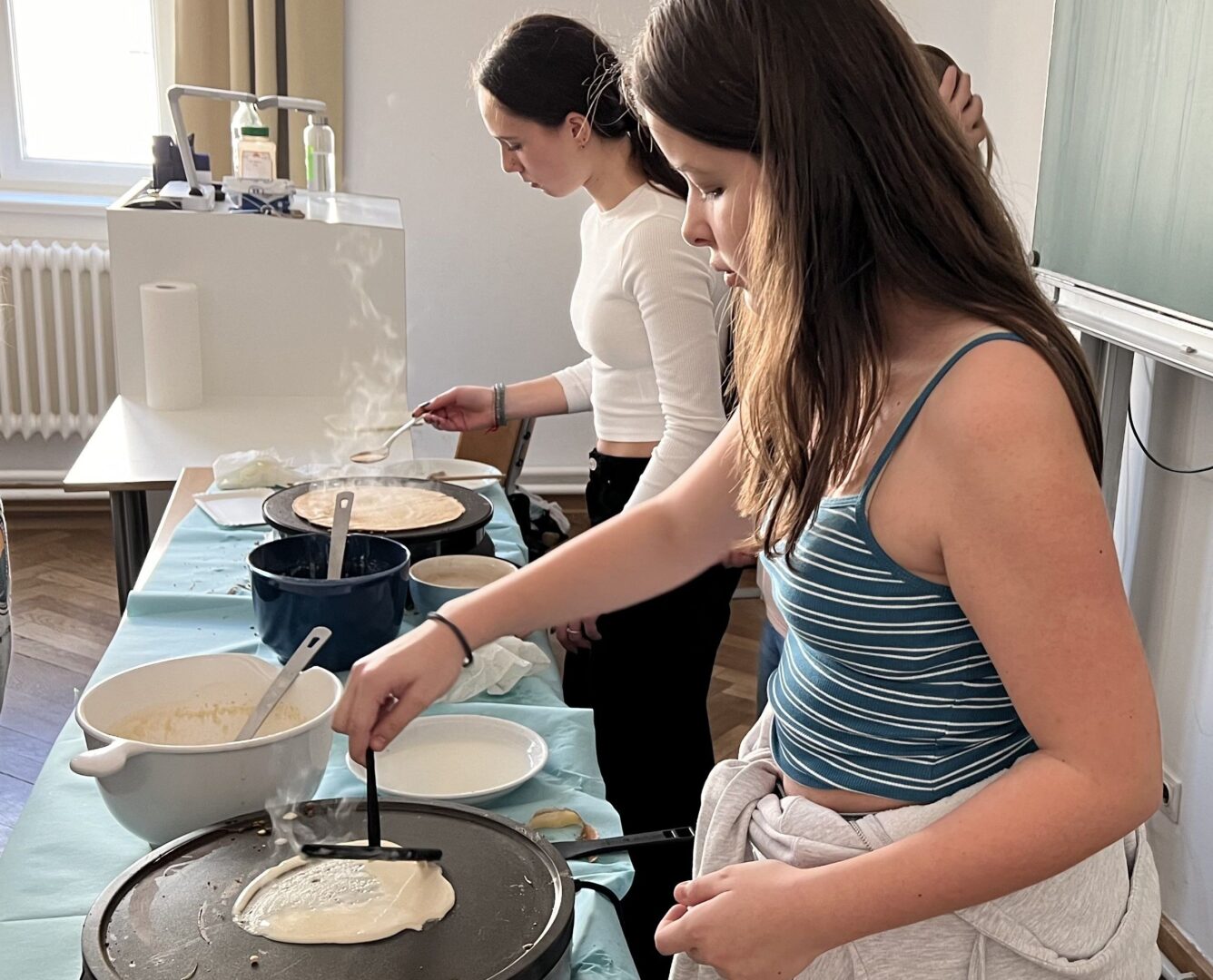 Für die sprachbegeisterten Gäste bzw. Feinschmecker gab es die Möglichkeit, ihr Talent am Crêpes-Stand im Französischraum unter Beweis zu stellen oder in der Englischecke spielerisch die Tierwelt in der Fremdsprache zu entdecken – vom bellenden Hund bis zur summenden Biene. Auch das Flaggenpuzzle und die Dialog-Bandolinos fanden großen Anklang.