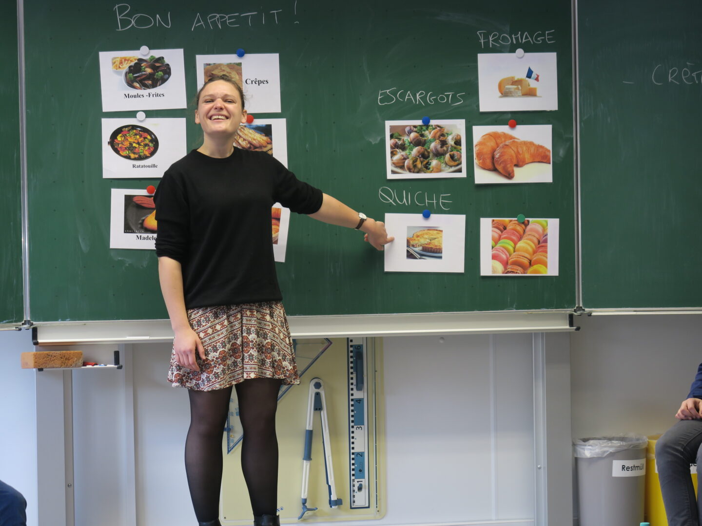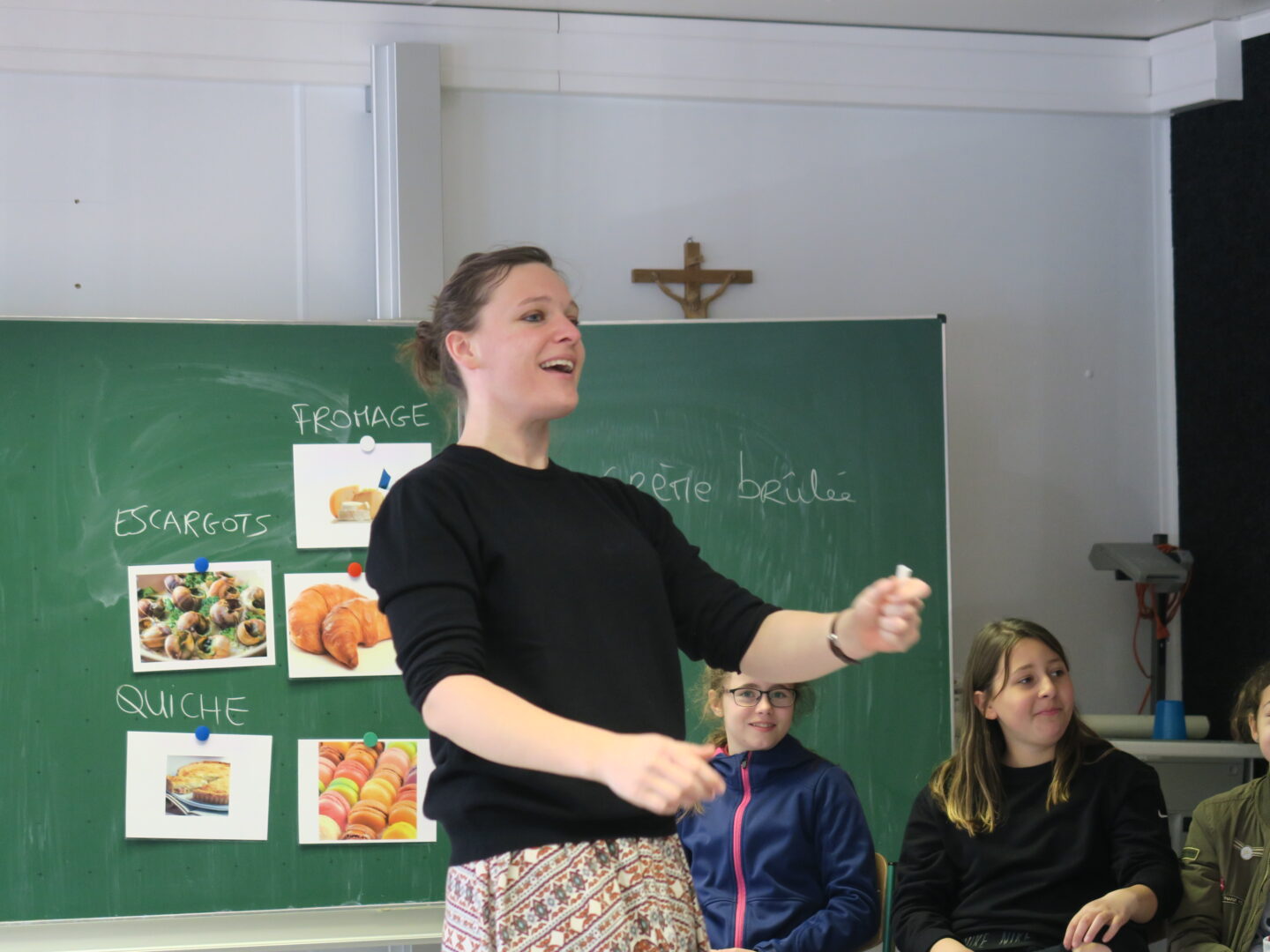 Vor kurzem hat das FranceMobil seinen Halt an unserer Schule gemacht. Marie Quémerais, FranceMobil-Lektorin in Südbayern führte die Schülerinnen der sechsten Klassen schwungvoll und ausschließlich in französischer Sprache durch die Unterrichtsstunde. Zum Einsatz kamen unterhaltsame Spiele, bei denen alle Teilnehmerinnen unterstützt durch Bildmaterial französische Wörter zuordnen und vor allem parlieren durften. Viel Geschick bewiesen die Schülerinnen dabei, vorgegebene Begriffe aus dem Bereich der Tierwelt, des Sports und der Nahrungsmittel in unterschiedlichen Liedausschnitten zu hören und zu identifizieren. So verflog die Hemmnis vor dem Sprechen schnell und alle waren erstaunt, was sie schon auf Französisch kennen und wie leicht mancher nasale Laut im Grunde doch über die Lippen ging. Nebenbei erfuhren sie auch noch viel Neues über das Nachbarland.