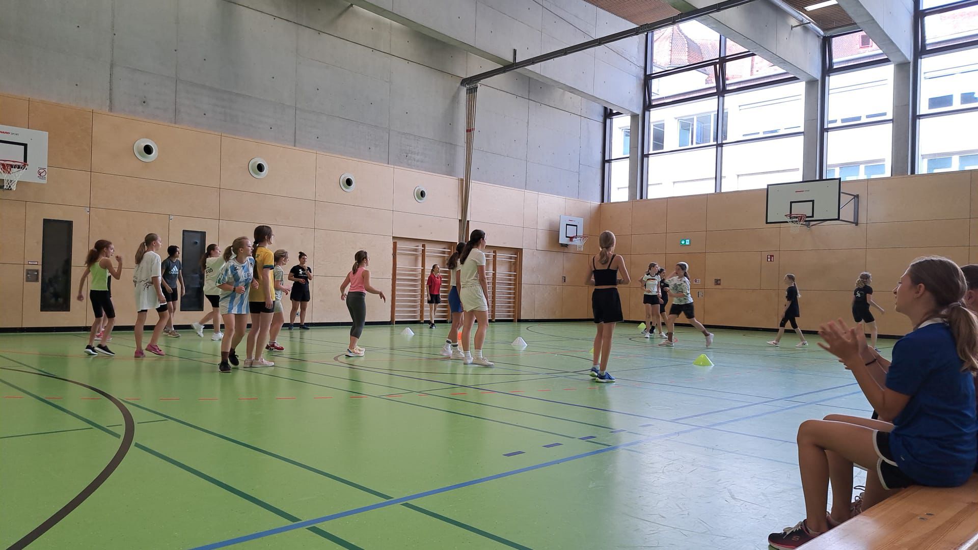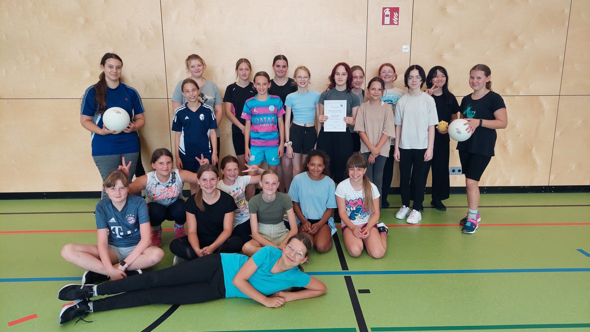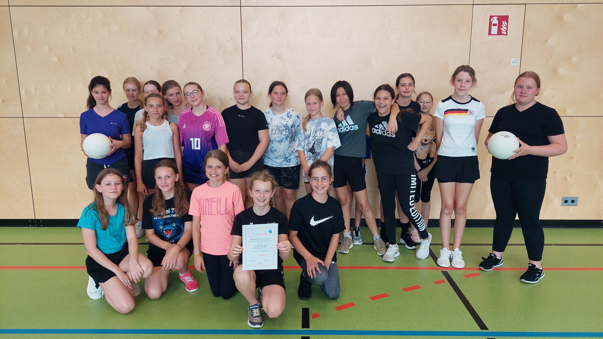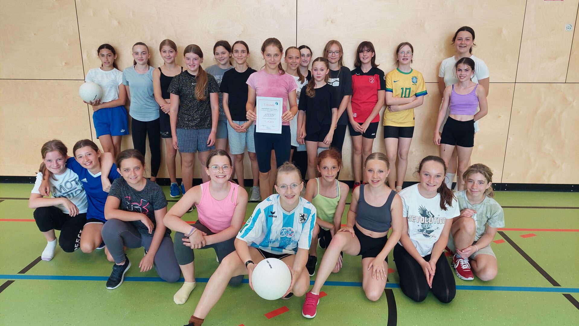 Am vergangenen Mittwoch fand in der Turnhalle unserer Schule dasVölkerballturnier der sechsten Klassenstatt. Von der ersten bis zur vierten Stunde traten die Klassen 6a, 6b, 6c und 6d gegeneinander an, um den Sieger des Turniers zu ermitteln.Zu Beginn des Turniers wurden alle Teilnehmer herzlich begrüßt und eine kurze Einführung in die Regeln des Spiels gegeben. Die allgemeine Begrüßung erfolgte durch die SportlehrerinnenMagdalena Kania, Theresia Schweiger, Ruth Winkler und Ines Stelzle, die alle Schülerinnen auf das bevorstehende Turnier einstimmten. Anschließend sorgte Frau Schweiger als Motivationscoach mit einem Warm-up zu Musik für die nötige Aufwärmung. Unterstützt wurde sie dabei von Frau Stelzle, die ein Dehnprogramm durchführte, um alle auf die bevorstehenden Spiele vorzubereiten.Die Gruppenspiele wurden im Prinzip „Jeder gegen Jeden“ ausgetragen, sodass jede Klasse die Möglichkeit hatte, gegen jede andere anzutreten. Dies förderte nicht nur den sportlichen Ehrgeiz, sondern auch den Teamgeist und die Fairness unter den Schülerinnen. In der gemeinsamen Pause konnten sich alle auf dem Freigelände der Turnhalle erholen. Auf Picknickdecken genossen die Schülerinnen ihre mitgebrachten Snacks und stärkten sich für die Finalspiele.Der Höhepunkt des Tages waren die Finalspiele um Platz drei und Platz eins. Die Stimmung war ausgelassen, und die Schülerinnen feuerten ihre Klassenkameradinnen mit großem Enthusiasmus an. Der Kampfgeist war deutlich zu spüren, und alle gaben ihr Bestes, um den Sieg für ihre Klasse zu erringen.Zum Abschluss des Turniers wurden Erinnerungsfotos gemacht, und es fand die Siegerehrung statt. Alle teilnehmenden Klassen erhielten Urkunden und kleine Preise als Anerkennung für ihre Leistungen. Besonders gratulierten die Sportlehrerinnen derKlasse 6azum Turniersieg.
