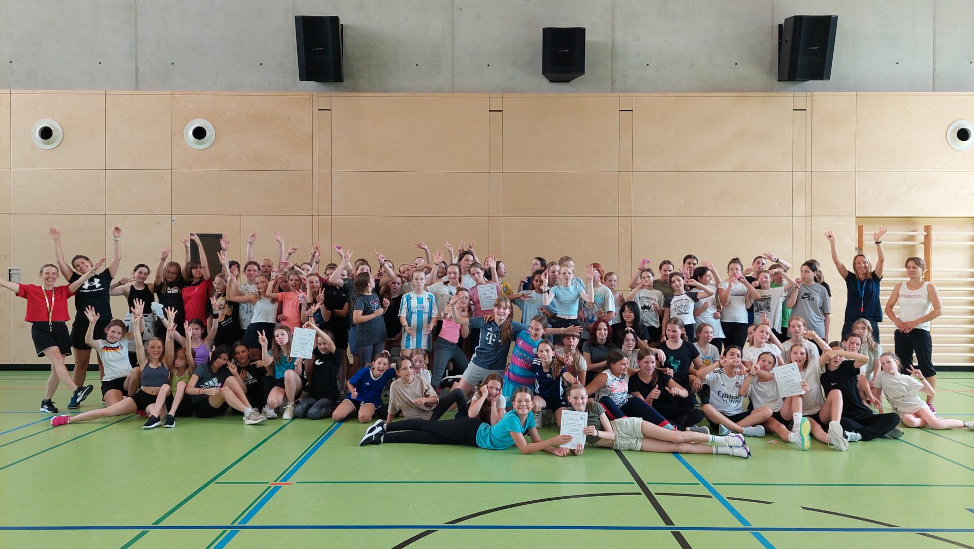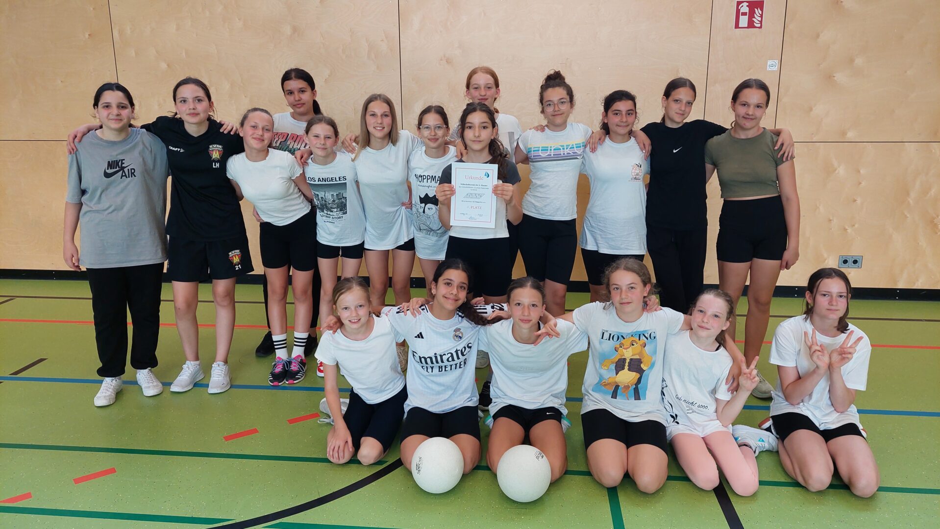 Zum Abschluss des Turniers wurden Erinnerungsfotos gemacht, und es fand die Siegerehrung statt. Alle teilnehmenden Klassen erhielten Urkunden und kleine Preise als Anerkennung für ihre Leistungen. Besonders gratulierten die Sportlehrerinnen derKlasse 6azum Turniersieg.