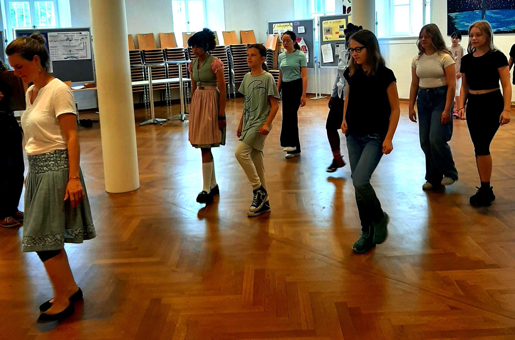 Spitze, Hacke, STAMPF! Besonders letzteren konnte man am heutigen Mittwoch gut in der Aula hören, als die Klasse5aan ihrem Bayern-Projekttag verschiedeneTänze in Linedance-Formierunglernte. Üblicherweise werden Volkstänze paarweise präsentiert, doch beim Linedance in einer offeneren Formation. Nach dem einfachen Grundschritt, besagtem Spitze, Hacke, Stampf für den „Boarischen“, folgten die „Krebspolka“, die „Mazurka“, „Footloose“(eine schnelle Eigenkreation) und die „Topporzer Kreuzpolka“.