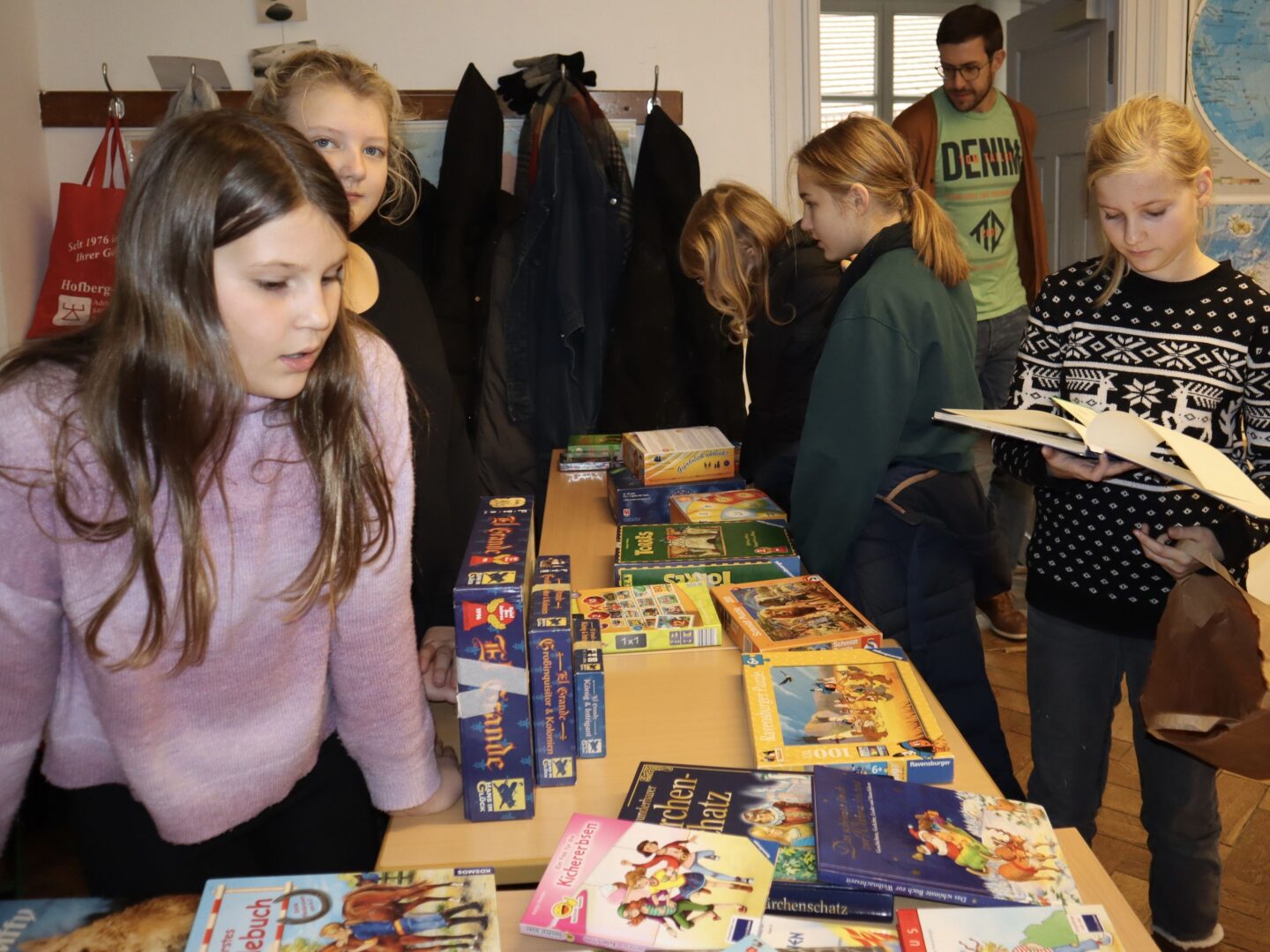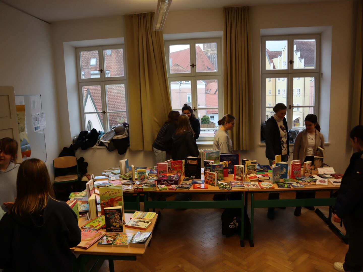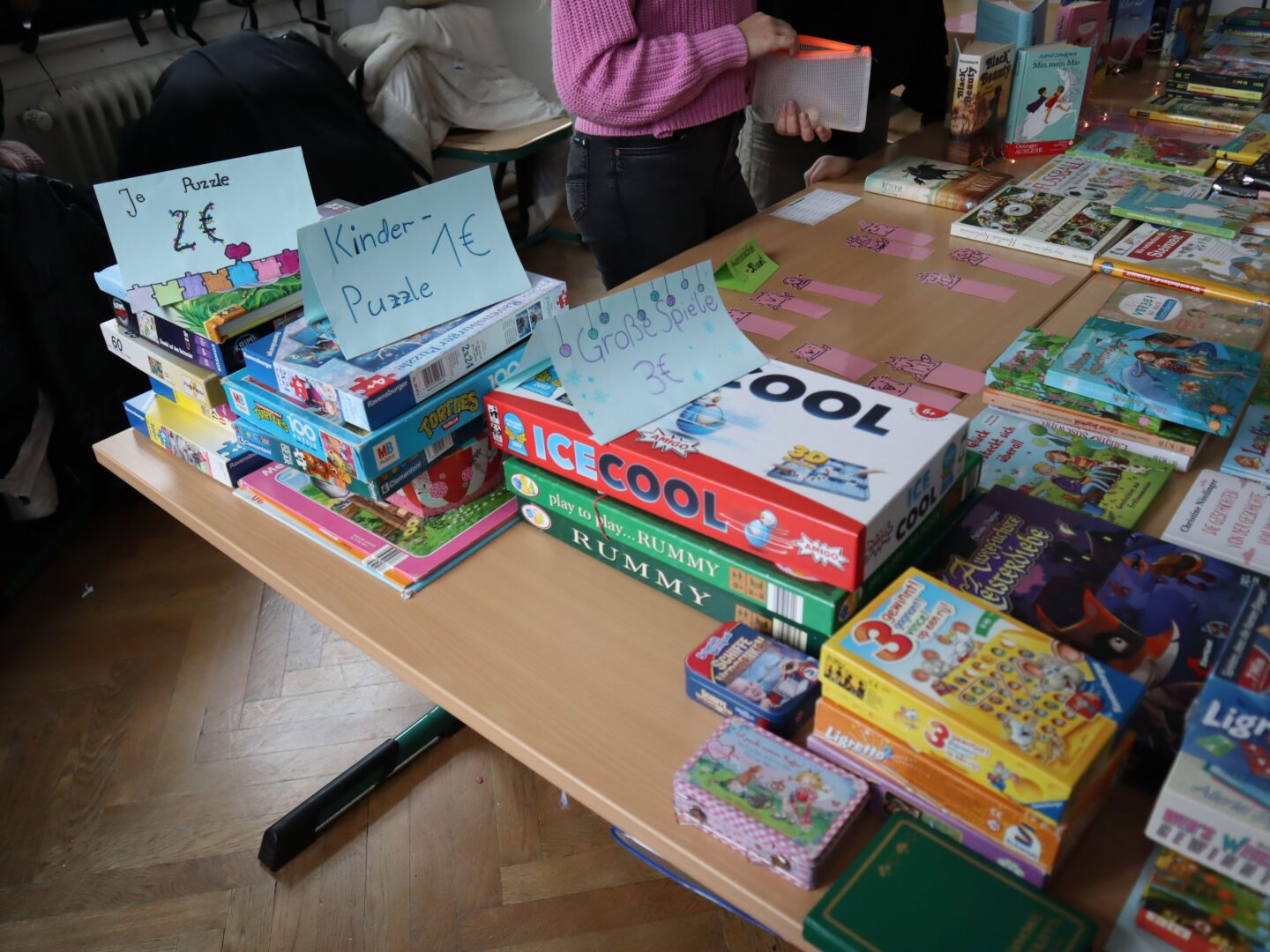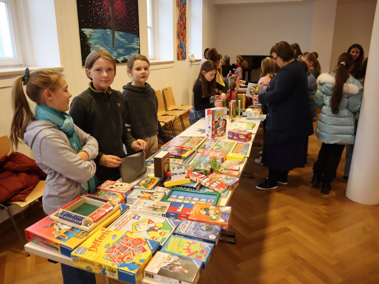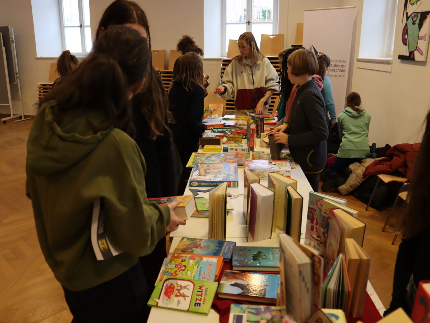 Heute herrschte in unserer Schule eine Atmosphäre des Gemeinschaftsgeistes und der Kauf- und Verkaufsfreude, denn das Hauptgebäude verwandelte sich in eine große Flohmarktfläche. Bereits nach der großen Pause konnte man sehen, wie die Klassenzimmer zu einem Paradies fürBücher- und Spieleliebhaberwurden. Die Schülerinnen arrangierten mit großem Eifer Bücher auf Tischen, sortierten sie nach Genres und präsentierten sie ansprechend.