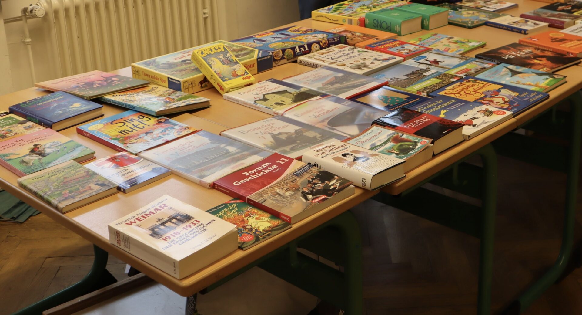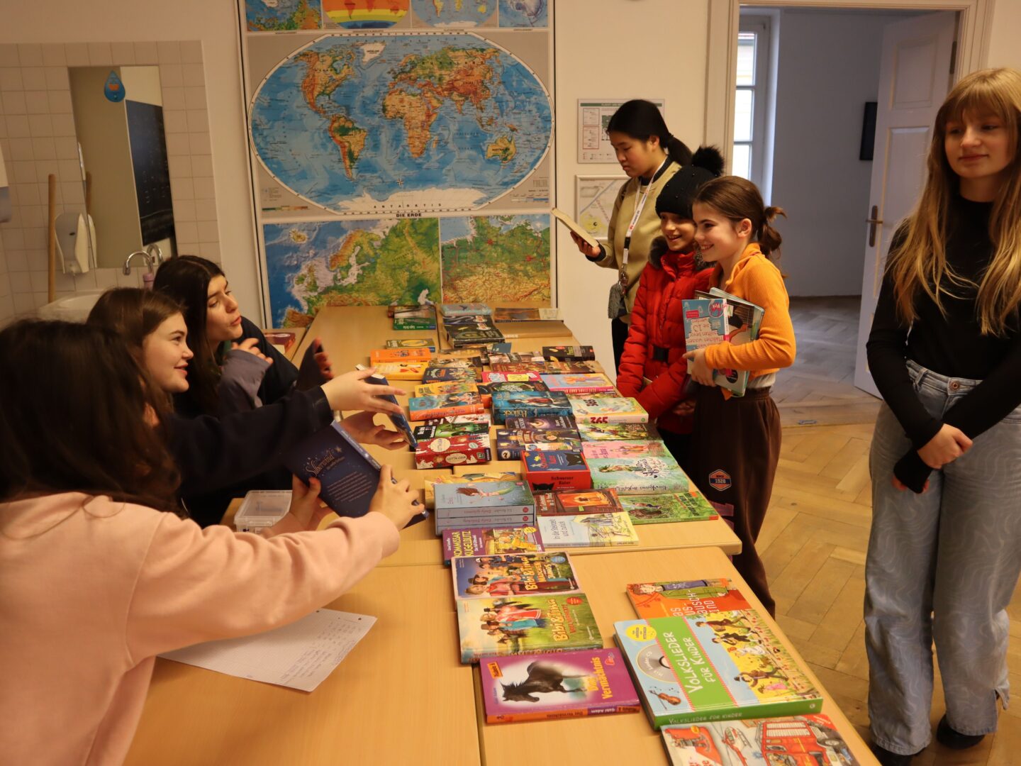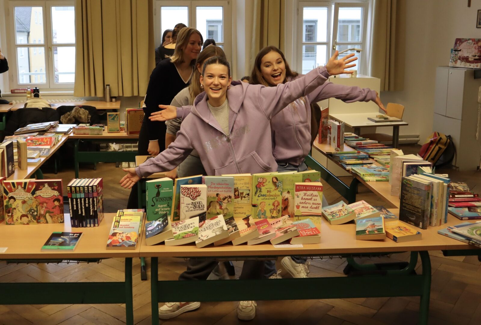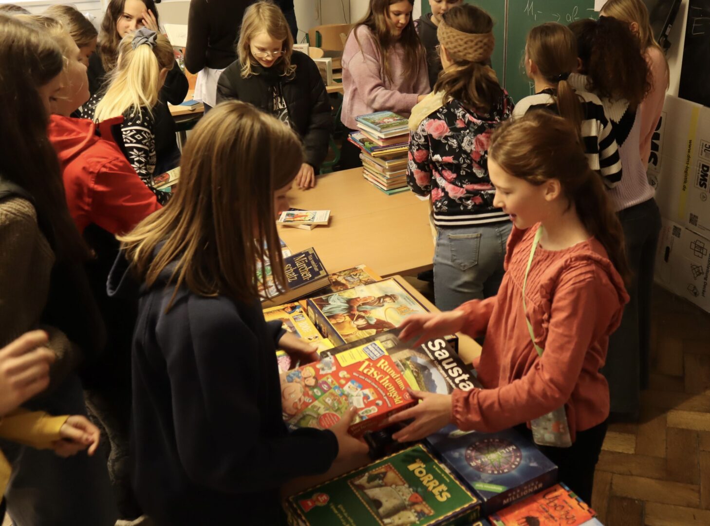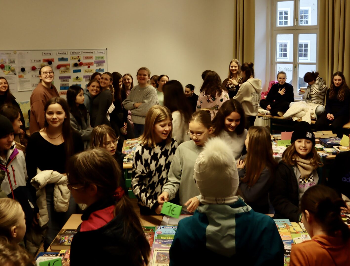 Heute herrschte in unserer Schule eine Atmosphäre des Gemeinschaftsgeistes und der Kauf- und Verkaufsfreude, denn das Hauptgebäude verwandelte sich in eine große Flohmarktfläche. Bereits nach der großen Pause konnte man sehen, wie die Klassenzimmer zu einem Paradies fürBücher- und Spieleliebhaberwurden. Die Schülerinnen arrangierten mit großem Eifer Bücher auf Tischen, sortierten sie nach Genres und präsentierten sie ansprechend.