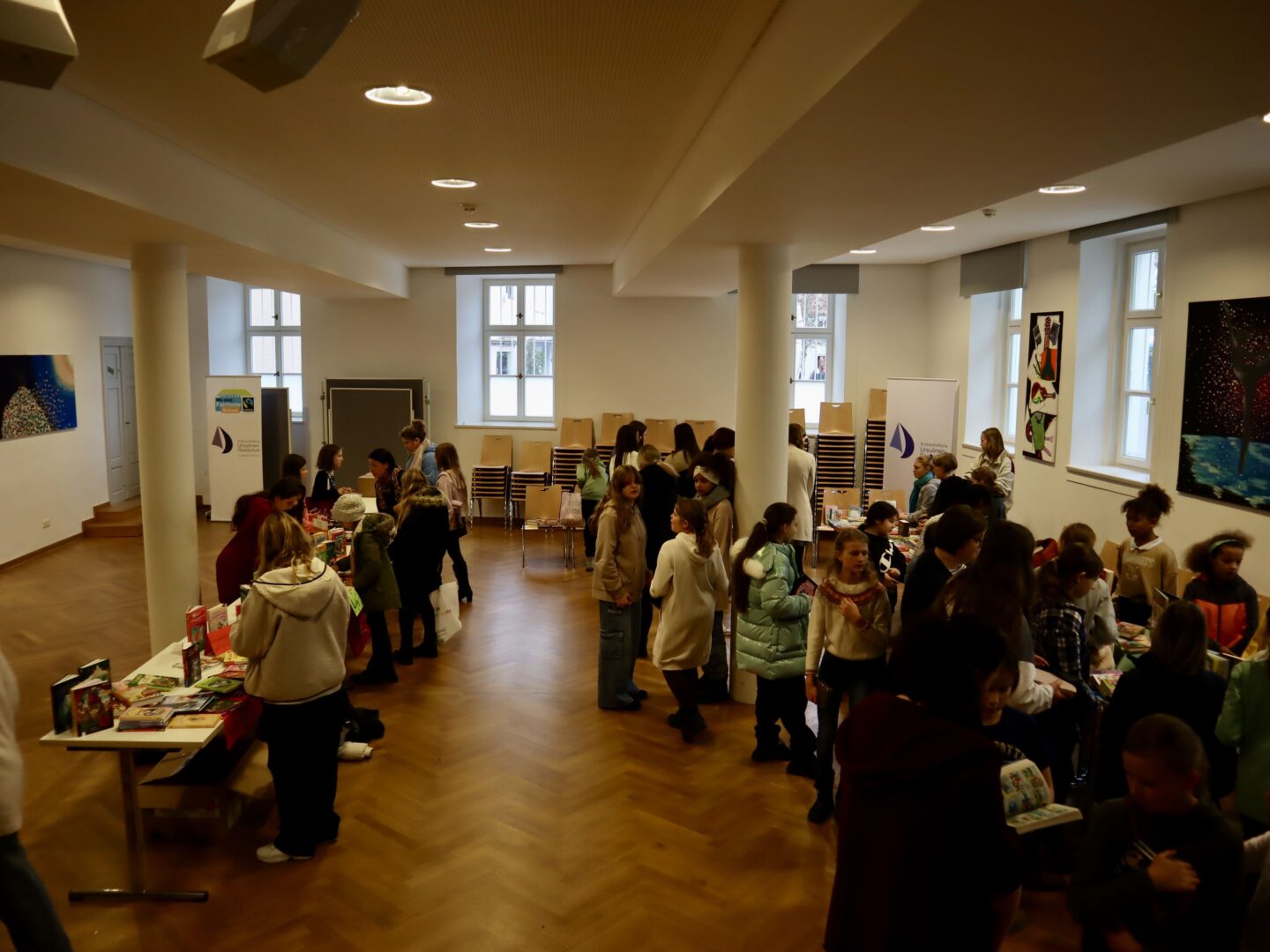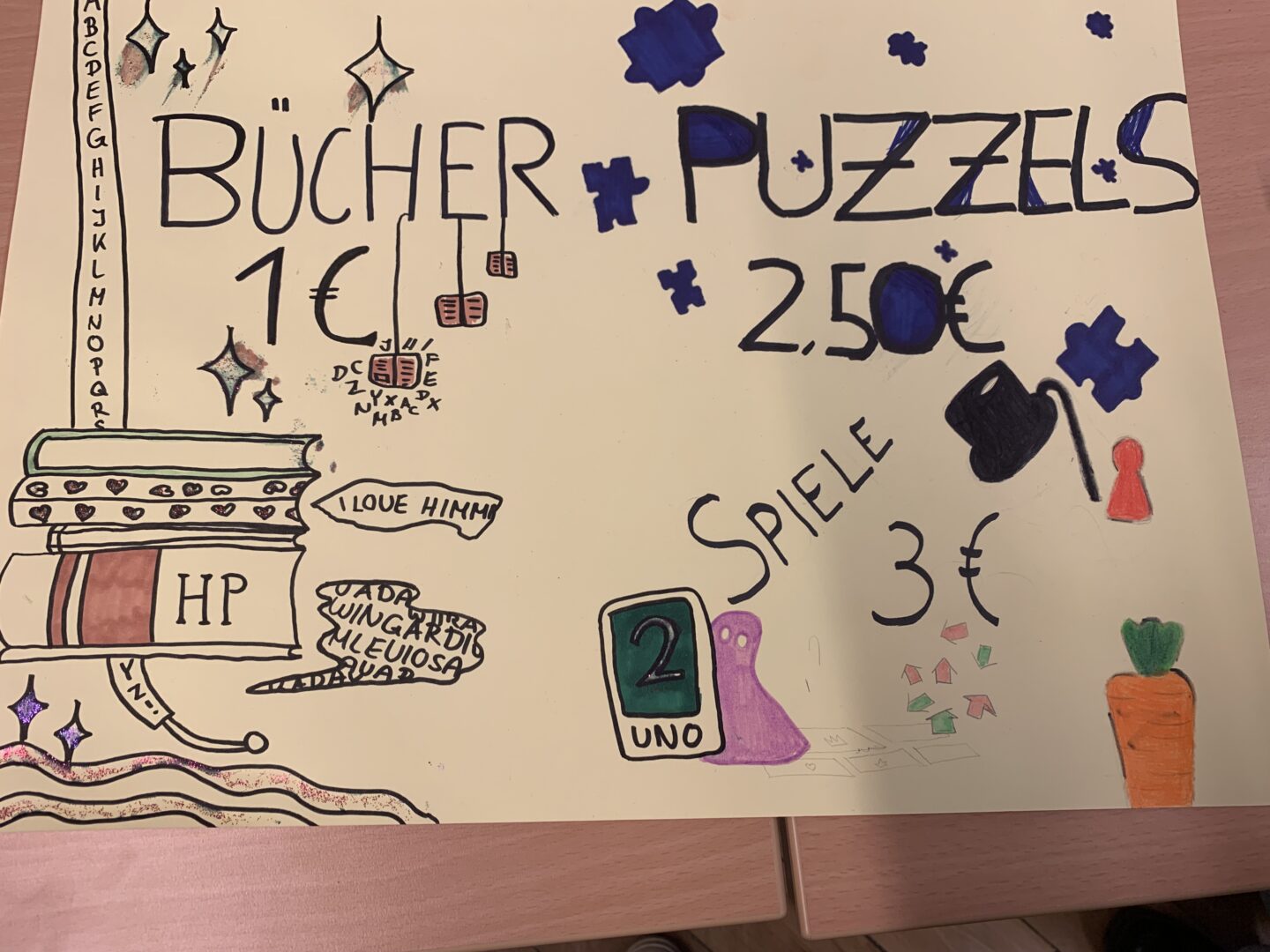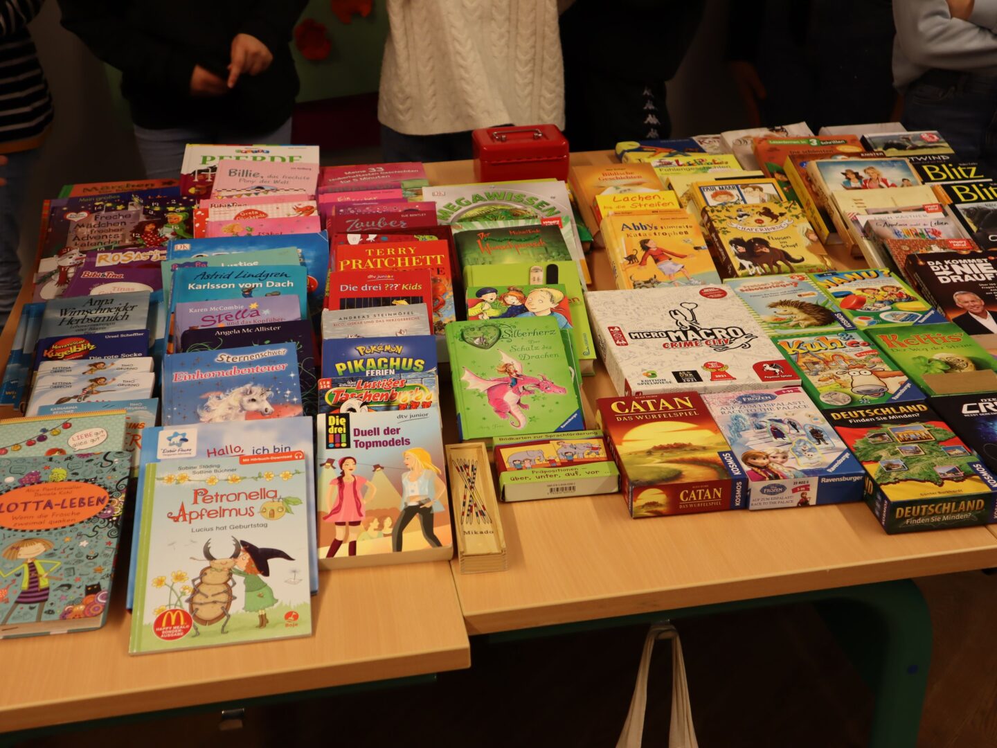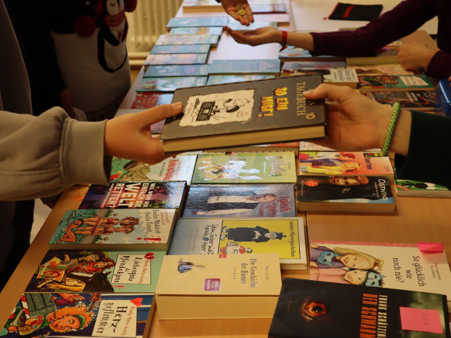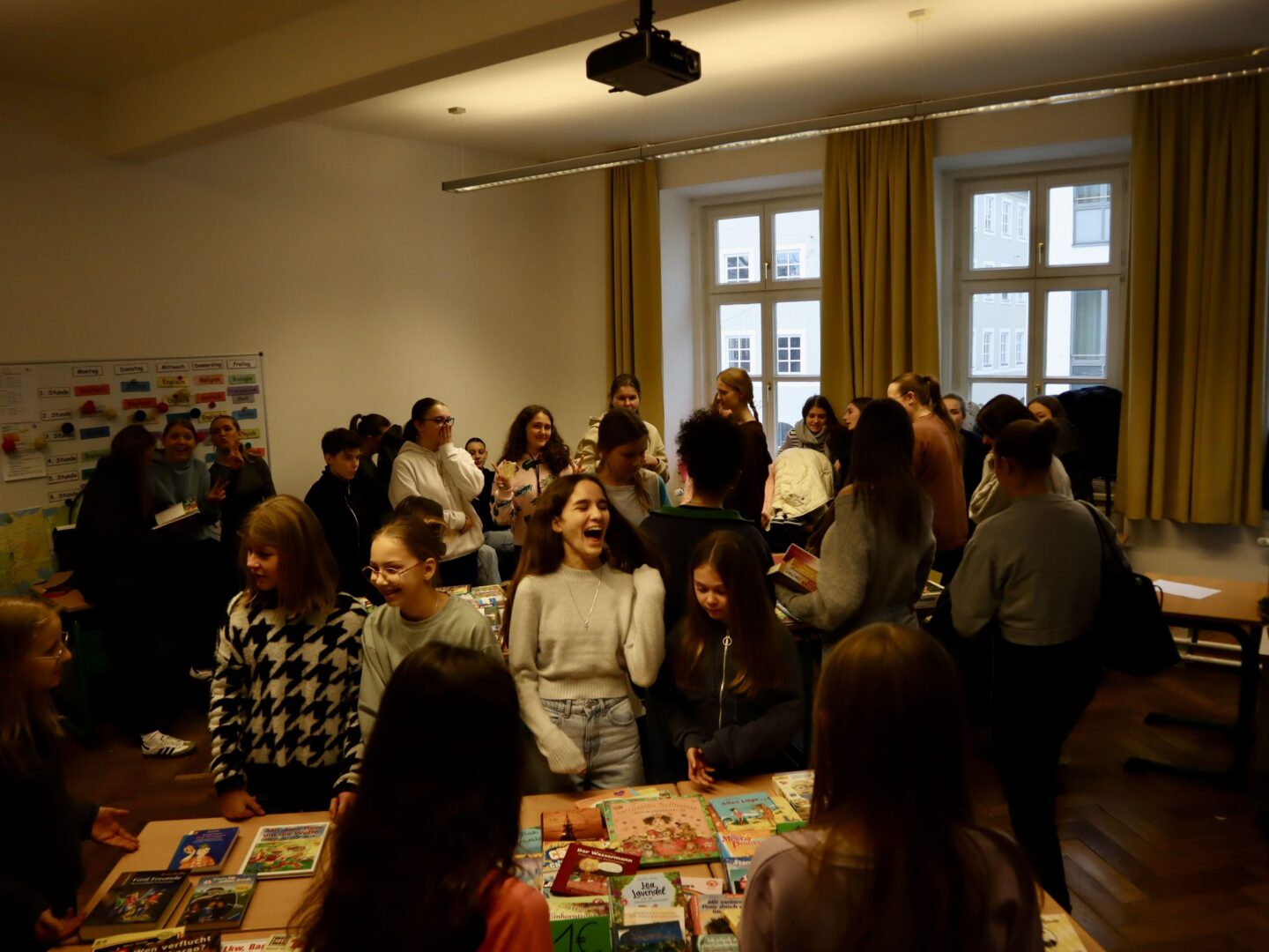 Heute herrschte in unserer Schule eine Atmosphäre des Gemeinschaftsgeistes und der Kauf- und Verkaufsfreude, denn das Hauptgebäude verwandelte sich in eine große Flohmarktfläche. Bereits nach der großen Pause konnte man sehen, wie die Klassenzimmer zu einem Paradies fürBücher- und Spieleliebhaberwurden. Die Schülerinnen arrangierten mit großem Eifer Bücher auf Tischen, sortierten sie nach Genres und präsentierten sie ansprechend.