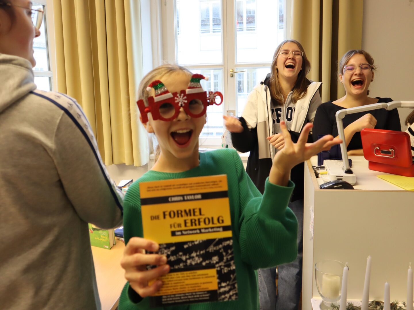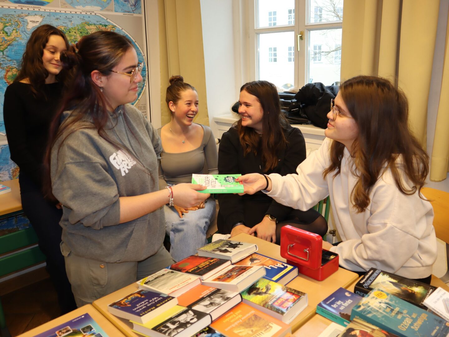 Die Verkaufstische waren nicht nur mit manchen literarischen Schätzen gefüllt, sondern auch liebevoll dekoriert: Lichterketten und weitere festliche Dekorationen sorgten für eine stimmungsvolle Umgebung.Ein besonderes Highlight waren die "Mitgebsel", die einige Klassen vorbereitet hatten. Wer ein Buch erwarb, durfte sich beispielsweise über ein selbstgebasteltes Lesezeichen der Klasse 5b freuen. Einige Schülerinnen priesen ihre Bücher mit Erfolg an, und einige versuchten mit viel Humor, Bücher über Schwangerschaft an die Lehrerinnen zu verhökern...Lehrer und Schülerinnen konnten wahre Schnäppchen machen, und es war genau der richtige Zeitpunkt, um einige Weihnachtsgeschenke zu besorgen. Eine Schülerin freute sich: "Ich habe sieben Geschenke für meinen Bruder gekauft und eines für mich." Auch Christina Weber war erfolgreich und konnte eine Spielebox für ihre Neffen zusammenstellen.Im gesamten Schulgebäude waren Menschen mit Taschen und Körben unterwegs, und die Vorfreude auf Weihnachten war förmlich spürbar. In vielen Klassenzimmern wurden die erworbenen Schätze gleich ausprobiert. Auf dem Boden saßen spielende und lesende Kinder, die ihre neuen Bücher und Spiele mit Begeisterung testeten.Ein besonders erfreulicher Aspekt des Flohmarkts ist der soziale Gedanke dahinter. Der Erlös von1374,60 Eurowird nach Wunsch der SMV an Sissi Pöschls Treuhandstiftung "Ecuador Licht und Schatten" sowie an dasspezialisierte ambulante Kinderpalliativteam im Kinderkrankenhaus Landshutgespendet. Die übrig gebliebenen Bücher und Spiele werden an "Hab & Gut Landshut" weitergereicht, um auch dort eine positive Wirkung zu entfalten.