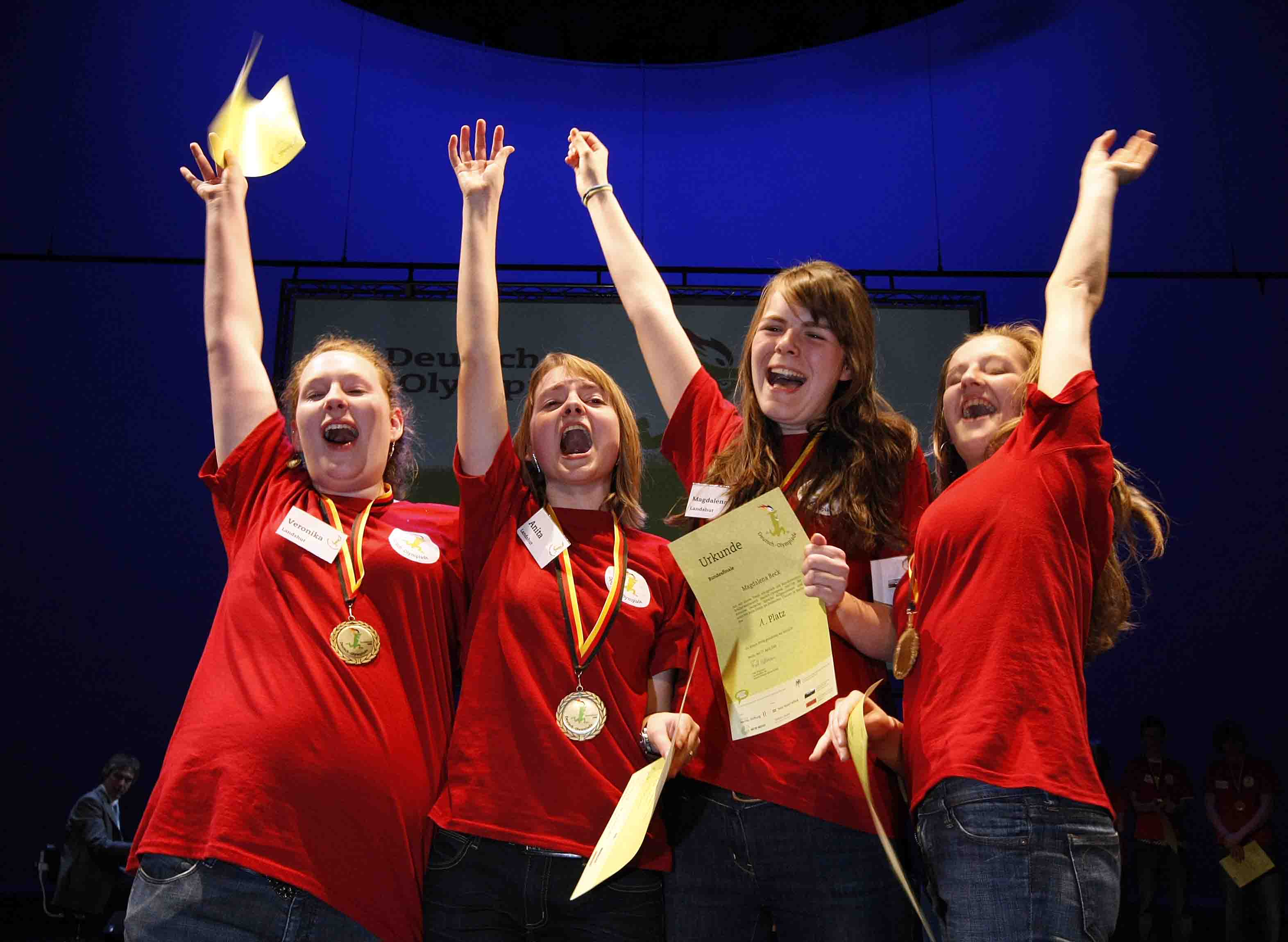 Die Landshuter Ursulinen-Realschule hat im Finale der Deutsch-Olympiade in Berlin die Gold-Medaille geholt. Die vier Mädchen aus Landshut setzten sich im Finale gegen ihre Konkurrentinnen aus Brandenburg, Nordrhein-Westfalen, Rheinland-Pfalz und Schleswig-Holstein durch. Dabei mussten die Neuntklässlerinnen Begriffe umschreiben und erklären, eine Geschichte fortführen und eine Szene erarbeiten und darstellen. Die vier Schülerinnen überzeugten die Jury, in der unter anderem Schauspielerin Katja Riemann und Schriftsteller Sven Regener saßen, zum Beispiel in der Disziplin Erzählen mit der Geschichte eines Jungen, der für seine Mutter Blumen kaufen will. Er hat sein Geld vergessen, nimmt die Blumen so mit und flüchtet durch die U-Bahn vor dem Wachmann. Nach dem Sieg flossen bei den Mädchen die Tränen vor rund 500 Zuschauern im Deutschen Theater in Berlin.