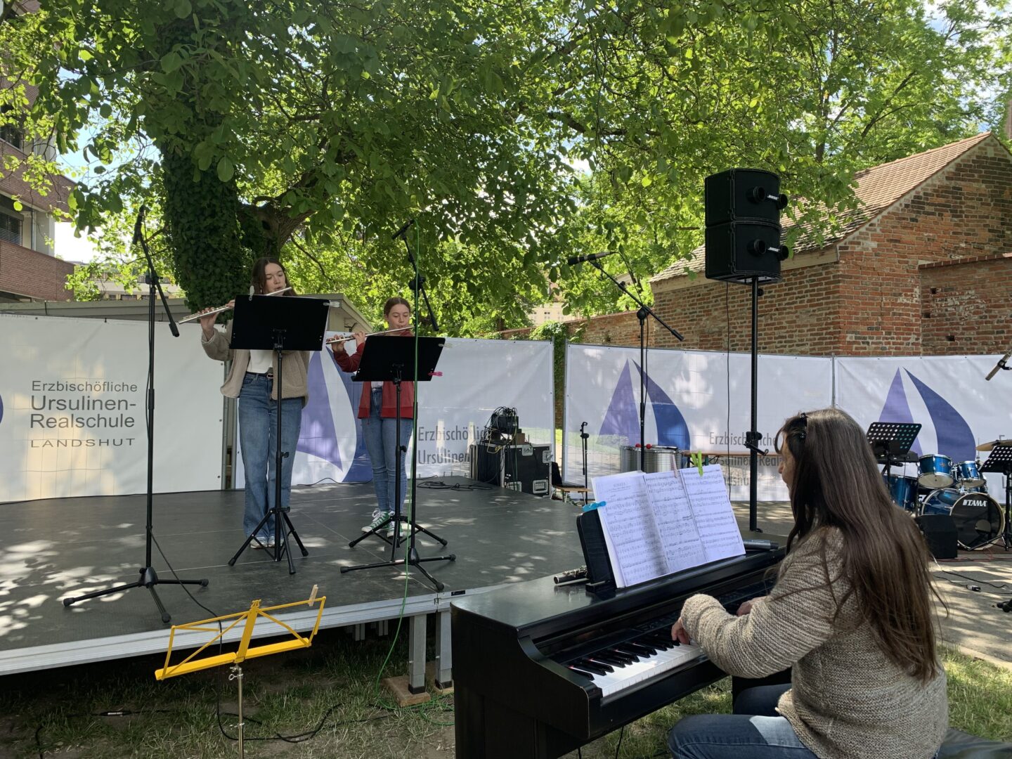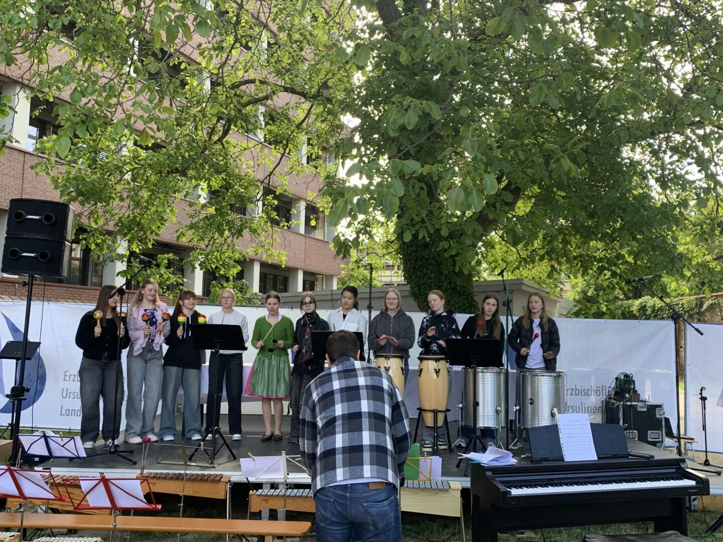 Bei strahlendem Sonnenschein und angenehm sommerlichen Temperaturen verwandelte sich das Freigelände der Ursulinen-Realschule am vergangenen Samstagvormittag in eine klingende Bühne. Der traditionellemusikalische Frühschoppenlockte zahlreiche Besucher an, darunter viele Familien, aber auch etliche ehemalige Schülerinnen und Lehrkräfte, die die Gelegenheit für ein Wiedersehen und ein Schwelgen in musikalischen Erinnerungen nutzten.Die musikalische Vielfalt, die an der Ursulinen-Realschule gepflegt wird, spiegelte sich eindrucksvoll im Programm wider: Den rhythmischen Auftakt machten die jungen Talente der Percussion-Gruppen unter Leitung von Matthias Scholz: Die Klasse 5a begeisterte mit dem „Cup Song“, die Klasse 6a ließ die bunten „Boomwhacker“ erklingen und das Wahlfach Percussion präsentierte eine gekonnte „Cup Song 2.0“-Version, bei der die Mädchen mit so hoher Konzentration und rhythmischer Präzision zu Werke gingen, dass dem Publikum beim Zuschauen fast schwindlig wurde.Das Querflöten-Ensemble unter Helga Hartl entführte das Publikum mit „Tiritomba“ in südliche Gefilde, während die Klasse 5a mit ihrem Tanz zu „Es tönen die Lieder“ den Frühling auch bewegt feierte. Passend zur Jahreszeit sang die Chor-Klasse 5b unter Matthias Scholz erwartungsvoll „Wenn der Sommer kommt“. Einen farbenfrohen und nachdenklichen Akzent setzte die Theater-Gruppe 5a (Leitung: Veronika Strejc) mit „Die Reise der Farben“. In einer fantasievollen Choreographie mit bunten Tüchern stritten die Farben, wer denn nun die schönste sei, um sich schließlich versöhnlich in den Armen zu liegen – getreu dem Motto „Es ist besser mit dir“. Anschaulich wurde es bei der Theatergruppe der 5b, die ihre Darbietung „Der magische Regenschirm“, untermalt von Musik und sanften Regengeräuschen, präsentierte.Solistische Glanzlichter setzten Franziska Duller aus der 5a, Tiziana Ganslmayer (10c) an der Klarinette mit „House of the rising sun“ und Ines Goldner (6a), die mit ihrem „Little Waltz“ zarte Harfenklänge in den Vormittag webte. Leonie Els (10e) zauberte am Klavier mit Ludovico Einaudis „Nuvole bianche“ eine fast meditative Stimmung – passend zu den weißen Wolken am blauen Himmel.Die Klasse 6b unter Leitung von Dagmar Kratzer hatte mit „Hit the road, Jack“ eine klare Botschaft parat, die die Lehrerin den Mädchen ans Herz legte: „Wenn’s nicht mehr passt, soll er lieber gehen.“ Die Klasse 6c bekannte daraufhin charmant: „Alles nur geklaut“. Für romantische Töne sorgte die Schulband (Leitung Alexander Hollmayer) unter anderem mit dem Klassiker „I can’t help falling in love with you“.Ein zauberhafter Klang entstand, als Clémence Astruc (8c) an der Geige und Charlotte Weber (7d) an der Tuba gemeinsam „Hedwig’s Theme“ aus Harry Potter erklingen ließen. Schwungvoll ging es weiter mit dem „Tropical Fruit Market“, dargeboten von den Klassen 5a,b,c, und dem Bläserensemble, das mit „Supercalifragilisticexpialidocious“ bewies, dass auch musikalische Zungenbrecher gute Laune machen. Die Schulband der Jahrgangsstufen 5 bis 7 begeisterte alle Italo-Hit-Fans, zu denen sich der Verfasser dieses Artikels ausdrücklich zählt, mit „Sarà perché ti amo“ von Ricchi e Poveri und sorgte zwei Wochen vor den Pfingstferien für Urlaubsstimmung.Als die Klasse 6a dann zum Tanz „Jerusalema“ aufforderte, ließen sich einige im Publikum nicht lange bitten und ahmten die Schritte nach. Einen zünftigen Akzent setzten die Lehrerinnen Dagmar Kratzer (Akkordeon) und Katharina Timmer (Tuba) mit „zwoa bayrische Stückl“.Dank des engagierten Elternbeirats blieb bei Kaffee, Kuchen und erfrischenden Getränken niemand hungrig oder durstig.