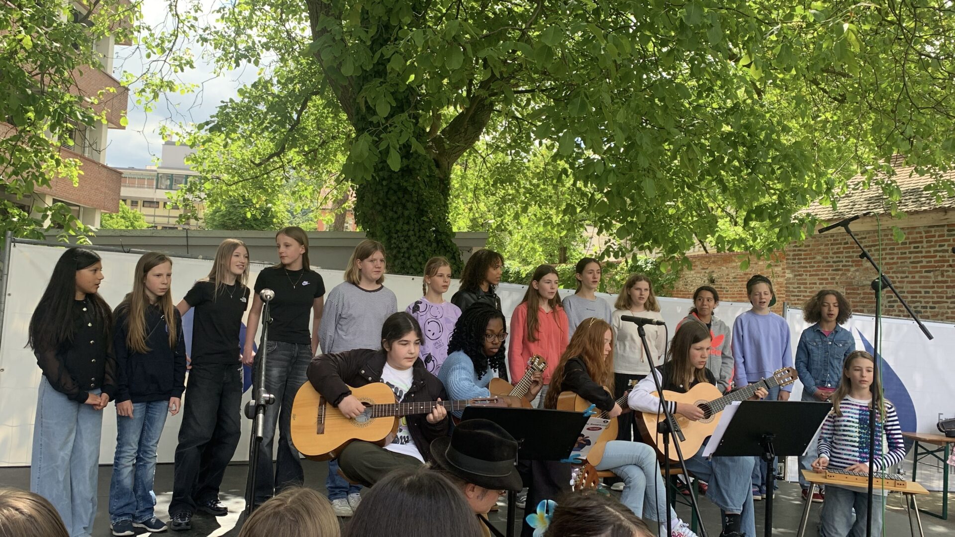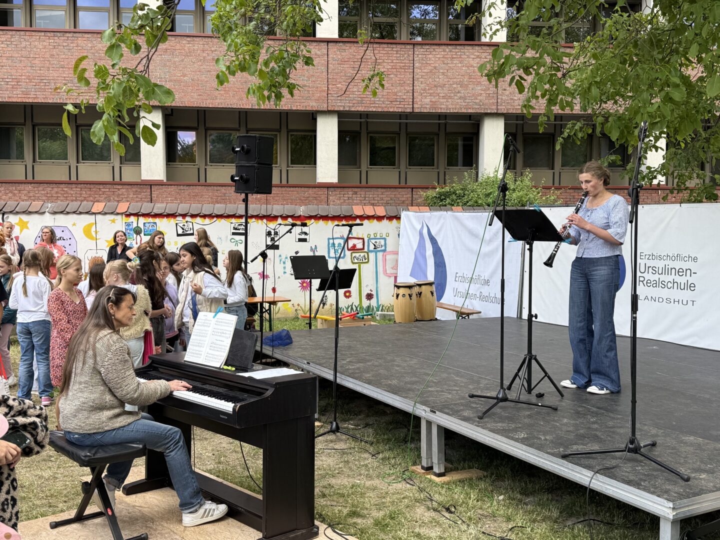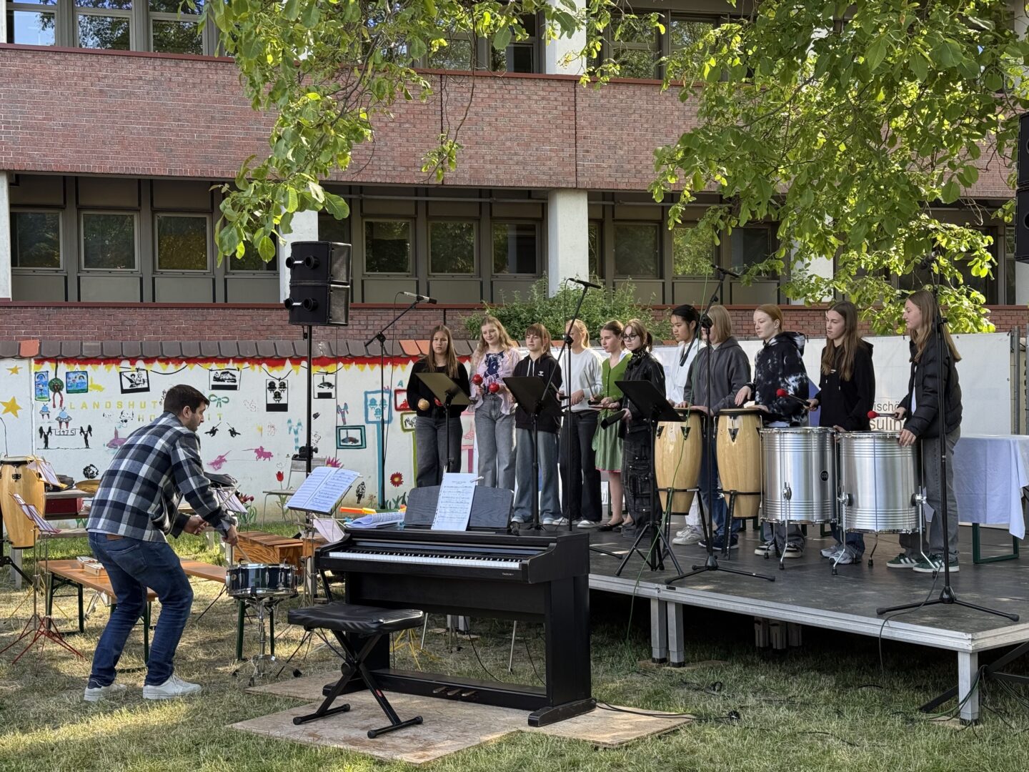 Solistische Glanzlichter setzten Franziska Duller aus der 5a, Tiziana Ganslmayer (10c) an der Klarinette mit „House of the rising sun“ und Ines Goldner (6a), die mit ihrem „Little Waltz“ zarte Harfenklänge in den Vormittag webte. Leonie Els (10e) zauberte am Klavier mit Ludovico Einaudis „Nuvole bianche“ eine fast meditative Stimmung – passend zu den weißen Wolken am blauen Himmel.